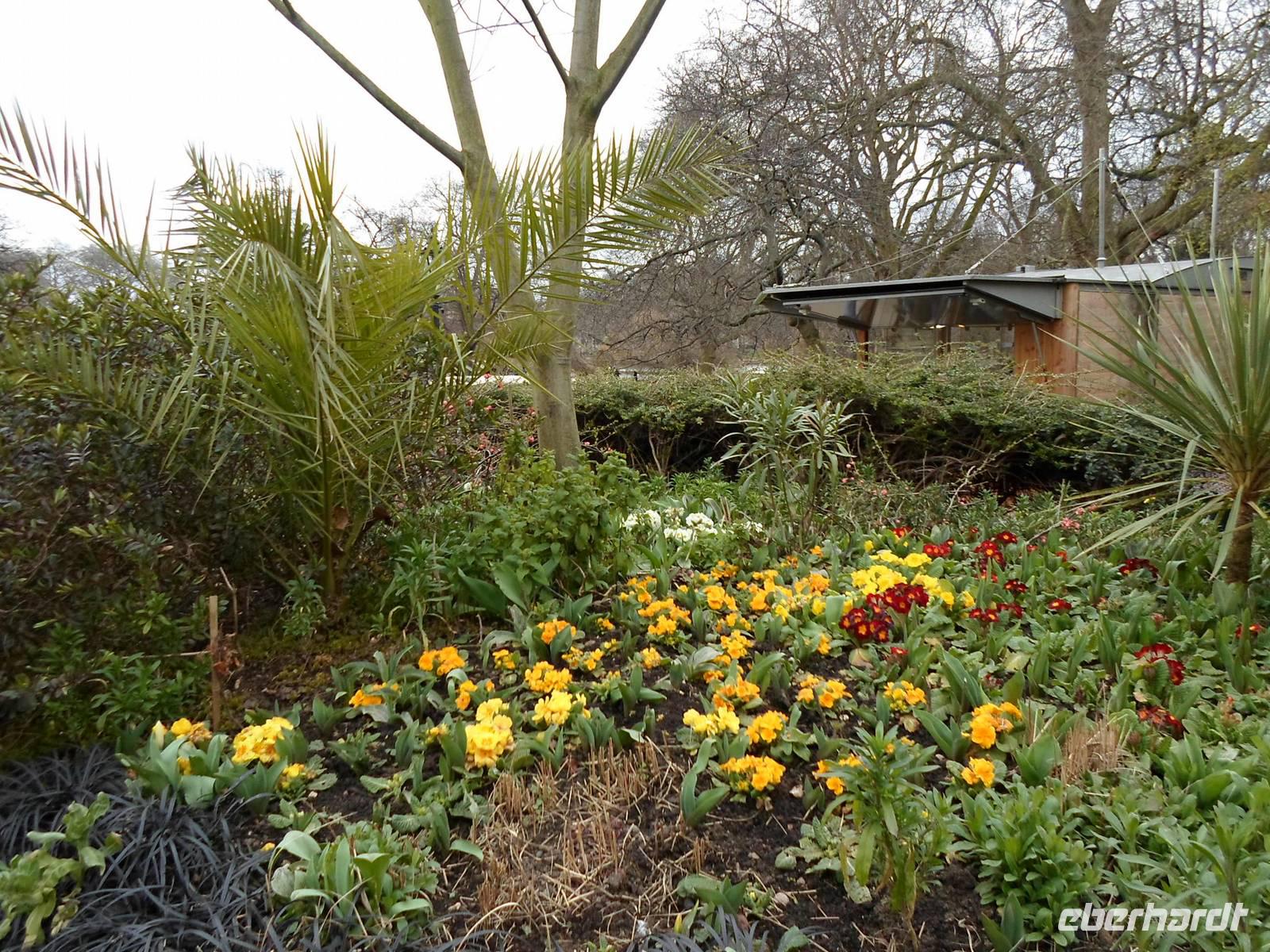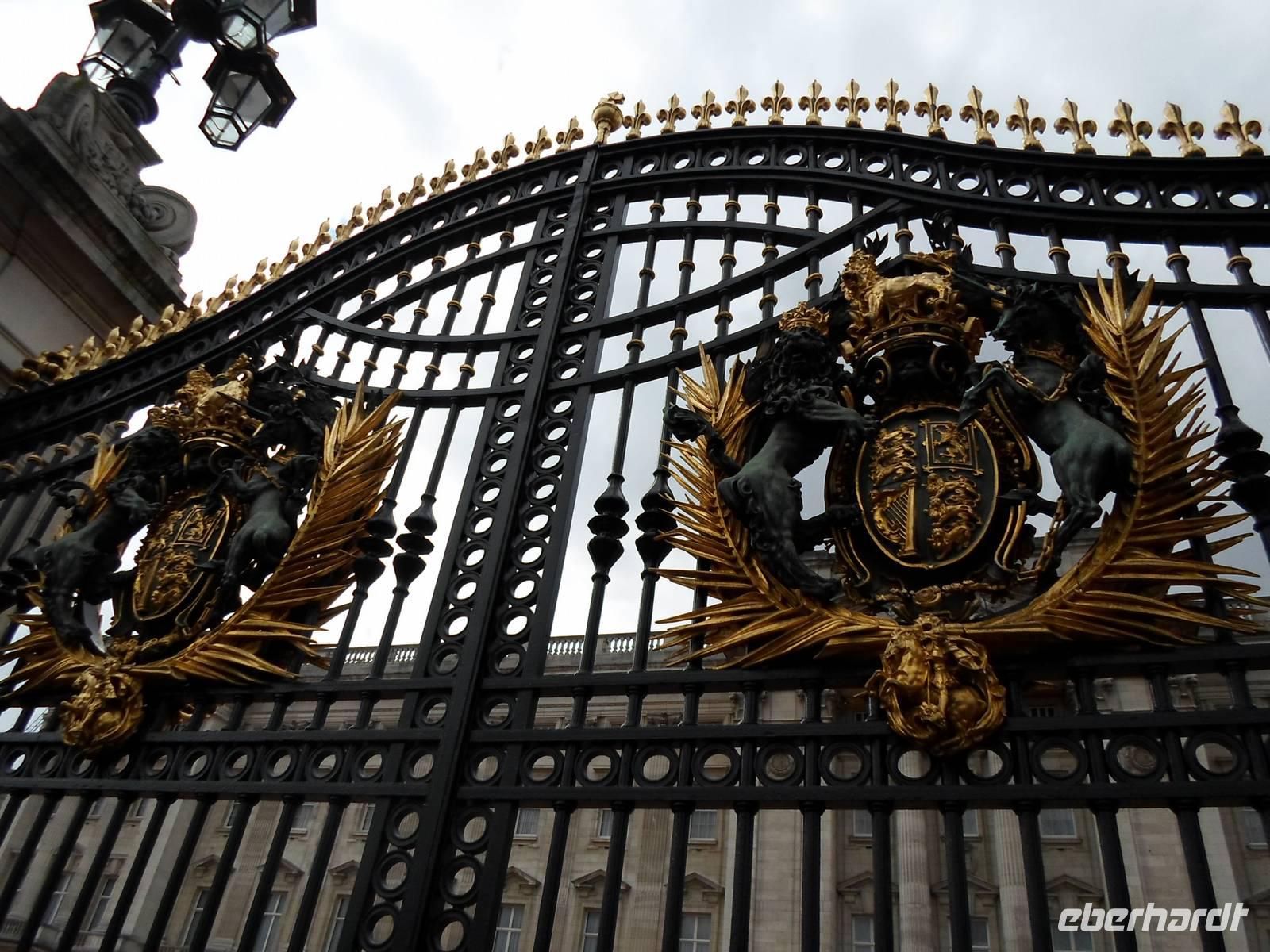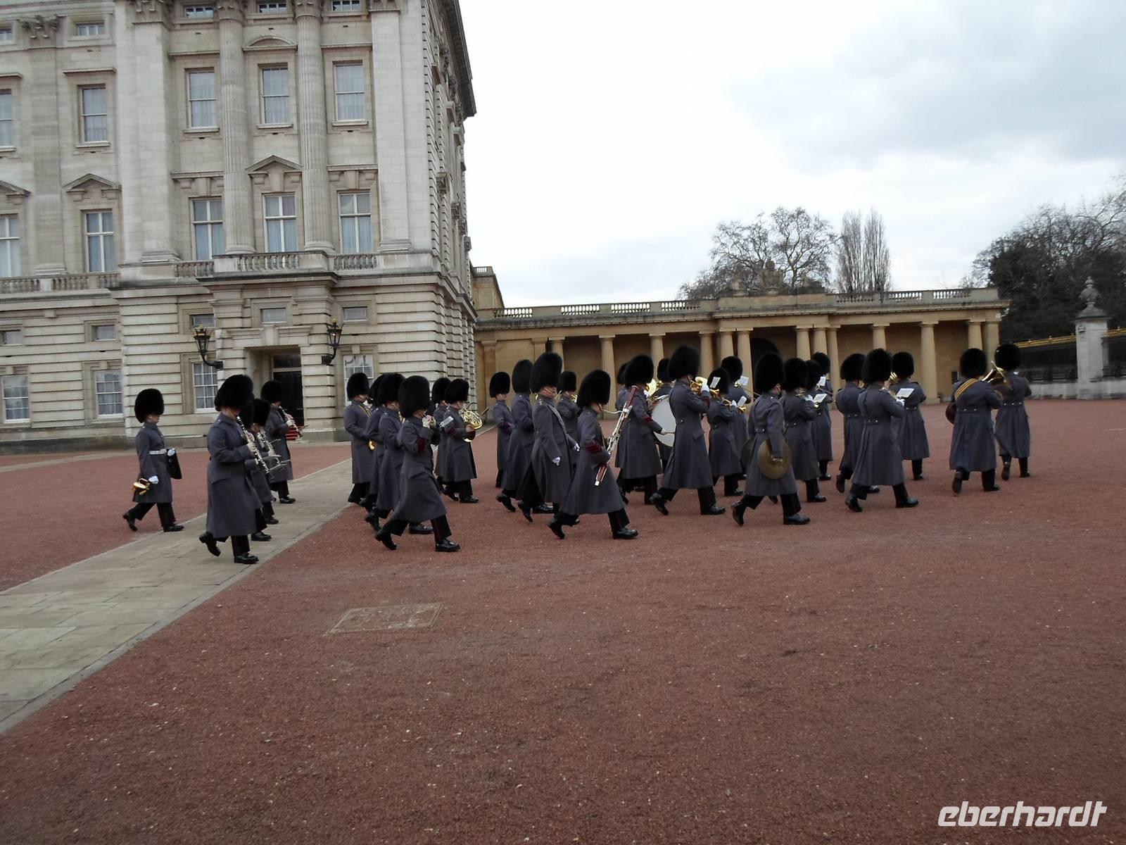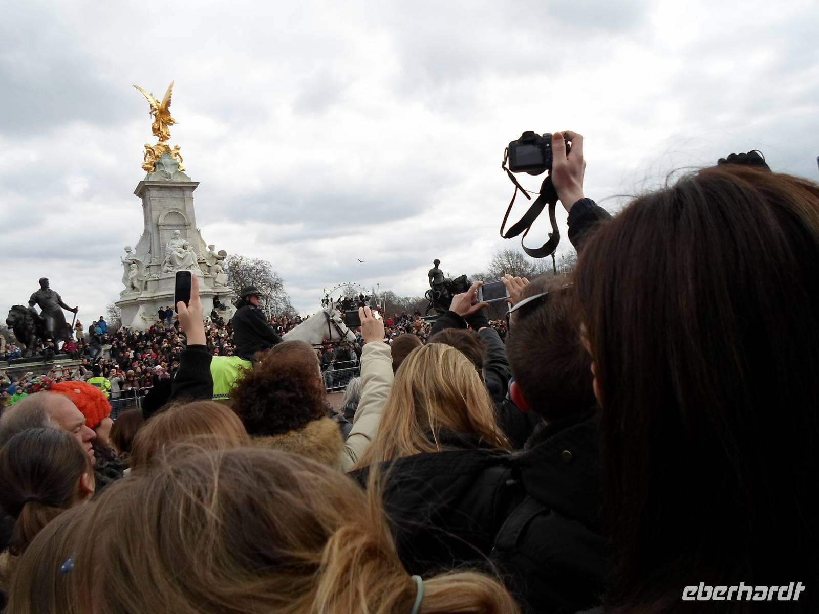 Heute warten wir umsonst auf die Sprechen. Sicherlich ist die Kälte schuld, dass so zeitig noch niemand zu sehen ist. Also laufen wir durch den Hyde Park zum Hyde Park Corner und dann weiter entlang der Begrenzungsmauer des Buckingham Palastes, um die Wachablösung davor zu erleben.