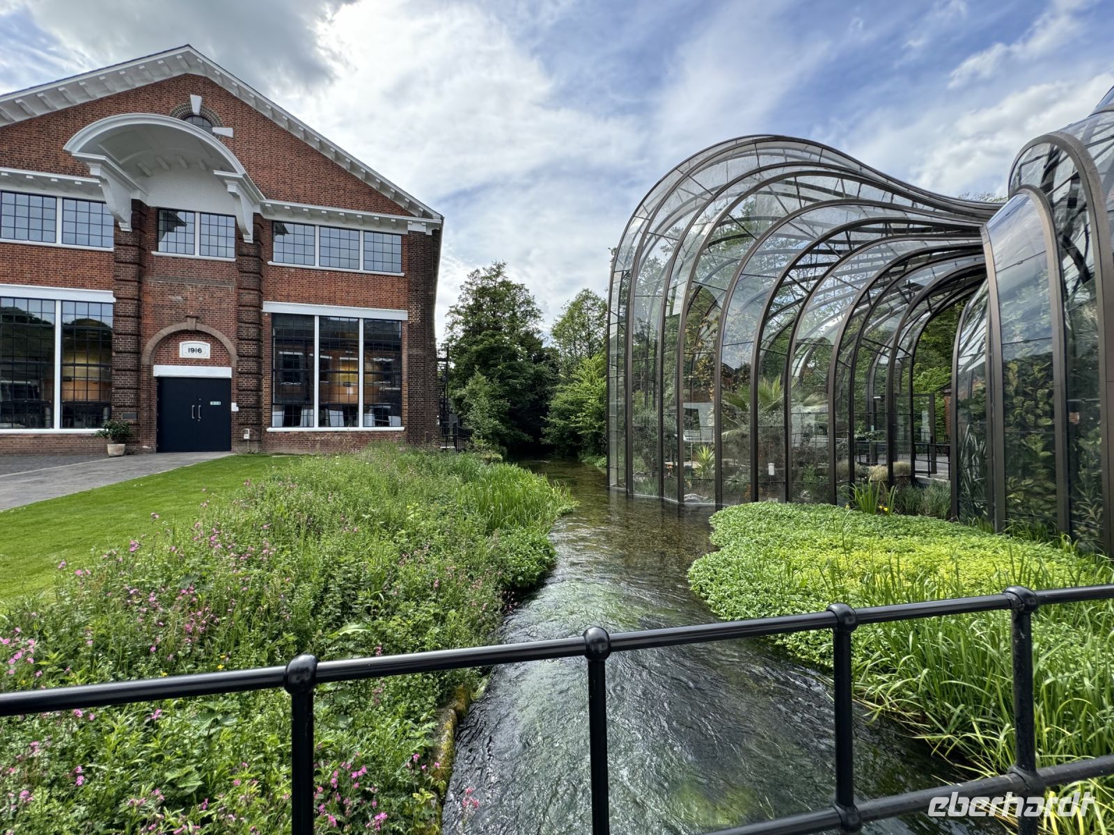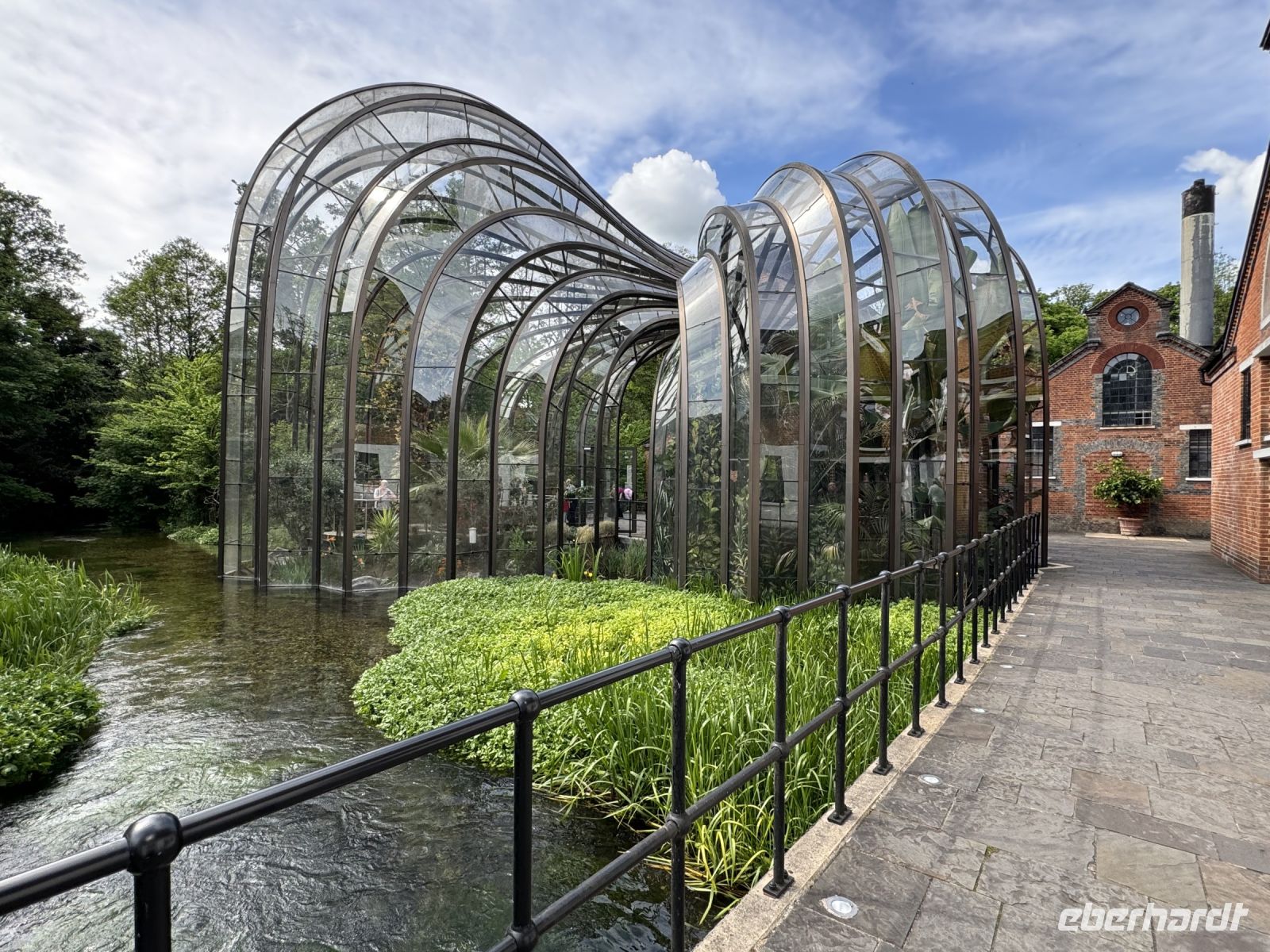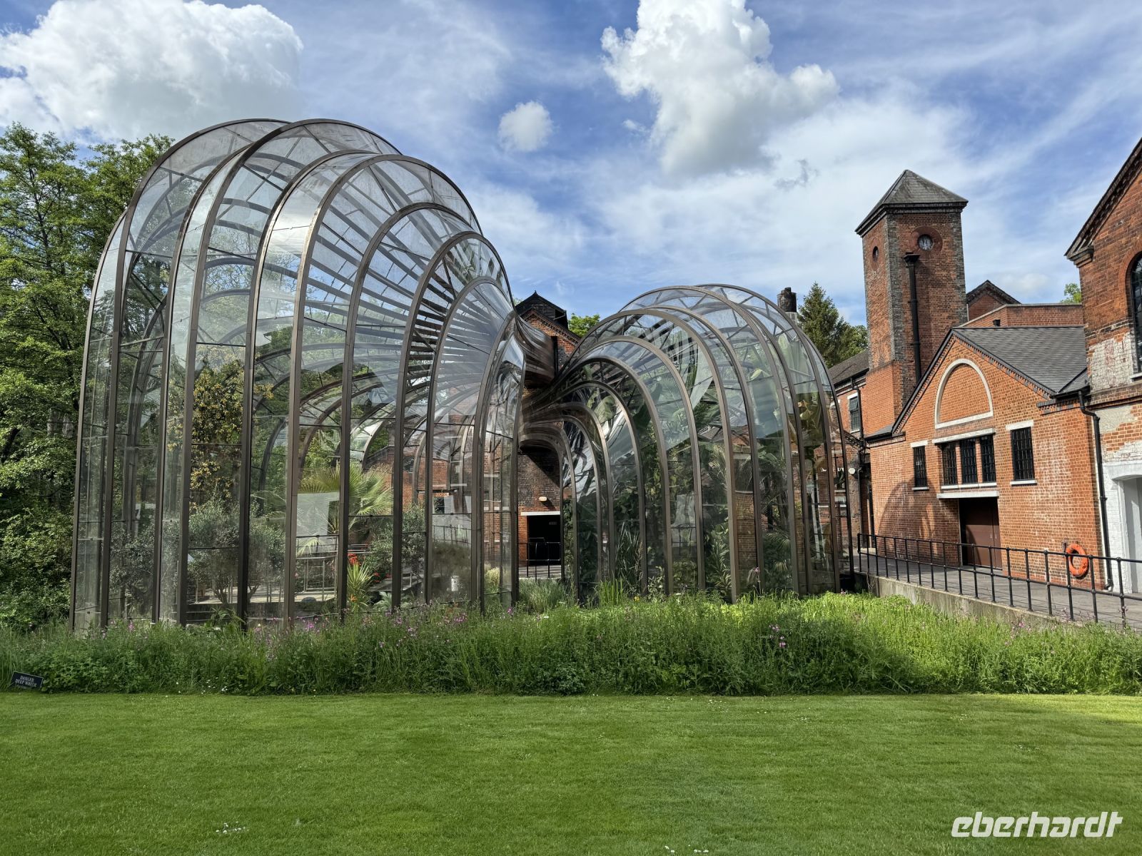 Wir sehen die riesige Pflanzen in einem imposanten, von Thomas Heatherwick, einem renommierten Londoner Architekten, eigens entworfenen Glashaus.