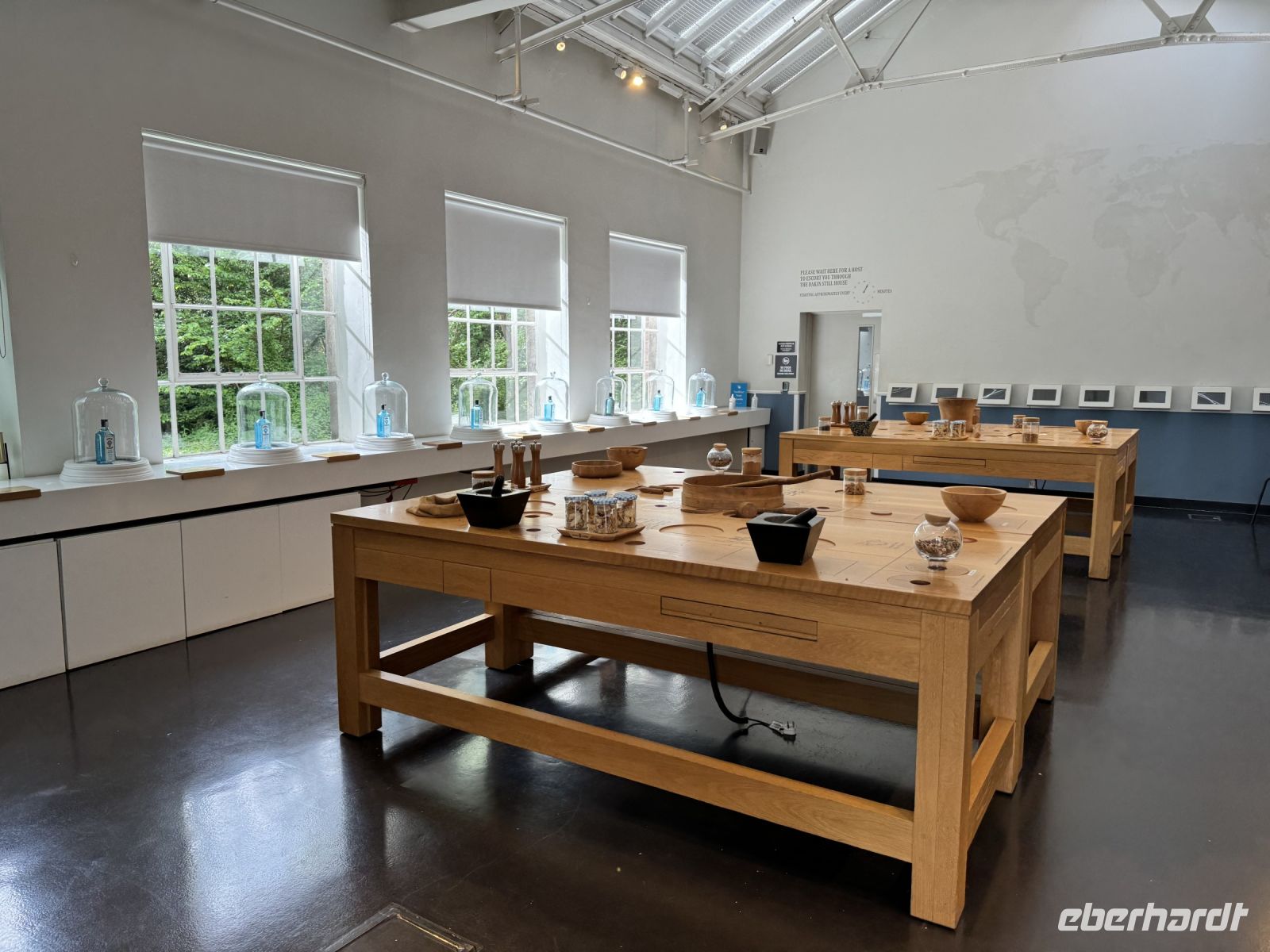 Wir betreten einen sehr schönen Schauraum und dürfen nun riechen, sehen und tasten was die die Pflanzenwelt für den Gin hergibt. Um uns ins Innere zu bewegen legen wir unser Mobiltelefone ab und folgen den speziellen Erklärungen Produktion.