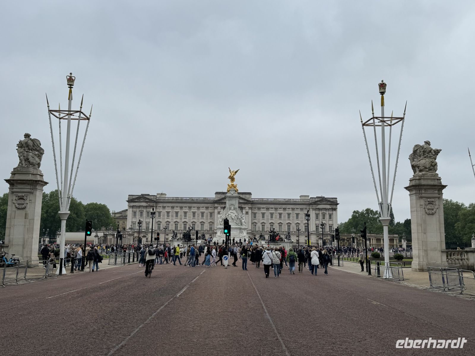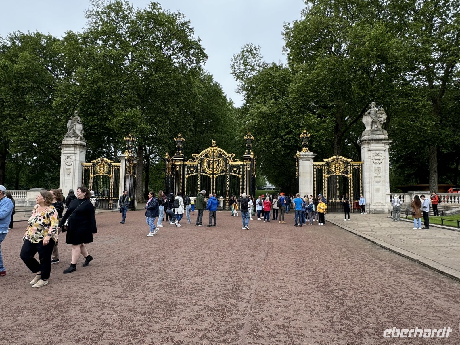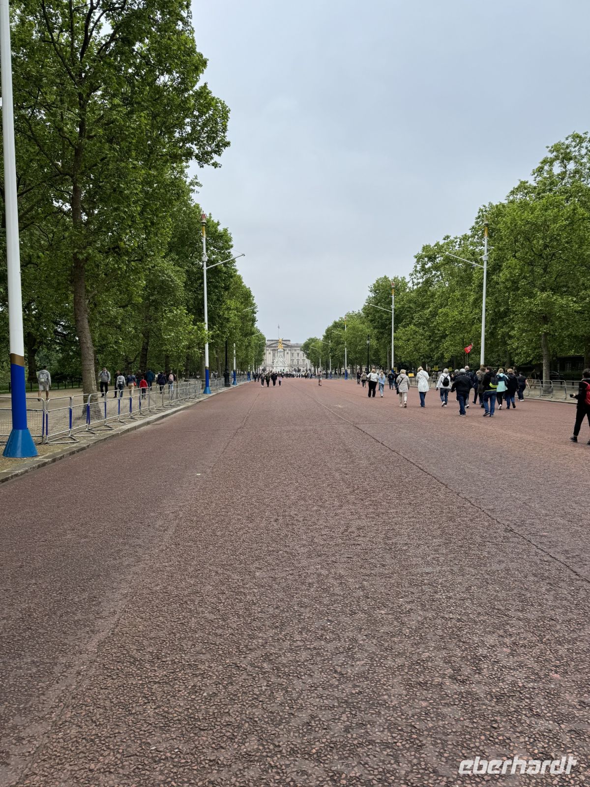 Aber natürlich geht es nicht nur mit dem Bus durch die Stadt, nein wir steigen immer wieder mal aus und gehen zu Fuss. Da geht's entlang der Mall, dieser riesigen Prachtstraße in Richtung Buckingham Palace. Die Mall, die seit den 50er Jahren mit roten gefärbten Asphalt belegt ist, wirkt wie ein riesiger roter Teppich. Wir fotografieren was die Geräte hergeben und unsere Köpfe können die Zahlen fast nicht mehr aufnehmen. Spannend ist es!