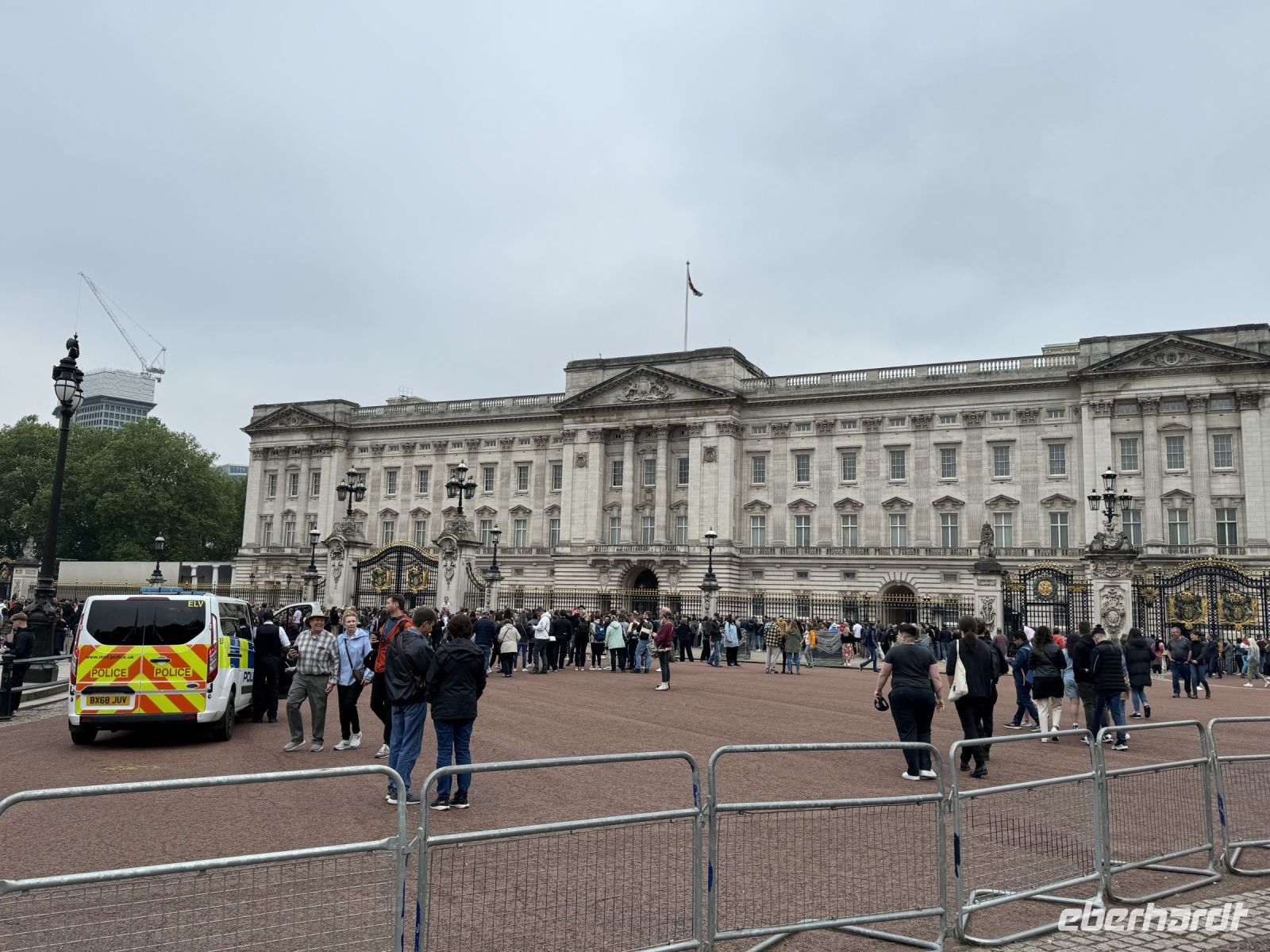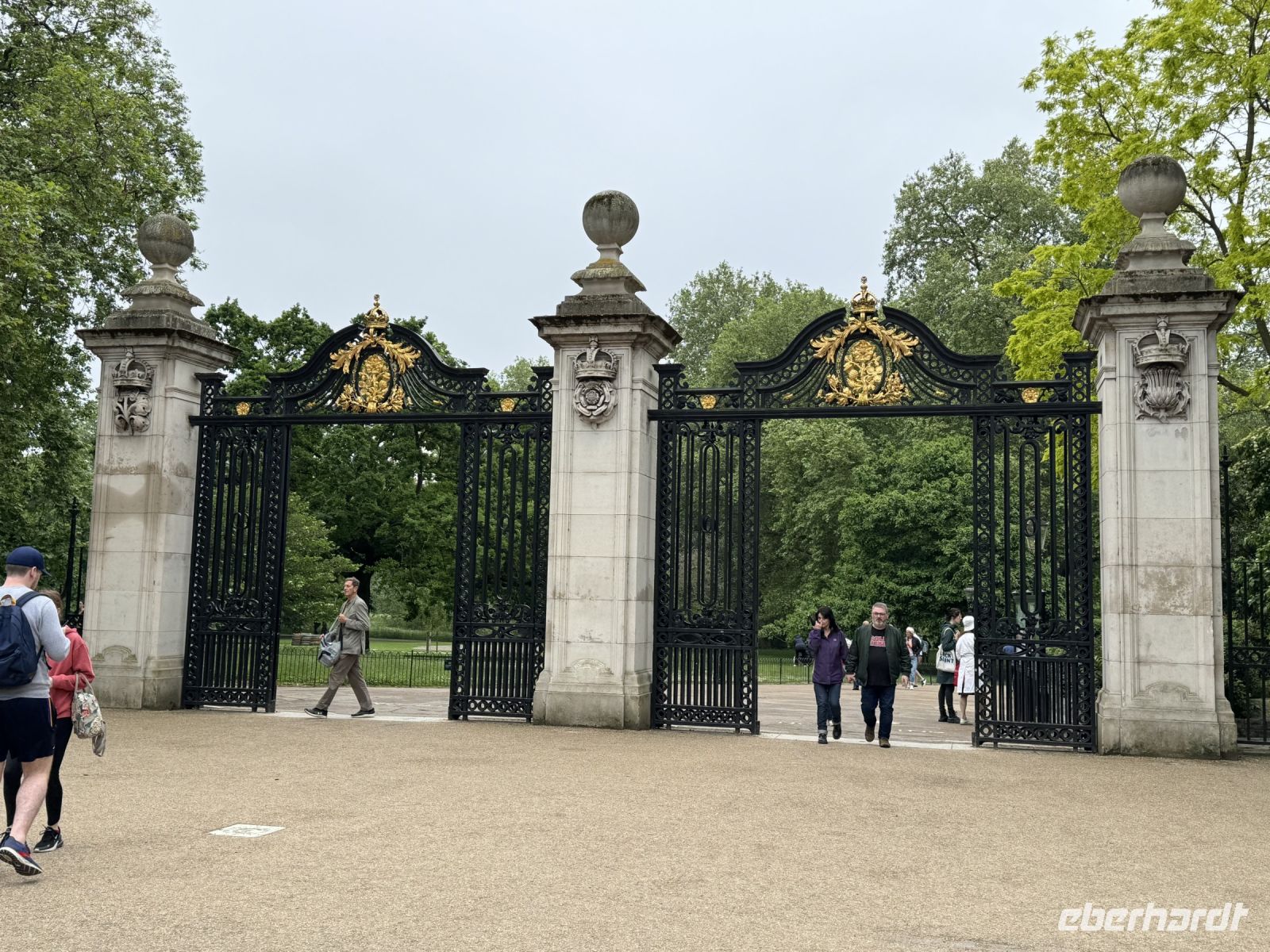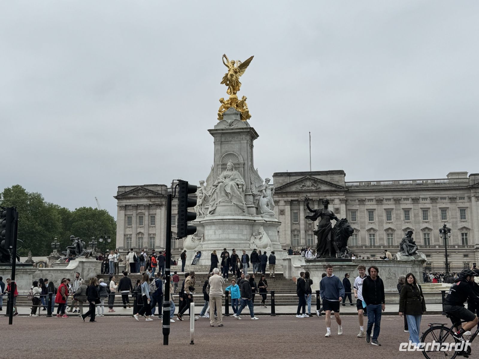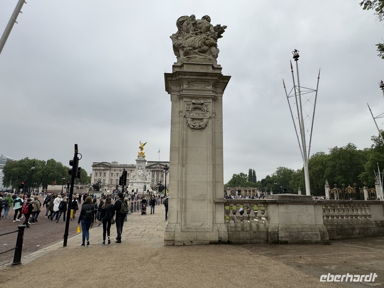 Aber natürlich geht es nicht nur mit dem Bus durch die Stadt, nein wir steigen immer wieder mal aus und gehen zu Fuss. Da geht's entlang der Mall, dieser riesigen Prachtstraße in Richtung Buckingham Palace. Die Mall, die seit den 50er Jahren mit roten gefärbten Asphalt belegt ist, wirkt wie ein riesiger roter Teppich. Wir fotografieren was die Geräte hergeben und unsere Köpfe können die Zahlen fast nicht mehr aufnehmen. Spannend ist es!