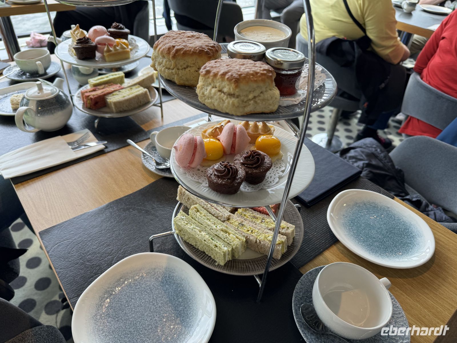 Sofort beginnt die Gastronomie. Alles ist bestens vorbereitet. Jeder Tisch erhält eine Art Etagere mit Leckereien. Angefangen von kleinen verschiedenen Sandwiches jeglicher Geschmacksrichtung, über Brownies, Macerons und natürlich den typisch britischen Scones mit whipped Cream, einer Art Schlagsahne und Konfitüre. Tee und Kaffee soviel man möchte.