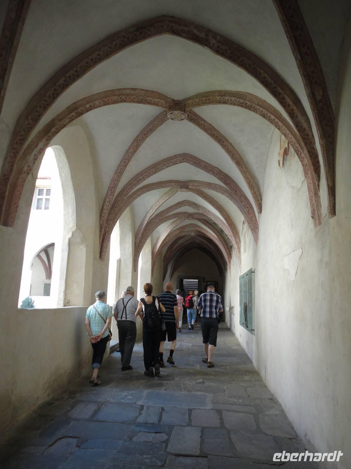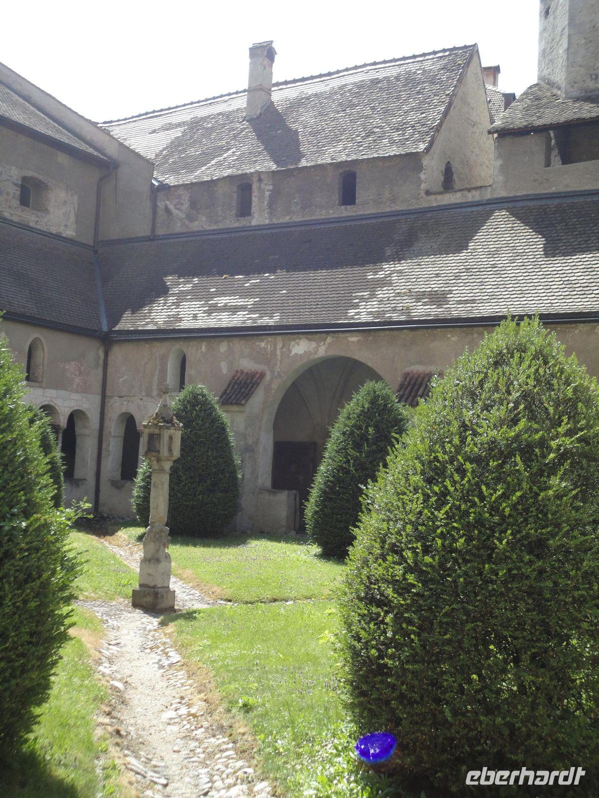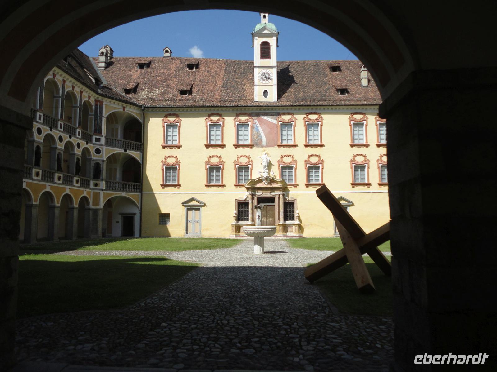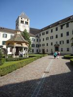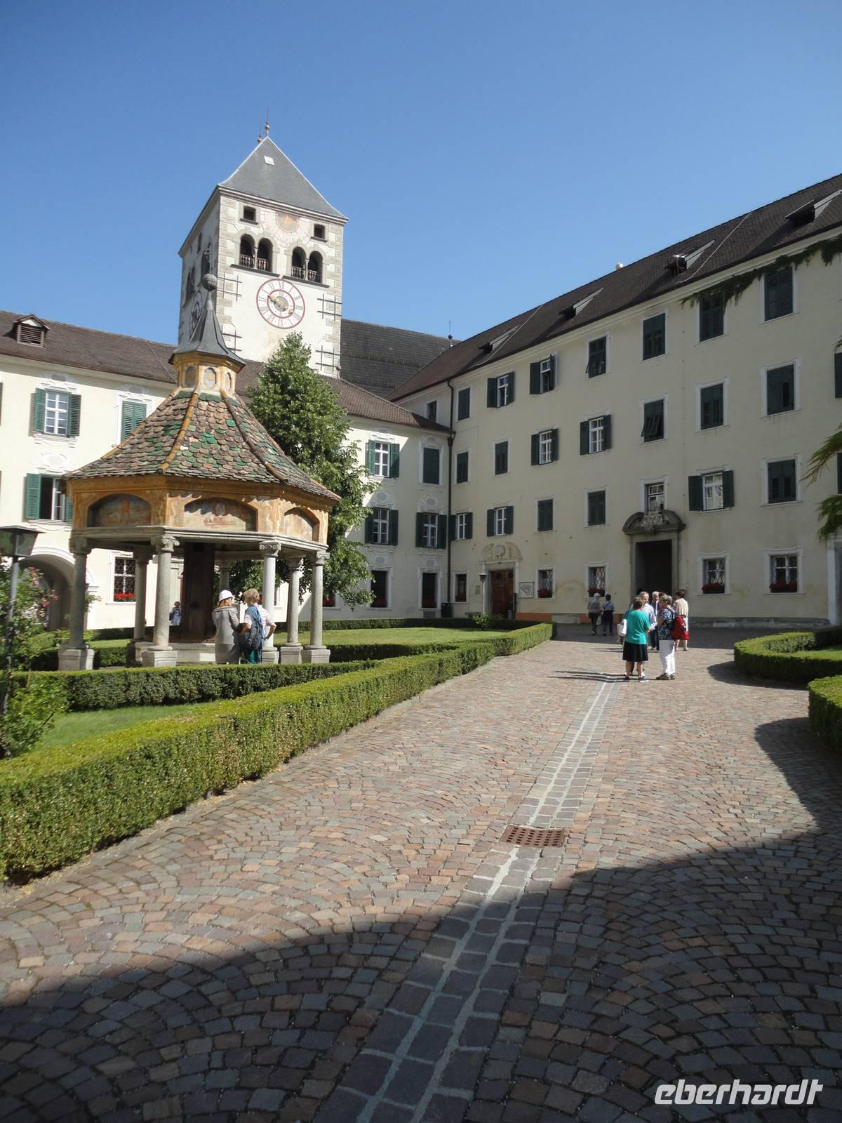 Unseren 2. Urlaubstag begannen wir entspannt gegen halb 8 beim Frühstück. Die Auswahl war erneut überwältigend, für manch einen zu viel am Morgen - wo das Köpfl noch ein wenig schläft. Aber nachdem wir auch unseren geliebten Kaffee oder Tee auf den Tischen erblickt hatten, stärkten wir uns mit den tollsten Leckerbissen. Vor allem das frische Obst bot einen herrlichen Anblick und hat genau so lecker geschmeckt, wie es aussah. Nachdem Johanna und Sieglinde - unsere örtlichen Reiseleiterinnen - gut und munter in Bruneck angekommen sind, machten wir uns voller Vorfreude auf den heutigen Tag gegen 09:00 Uhr Richtung Brixen auf. Unterwegs legten wir unseren ersten Stopp am Kloster Neustift ein. Die herrliche Landschaft, der reißende Eisack und die wunderschöne Freskenmalerei des Klosters stimmten uns prima ein auf die kommenden Tage. Zwischen 11:00 und 13:00 Uhr zeigte uns Johanna die herrliche Stadt Brixen. Auch hier beeindruckten uns wieder die wunderschönen Fresken, die Architektur und gemütliche Bauweise im Tirol. Das bombastische Wetter und das leckere tiroler Schmauserl war das i-Tüpfelchen auf einem gelungenen Vormittag. Nach der kurzen Weiterfahrt nach Mühlbach und einer kleinen „Zwangspause" für die Wanderer - da wir Radfahrer ja unsere Räder aus dem Eberhardt-Anhänger entladen mussten - starteten wir fröhlich in unsere Radtour. Man muss schon zugeben, einige Meter haben uns ganz schön gefordert, aber wir haben uns nicht immer vom steilen Anstieg überwältigen lassen.
