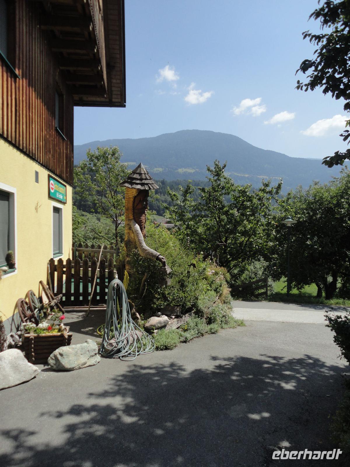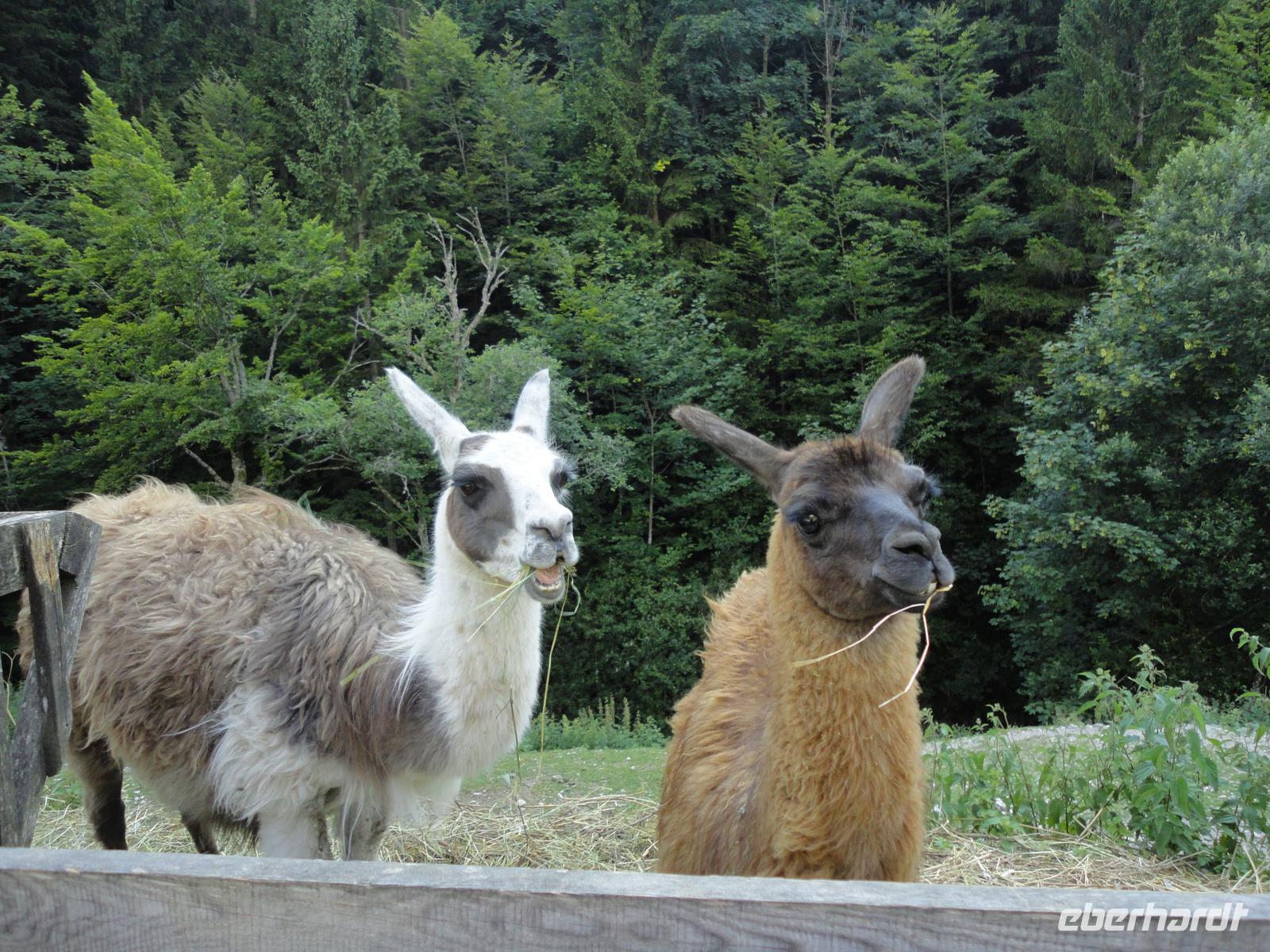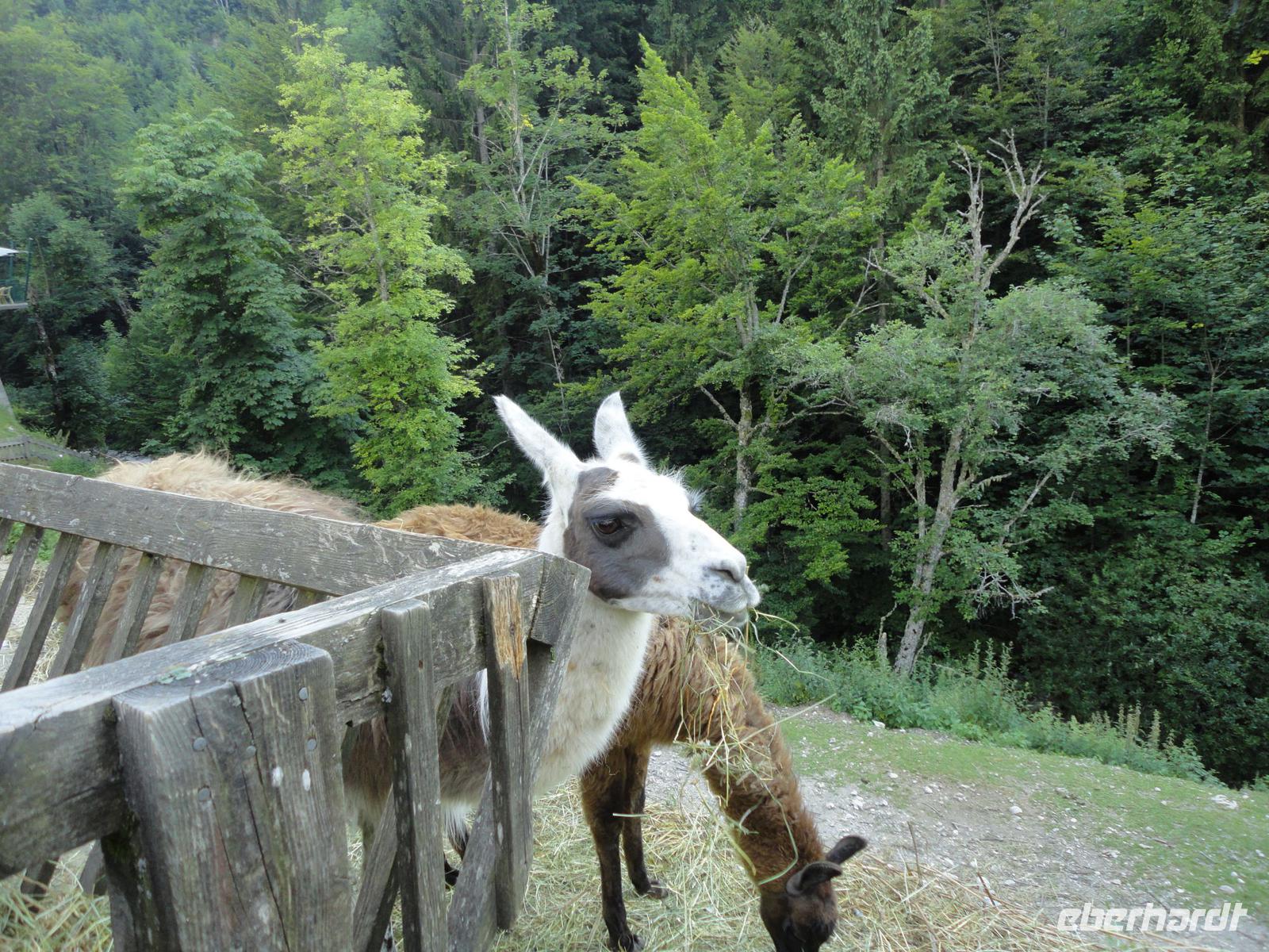 Kurz bevor uns der letzte Bus 18:10 Uhr zurückbringen sollte, boten uns kleine Zicklein und gefräßige Lamas noch witzige Augenblicke und kurze Schreckensmomente. Glücklicherweise wurden wir nicht bespuckt, obwohl wir uns sicher waren, dass eines der beiden Lamas genau dies im Sinn hatte. Der geübte Busfahrer brachte uns sicher durch die Serpentinen zum Parkplatz, wo wir freudig unseren Lutz erwarteten. Wenige Minuten später saßen wir bereits auf der Terrasse der Pension und erwarteten hungrig das Abendessen. Die Reste des üppigen Abendessens ließen wir uns für den morgigen Tag verpacken. Bei Rückblicken und lustigen Gesprächen ließen wir unseren schönen 6. Urlaubstag zufrieden ausklingen und begaben uns in unser Nachtstübl in der Pension Ratz im schönen Kirschentheuer.
