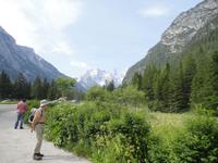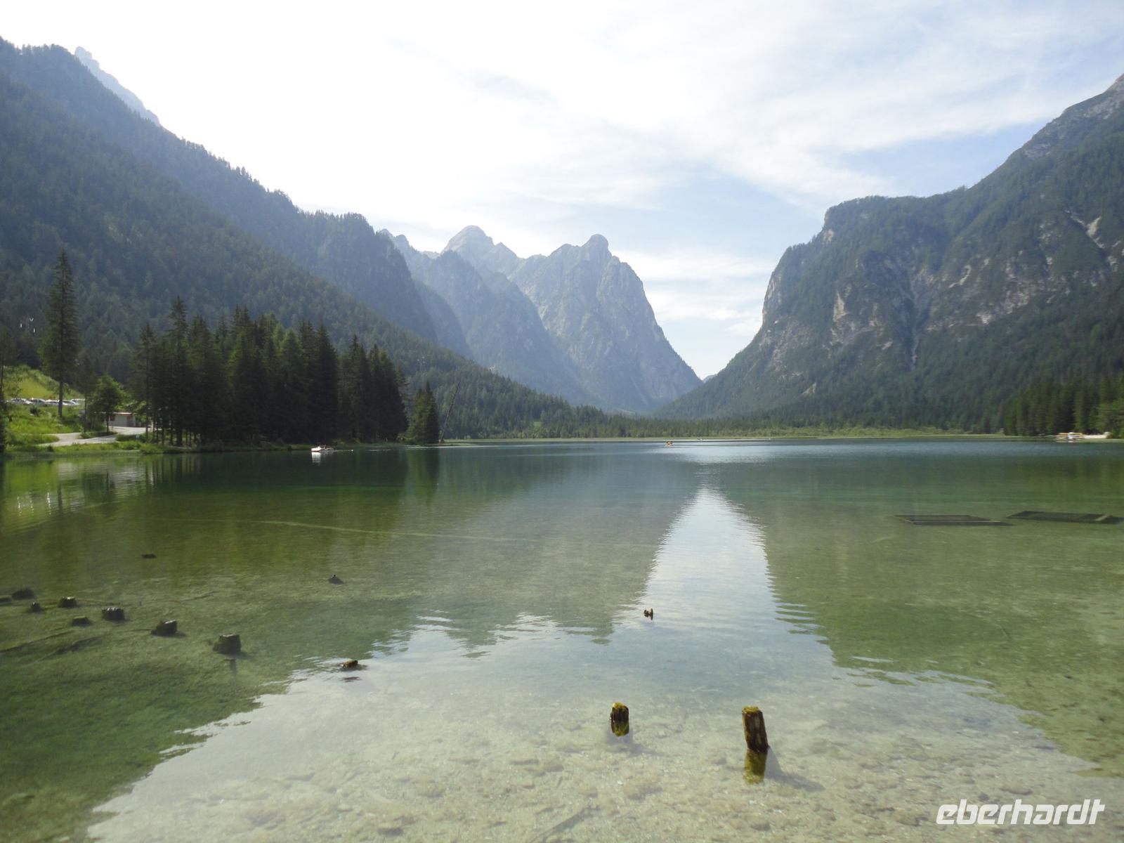 Auch den dritten Reisetag am Montag, den 15. Juli, starteten wir gestärkt durch das leckere und üppige Frühstück gegen 09:00 Uhr mit einer Busfahrt zum „Drei-Zinnen-Blick", welche wir nach einer knappen dreiviertel Stunde erreichten. Dort oben in etwa 1200 Meter Höhe fröstelte es uns ein wenig nach den letzten beiden so warmen Tagen. Aber die Landschaft und Atmosphäre waren wunderbar, so dass wir unser erstes Gruppenfoto schossen. Danach gings schnustracks weiter zum Toblacher See, wo sich unsere beiden Gruppen für den heutigen Tag trennten. Wir entluden wieder mit Hilfe von Lutz und Jacob unsere Räder, prüften sie auf Standfestigkeit und radelten zum See runter. Dort genossen wir den Panoramablick und machten zahlreiche Fotos. Die kommende Strecke über Schotter war die erste kleine Herausforderung für den heutigen Tag - waren wir bisher doch von asphaltierten und gut ausgebauten Straßen verwöhnt. Aber als Radprofis haben wir uns natürlich in kürzester Zeit an den Boden unter uns gewöhnt, so dass wir in gewohnter fröhlicher Stimmung weiterziehen konnten. Den Mittag verbrachten wir individuell in Silian. Einige schlossen sich unseren beiden Reiseleiterinnen an und aßen einen Snack in einem der Cafés im Ort. Nach einer guten Stunde Pause ging es weiter mit den Räden entlang des schönen Drau-Radweges. 14:00 Uhr kamen wir an der Galitzenklamm an und bekamen eine Stunde Freizeit. Diese nutzen wir zur Erkundung der Klamm, zum Käffchen trinken und Wassertreten in der Drau. 15:00 Uhr ging es weiter Richtung Lienz. Einige Kilometer vor unserem Ziel erschracken wir durch ein lautes Knallen - uns ahnte nichts Gutes. Es war wie erwartet, der Schlauch und Mantel eines Rades war geplatzt. Nun hieß es für unsere Reisebegleiterin Ivonne gemeinsam mit Herrn Fritzsche auf zur Suche einer Werkstätte. Nach einigen Gehminuten wurden wir fündig und ließen das Rad in einer halben Stunde wieder auf Vordermann bringen. Anschließend radelten wir durchs unbekannte Lienz zu unserem wunderschönen Hotel Haidenhof mit dem atemberaubenden Panoramablick. Den Abend genossen wir auf der Panoramaterasse bei bestem Essen vom Buffet und Grill. Die lustige und etwas anzügliche Performanz über das typische österreichische Leben von Johannas Freund Christian rundete diesen sehr gelungenen Tag perfekt ab.