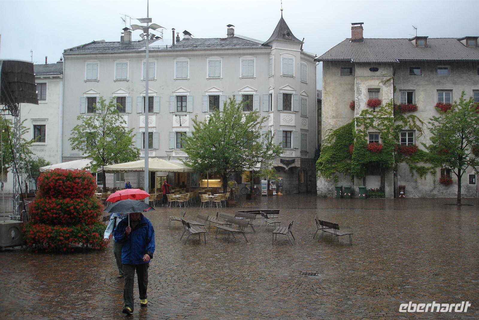 In Silian angekommen schien es leider, als hätte der Regen nur gewartet, bis wir Mittagspause machen würden. Sobald wir uns alle ein trockenes Plätzchen gesucht hatten, brachen wie auf Kommando im Himmel alle Dämme. Zum Glück „rettete“ uns unser Busfahrer vorm Radeln im Nassen und so legten wir den Rest der Strecke im Bus zurück. Kaum in Lienz angekommen, war uns Petrus wieder wohl gesonnen und so konnten wir wenigstens noch die schöne Altstadt und das bunte Markttreiben genießen.