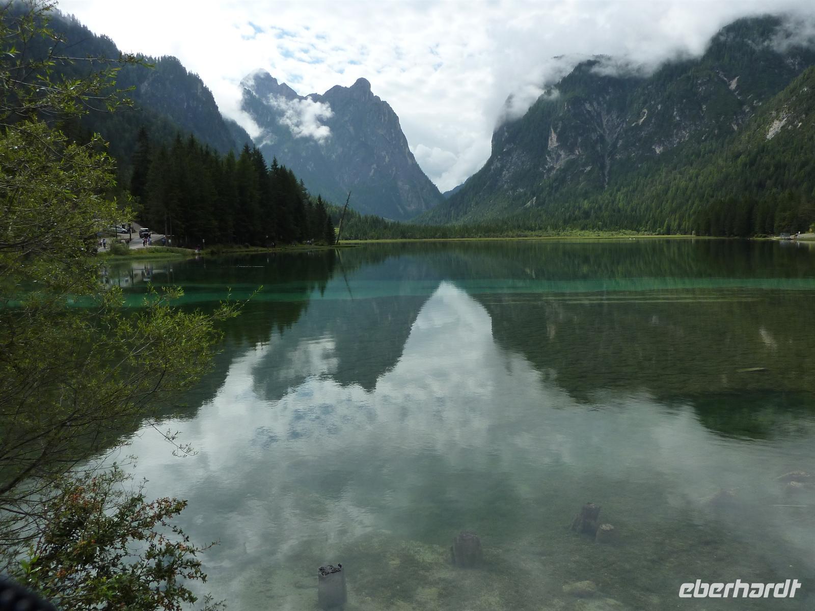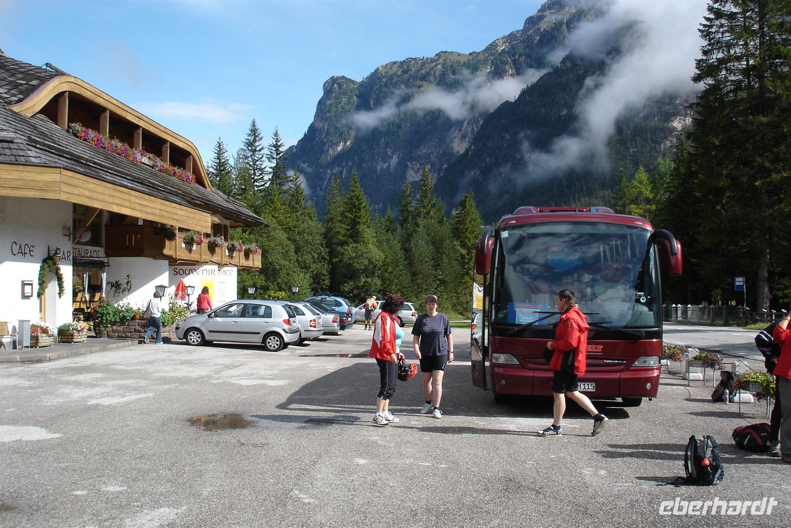 Nach einer regenreichen Nacht begann der zweite Tag fast so, wie der erste aufgehört hatte: Als uns unser Busfahrer Ingo am Ausblick „Drei Zinnen“ absetzte, riss, wie als hätten wir es bestellt, der Himmel auf. Natürlich freuten wir uns über die warmen Sonnenstrahlen und begannen somit doppelt gut gelaunt unsere zweite Radtour. Die erste Pause genossen wir am Toblacher See. Bei einer kleinen Süßigkeit plauderten die Gäste untereinander über ihre bisherigen und vielleicht zukünftigen Radreiseziele.