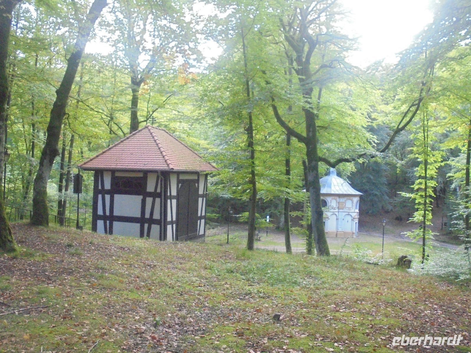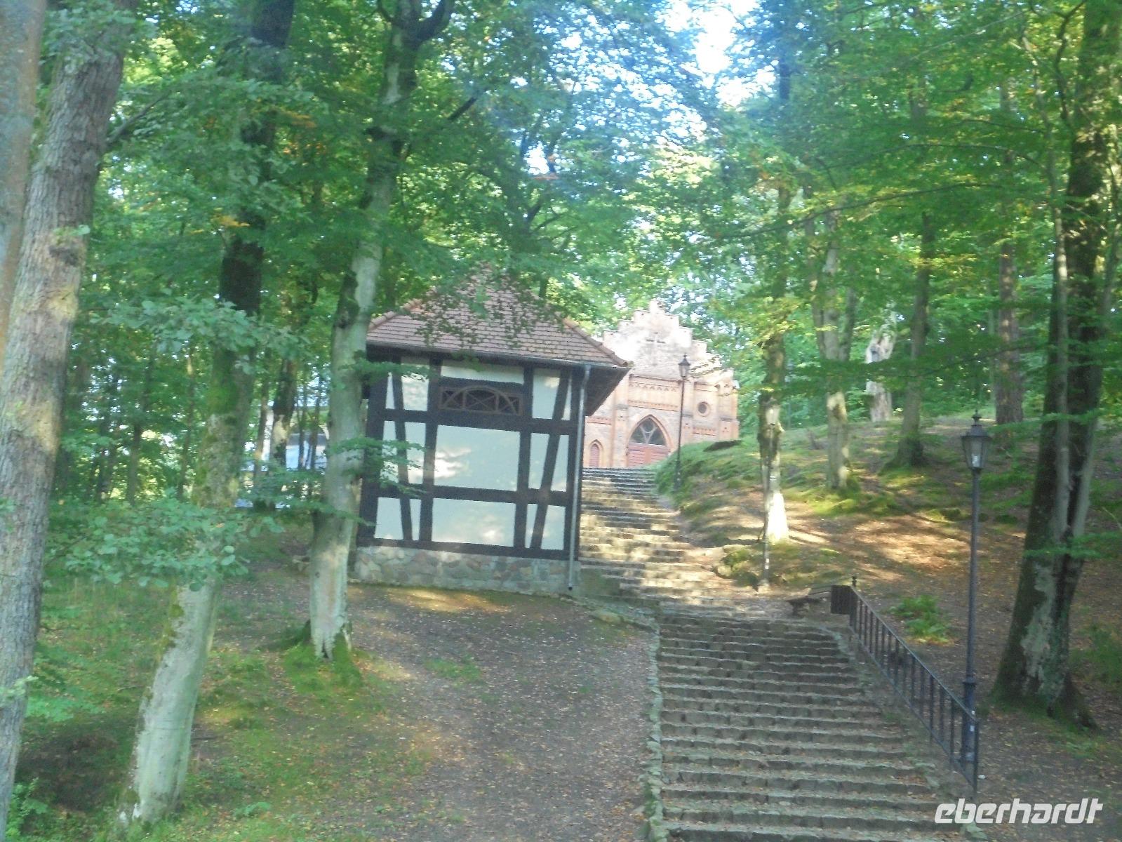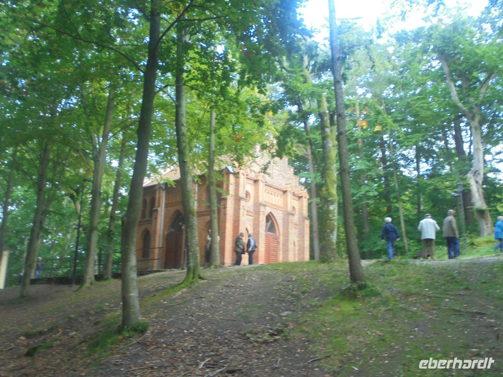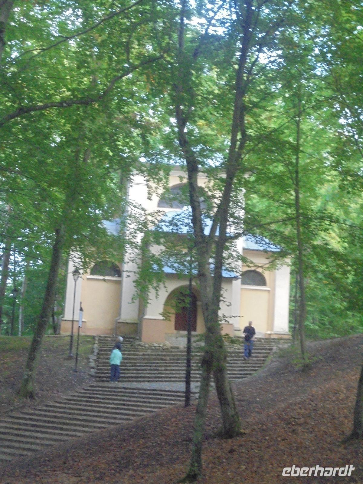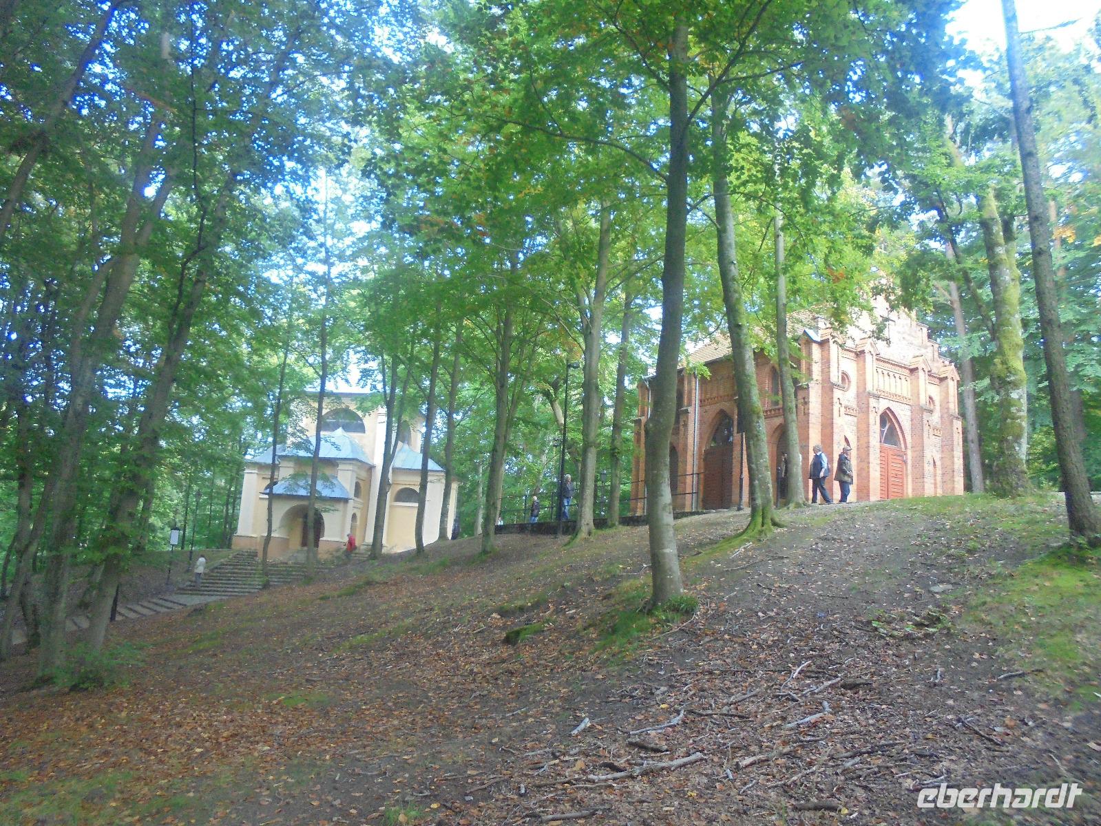 Hier liegt das nach seinem Gründer., dem Adeligen Jakob von Weiher Mitte des 17. Jh. gegründete Stadt Wejherowo. Der heute etwa 50.000 Einwohner zählenden Gemeinde, die bereits kurz nach ihrer Entstehung Stadtrecht erhielt, machte die Gründerfamilie ein wertvolles Geschenk: auf den Hügeln der Umgebung des Ortes ließen sie zahlreiche Kapellen in barockem Stil errichten, die zusammen einen der größten heute noch vorhandenen Kalvarienberge bilden. Insgesamt 26 teilweise sehr eindrucksvolle und mit barockem Architekturschmuck versehene, teilweise recht einfache kleine Gebetshäuser im Fachwerkstil stellen zusammen auf mehreren Kilometern den Leidensweg Christi und die Stationen seiner Kreuzigung nach. Im streng katholischen Polen ist dies eine Andachtsstätte der besonderen Art, in der jedes Jahr in der Fastenzeit mehrfach aufwendige Passionsspiele mit vielen Mitwirkenden stattfinden und ein Ort, der zu den bedeutendsten Wallfahrtsstätten des Landes zählt. Wir hatten Zeit für einen Bummel auf dem Waldweg, der die Kapellen zu einer Nachbildung des Christus-Kreuzigungsweges verbindet und konnten ein paar der Kapellen anschauen.