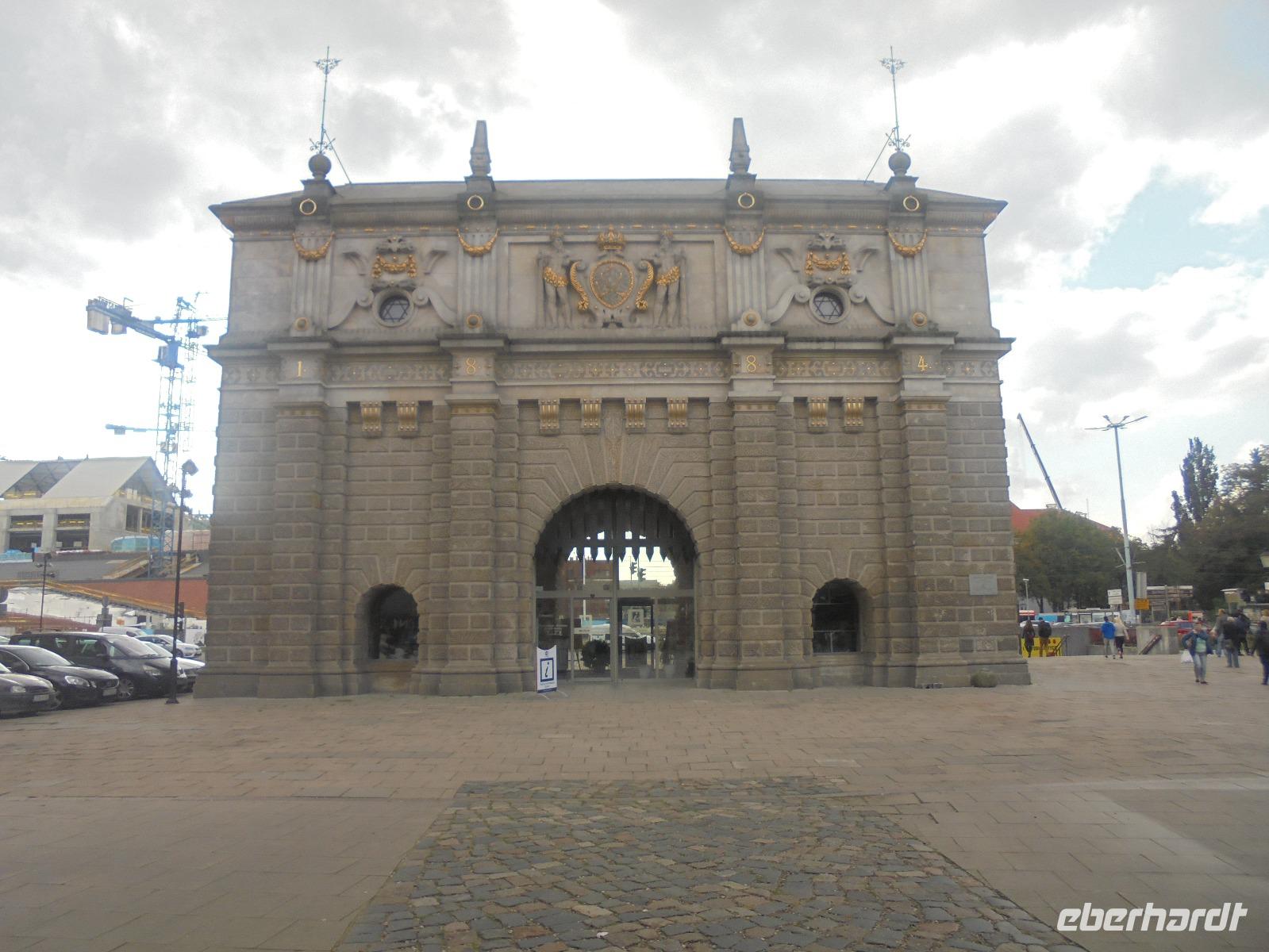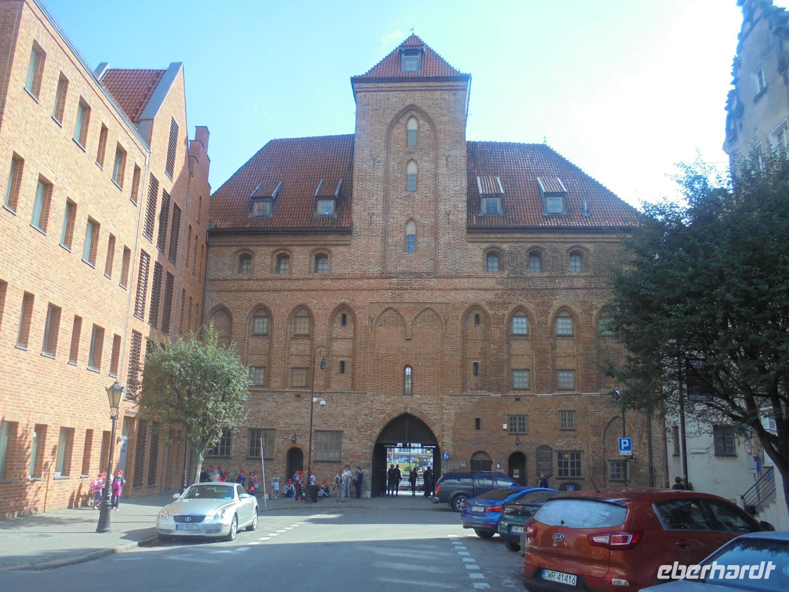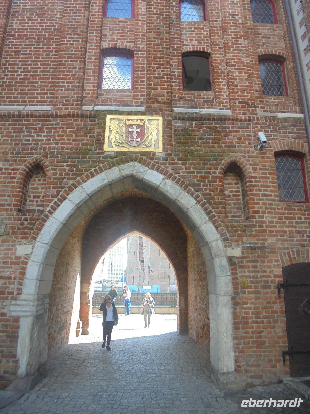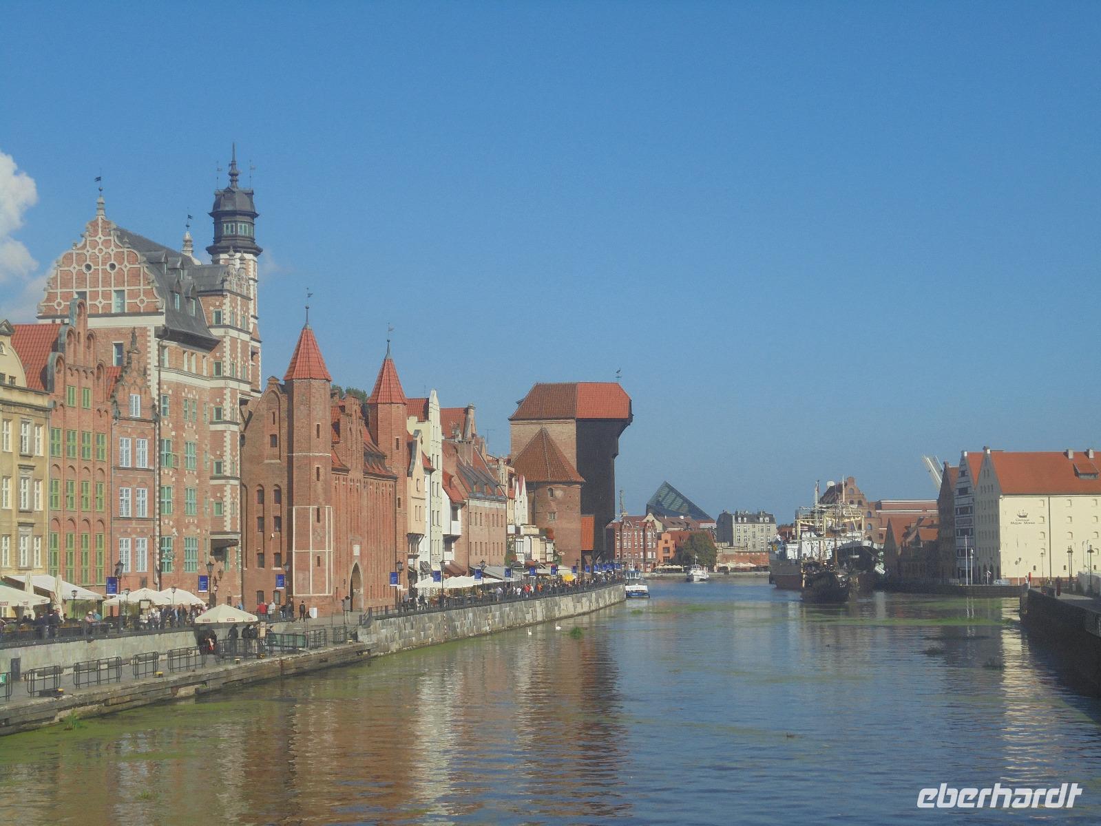 Eines der bekanntesten Wahrzeichen Danzigs ist das Krantor, einst einer der zahlreichen stark befestigten Zugänge zur Altstadt. Das Tor mit zwei wuchtigen Flankentürmen, zwischen denen sich ein über 30 m hoher Mittelbau mit Holzkonstruktion befindet, liegt direkt am alten Hafen am Fluss Mottlau, wurde schon im 14. Jh. errichtet und diente von Anfang an auch als Hebewerk. Am vielfach durch mächtige Balkenlagen abgestützten Kranausleger wurden, angetrieben durch zwei gewaltige Laufräder, die man noch im Inneren des Bauwerkes bewundern kann, tonnenschwere Lasten nach oben gezogen und vom schwenkbaren Arm bis in die ausladenden Bäuchen der großen hölzernen Segelschiffe bugsiert. Ein hübscher Nachbau eines solchen alten Großseglers dient heute als Touristenattraktion.