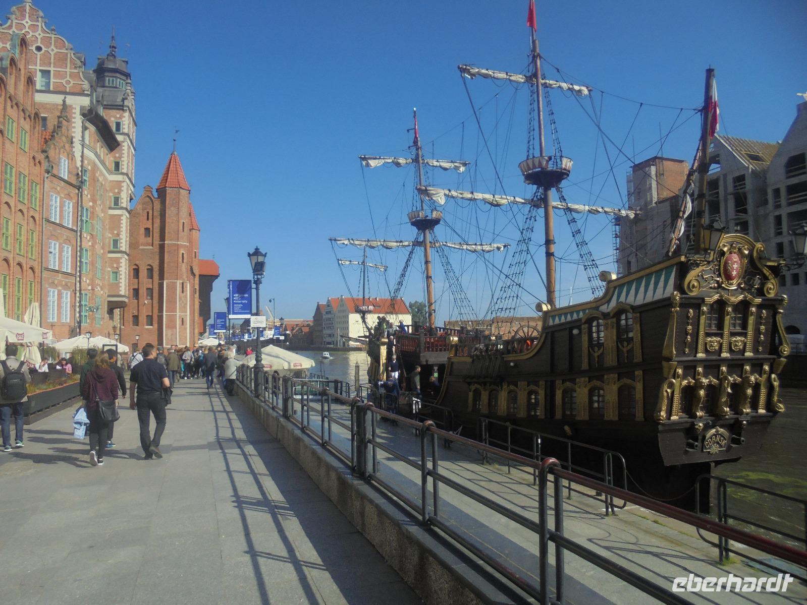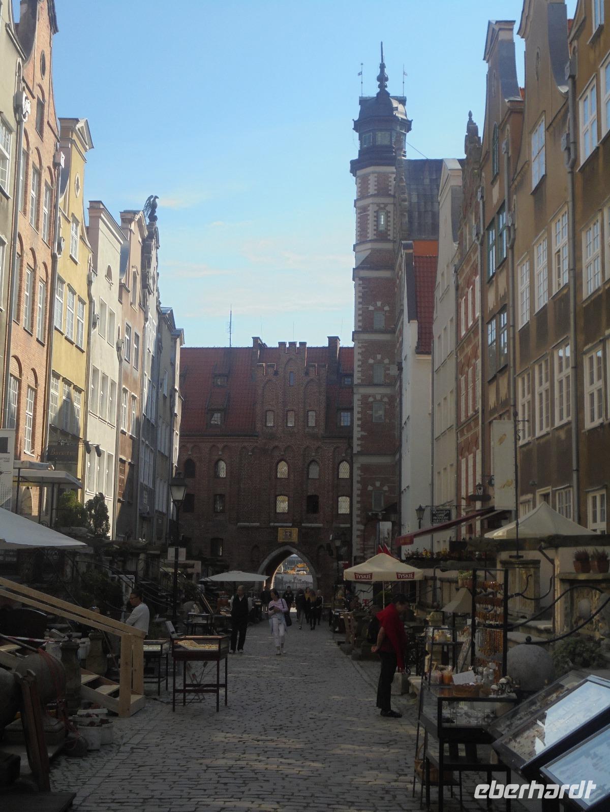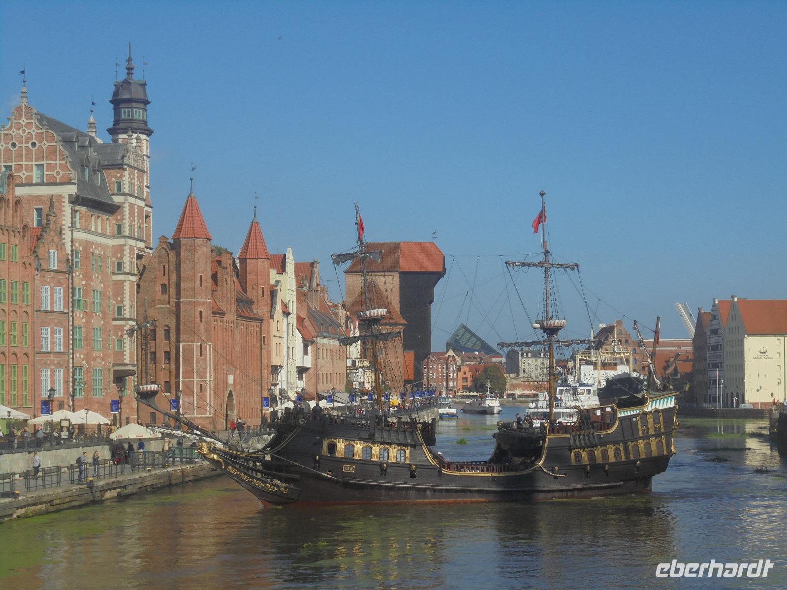 Eines der bekanntesten Wahrzeichen Danzigs ist das Krantor, einst einer der zahlreichen stark befestigten Zugänge zur Altstadt. Das Tor mit zwei wuchtigen Flankentürmen, zwischen denen sich ein über 30 m hoher Mittelbau mit Holzkonstruktion befindet, liegt direkt am alten Hafen am Fluss Mottlau, wurde schon im 14. Jh. errichtet und diente von Anfang an auch als Hebewerk. Am vielfach durch mächtige Balkenlagen abgestützten Kranausleger wurden, angetrieben durch zwei gewaltige Laufräder, die man noch im Inneren des Bauwerkes bewundern kann, tonnenschwere Lasten nach oben gezogen und vom schwenkbaren Arm bis in die ausladenden Bäuchen der großen hölzernen Segelschiffe bugsiert. Ein hübscher Nachbau eines solchen alten Großseglers dient heute als Touristenattraktion.