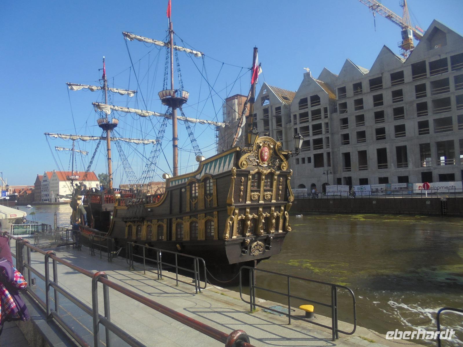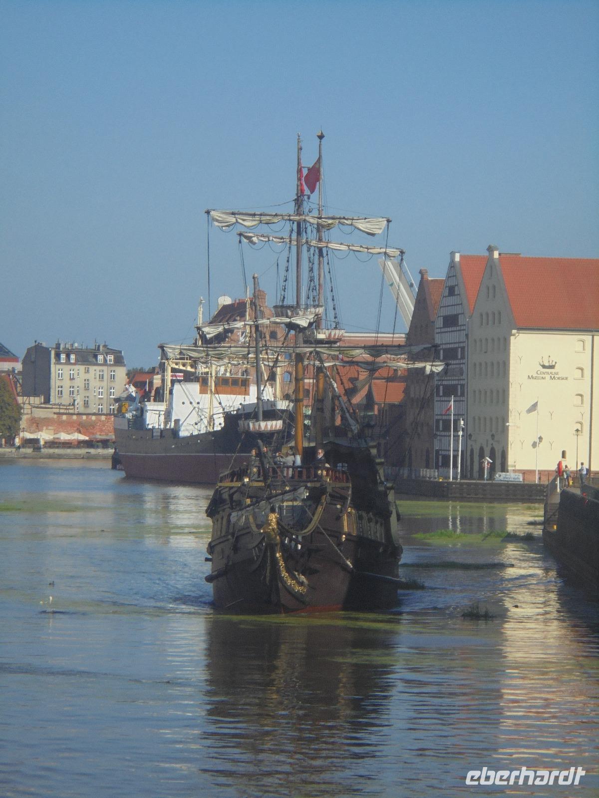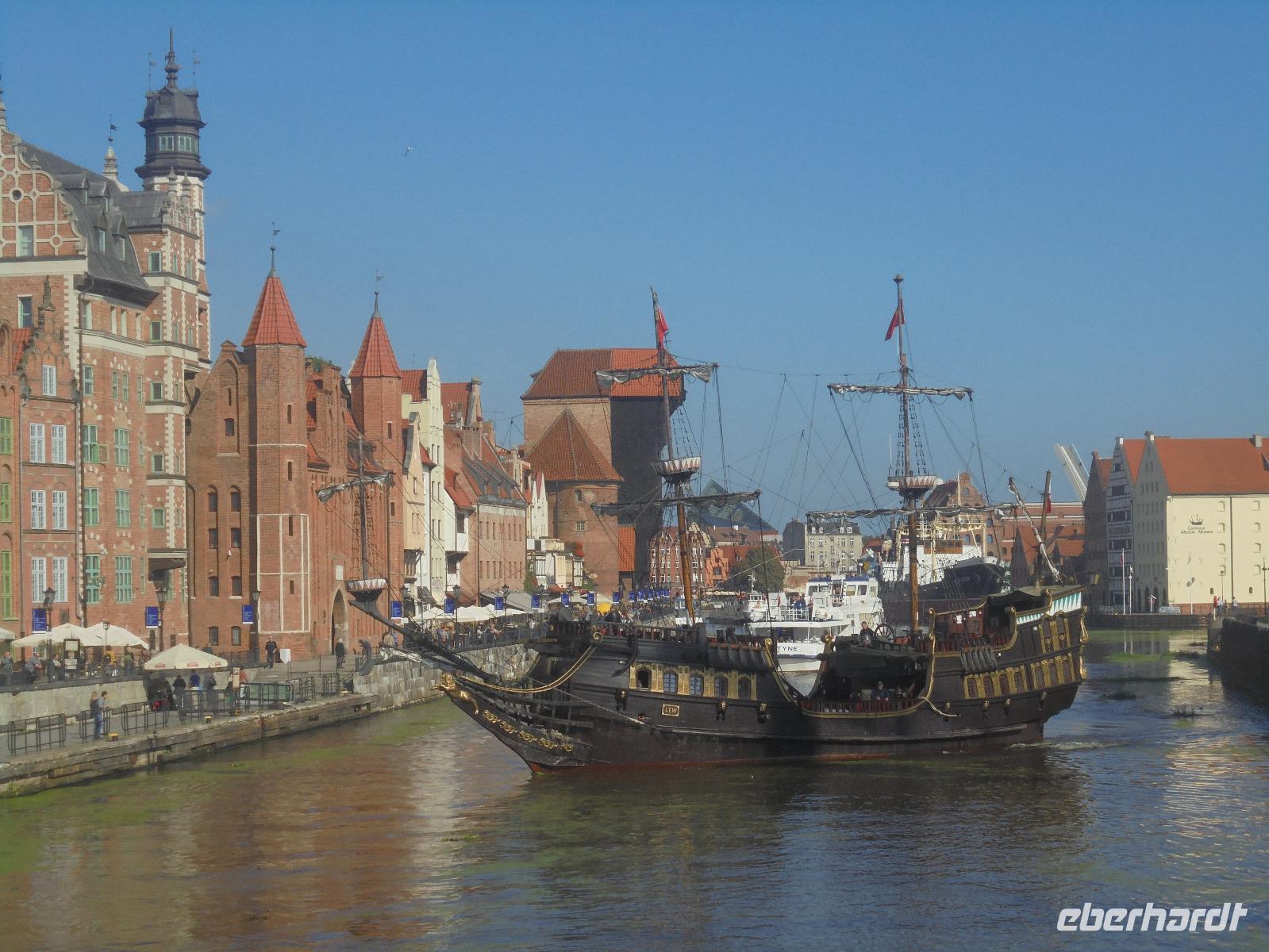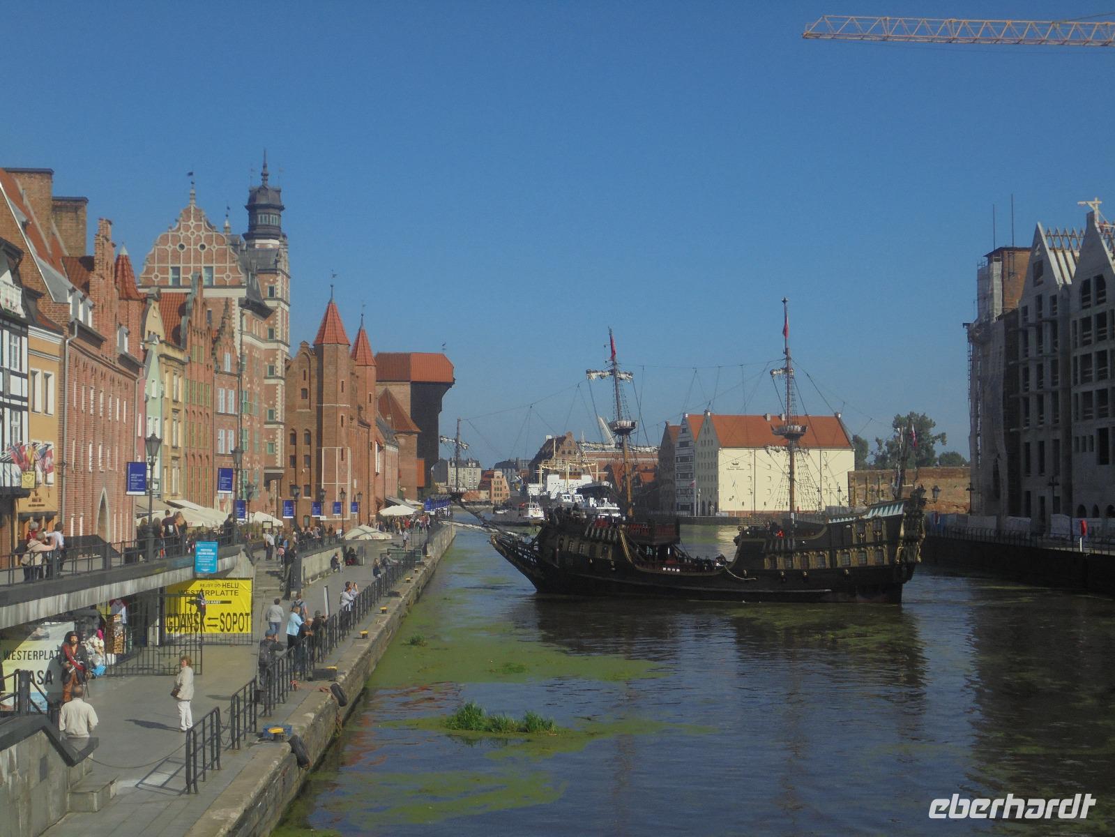 Eines der bekanntesten Wahrzeichen Danzigs ist das Krantor, einst einer der zahlreichen stark befestigten Zugänge zur Altstadt. Das Tor mit zwei wuchtigen Flankentürmen, zwischen denen sich ein über 30 m hoher Mittelbau mit Holzkonstruktion befindet, liegt direkt am alten Hafen am Fluss Mottlau, wurde schon im 14. Jh. errichtet und diente von Anfang an auch als Hebewerk. Am vielfach durch mächtige Balkenlagen abgestützten Kranausleger wurden, angetrieben durch zwei gewaltige Laufräder, die man noch im Inneren des Bauwerkes bewundern kann, tonnenschwere Lasten nach oben gezogen und vom schwenkbaren Arm bis in die ausladenden Bäuchen der großen hölzernen Segelschiffe bugsiert. Ein hübscher Nachbau eines solchen alten Großseglers dient heute als Touristenattraktion.