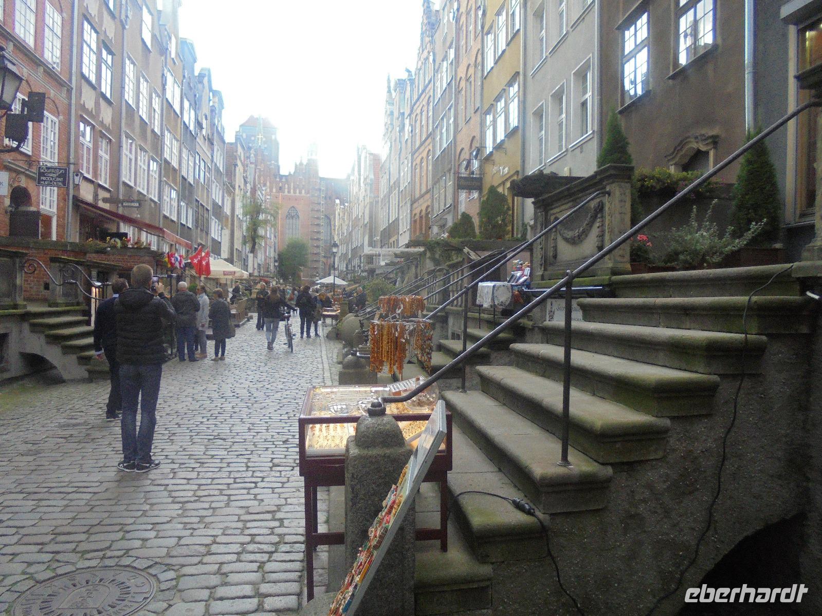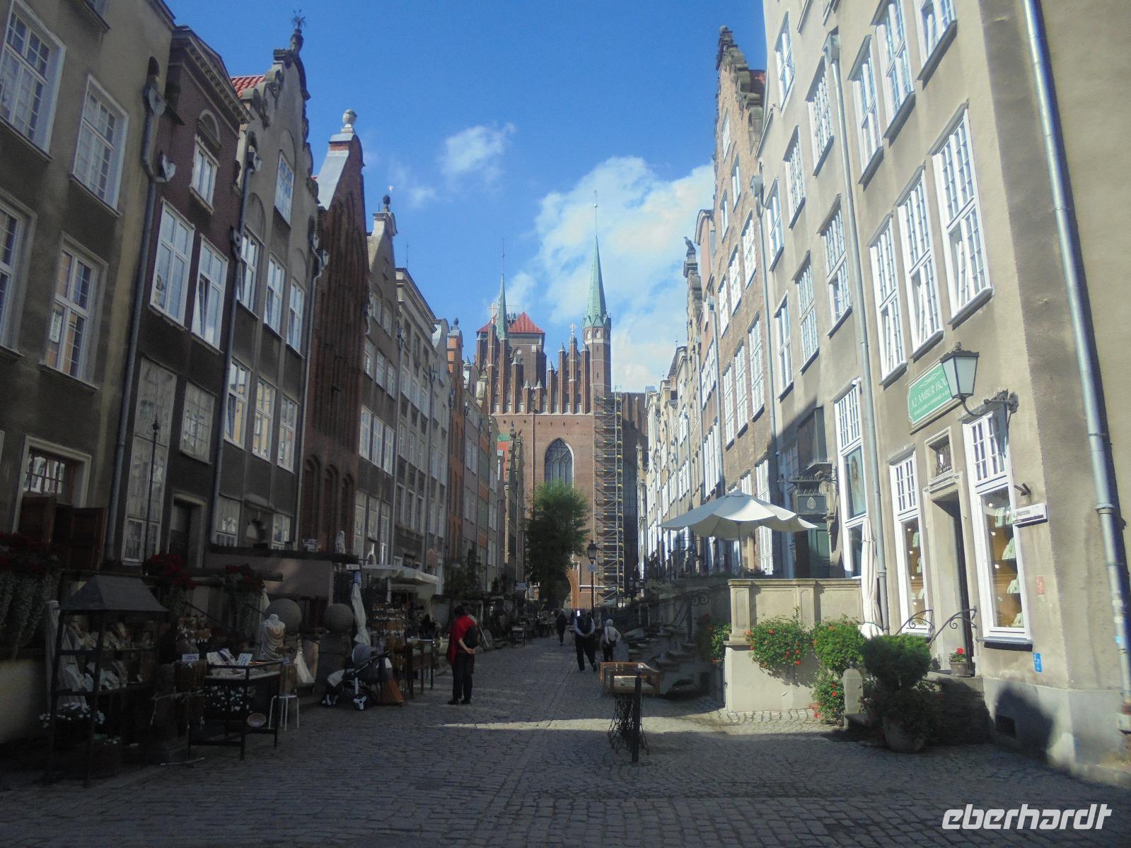 Im Inneren der Altstadt sind die Straßen mit rekonstruierten und historisches Flair verbreitenden abgestuften Fassaden versehen, an bedeutende Städte wie Amsterdam oder Lübeck erinnernd. Interessant sind die ausladenden Danziger Beischläge, wie man hier die teilweise verzierten und mit Steinumrandungen oder Wasserspeiern versehenen vorgelagerten äußeren Treppenaufgänge nennt. Auf unserem Weg besuchten wir z.B. das berühmte Restaurant, in dessen Keller früher das Original-Danziger-Goldwasser hergestellt wurde, statteten der Marienkirche einen Besuch ab, die als eine der drei größten Backsteinkirchen nördlich der Alpen gilt und zu den größten Hallenkirchen der Welt gehört und flanierten dann die Lange Gasse und den Langen Markt hinunter.