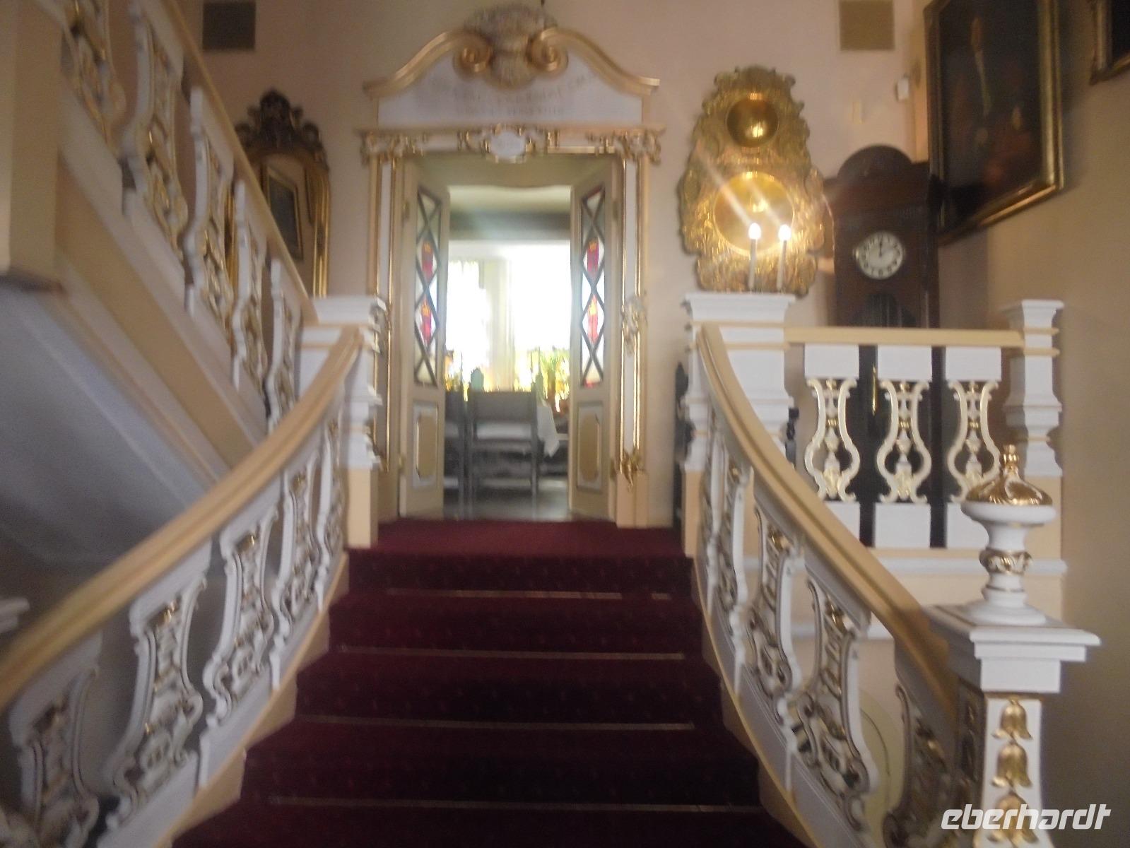 Dann überquerten wir die Weichsel, den mit 1047 km längsten Fluss in Polen und erreichten die Stadt Gniew, deutsch Mewe, im Tal der Unteren Weichsel. Schon von weitem bietet der Ort mit seiner hohen Stadtkirche und der weithin das Bild bestimmenden Burg des Deutschen Ordens einen malerischen Anblick. Unser Hotel lag in einem alten barocken Adelspalast, den im 17. Jh. der einstige Kronfeldherr des polnischen Reiches erbauen ließ, der als Johann III. Sobieski später die polnische Königswürde erlangte. Das Barockschloss Palac Marysienki bewohnte später seine Frau Maria Kazimiera Sobieska und heute ist es das Hotel, in dem auch wir wohnten.