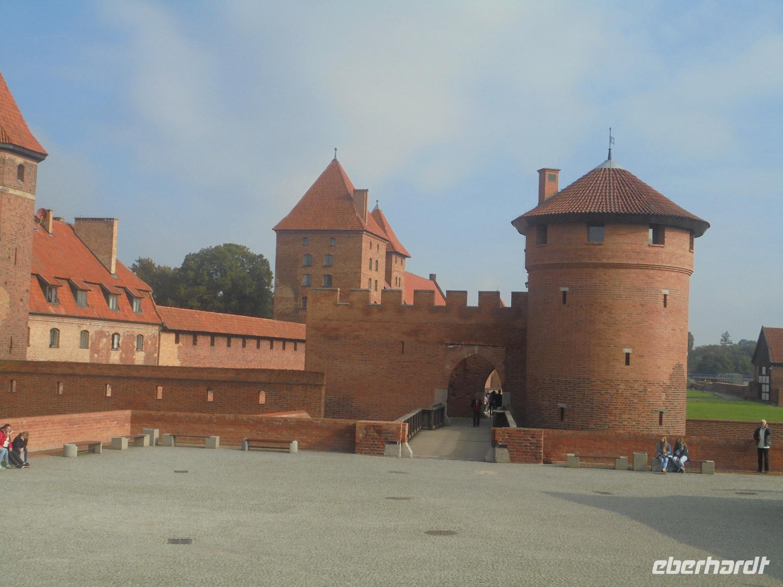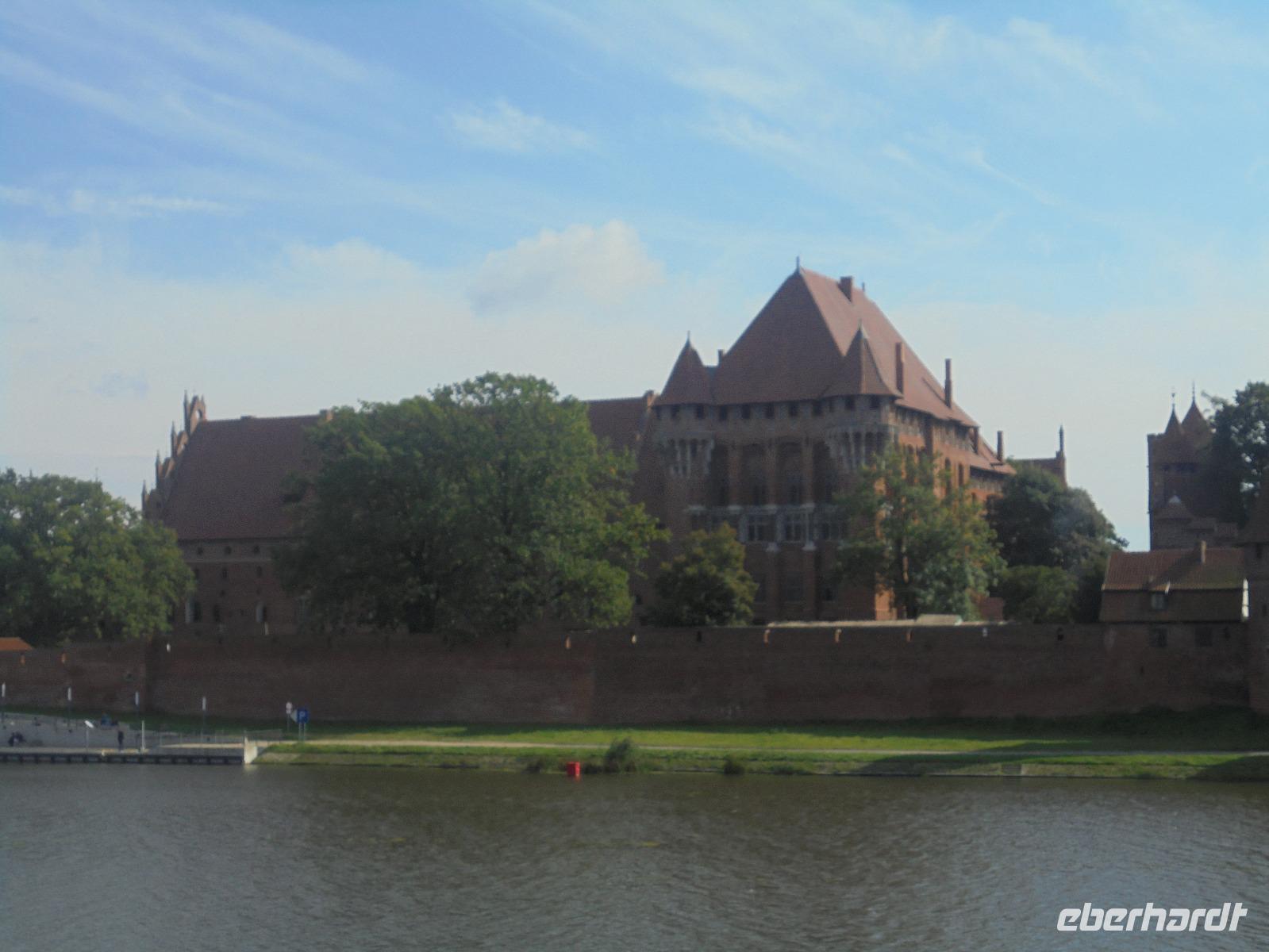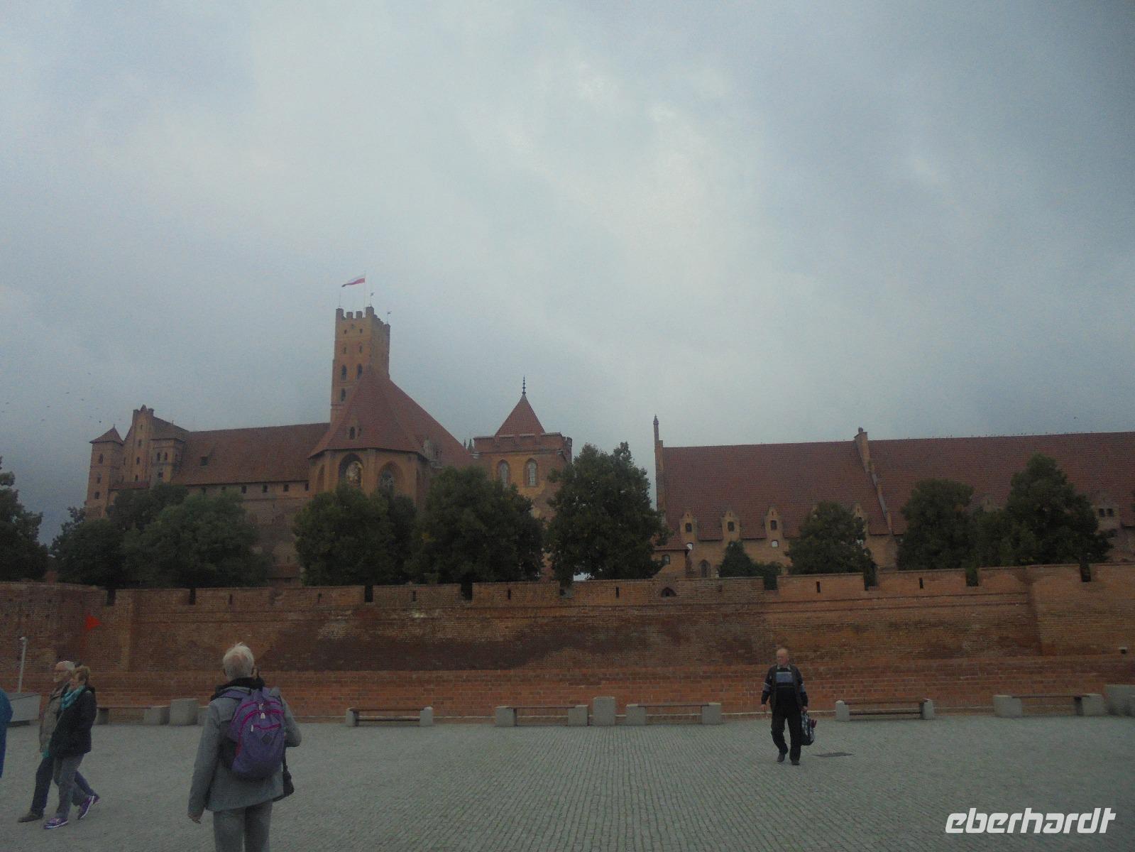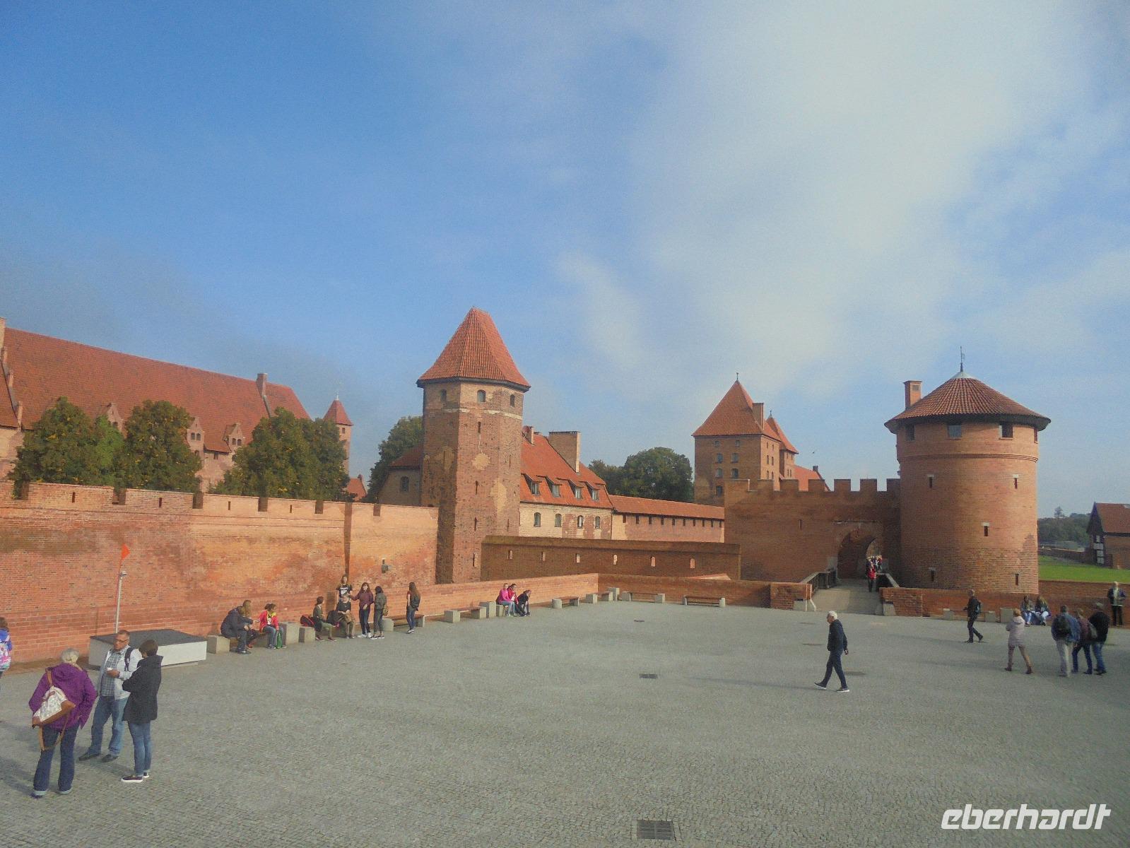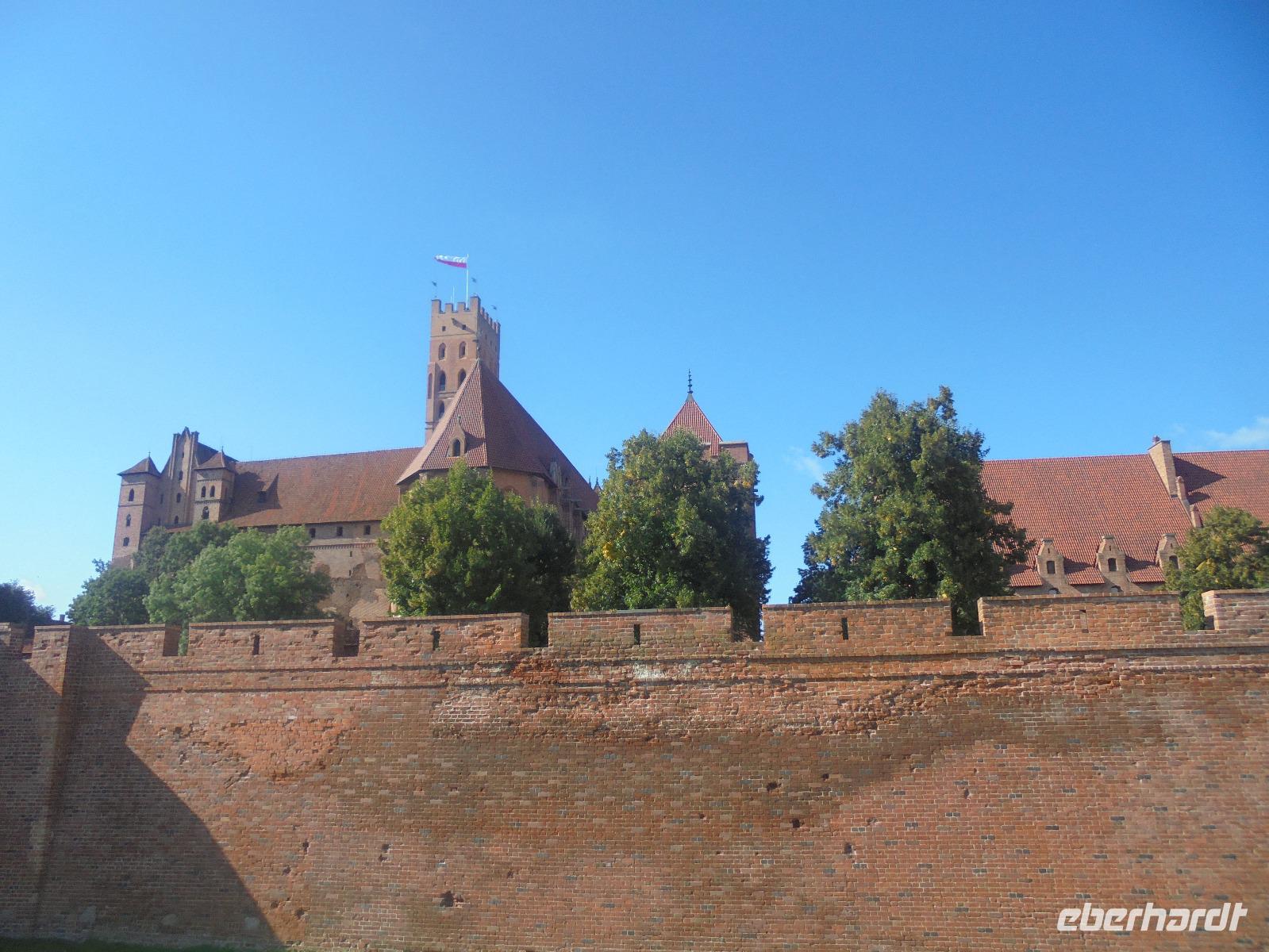 Auf Polnisch heißt sie Malbork und liegt am Fluss Nogat, einem Mündungsarm der Weichsel. Der Deutschen Orden wollte mit dem Bau der riesigen Burg seine Eroberungen im Gebiet der Pruzzen sichern und gleichzeitig die Herrscher umliegender Staaten abschrecken. Ende des 13. Jh. wurde der gewaltige Bau in Backsteingotik errichtet und gilt heute als größtes Backsteingebäude Europas Der älteste Teil der Burganlage heißt Hochschloss und beherbergte als Kernbau ursprünglich Kapelle, Versammlungsraum und Schlafsaal der Mönchskrieger, denn als Kreuzritterorden war der Deutsche Orden Ende des 12. Jh. im Heiligen Land gegründet worden. Beim späteren Ausbau wurde die Kapelle zu einer großen Kirche erweitert die heute die anderen umfangreichen Gebäudeteile überragt. Seit 1309 war die Burg das Zentrum des Ordensstaates, blieb bis zu ihrer Verpfändung 1454 Sitz der Hochmeister des Deutschen Ordens.