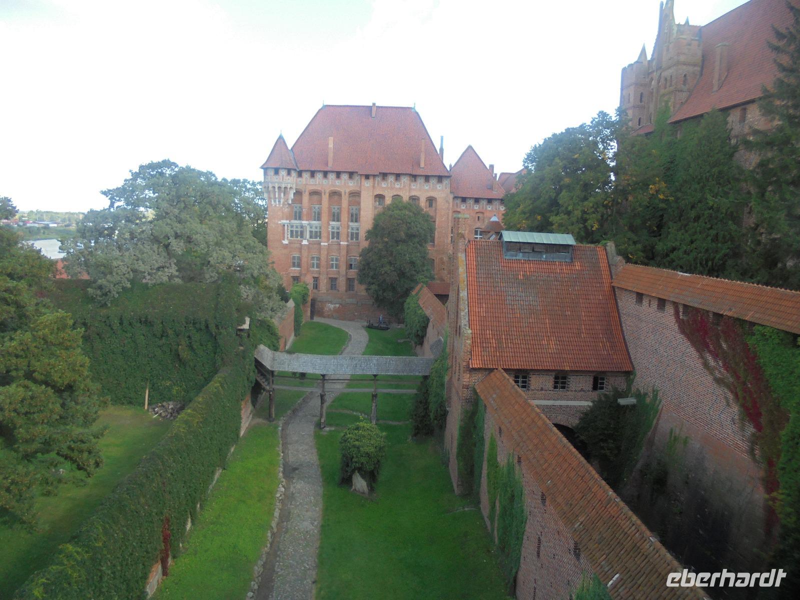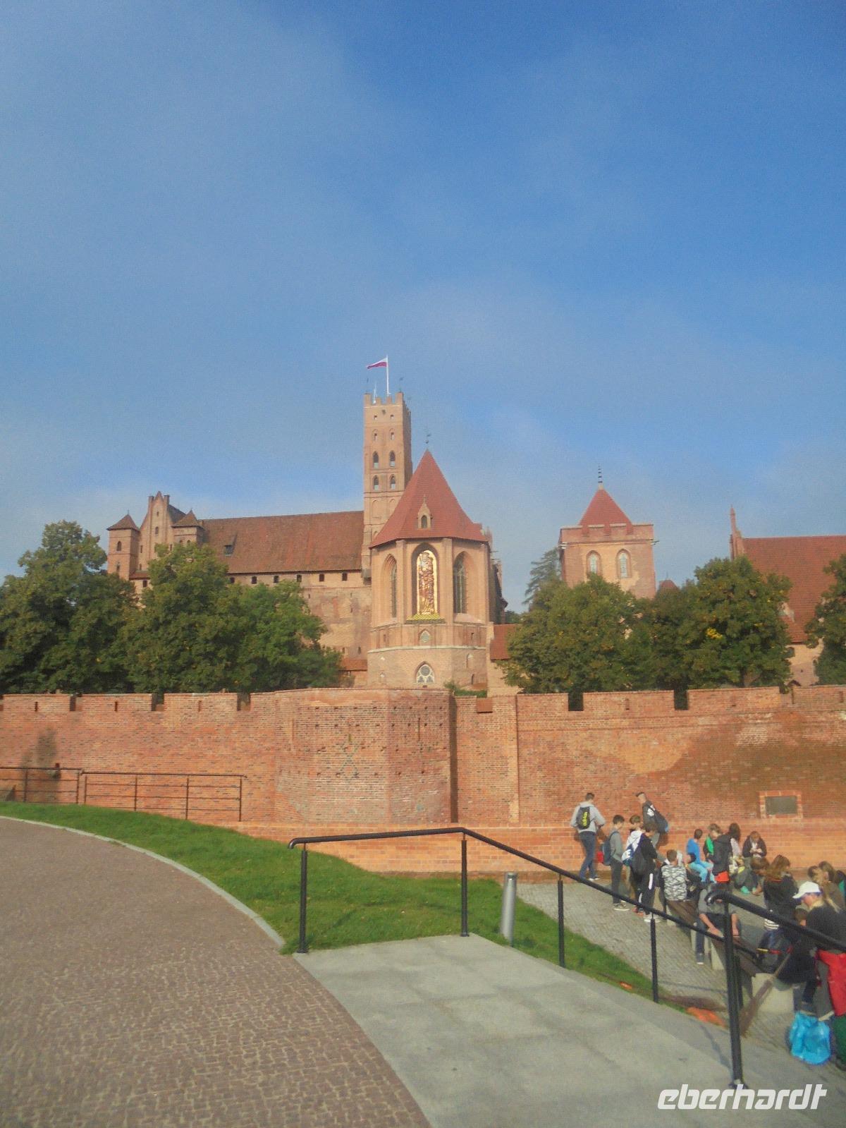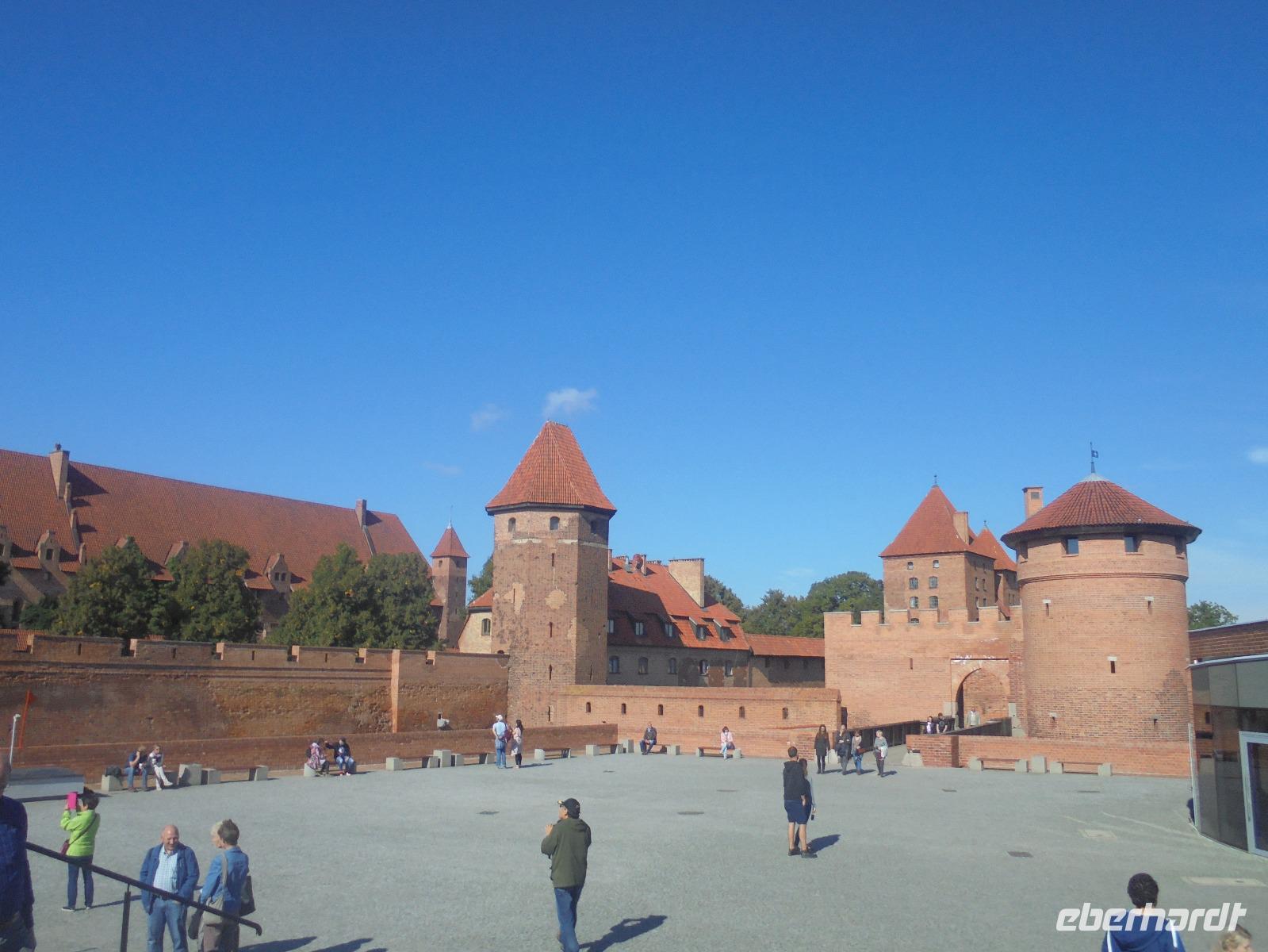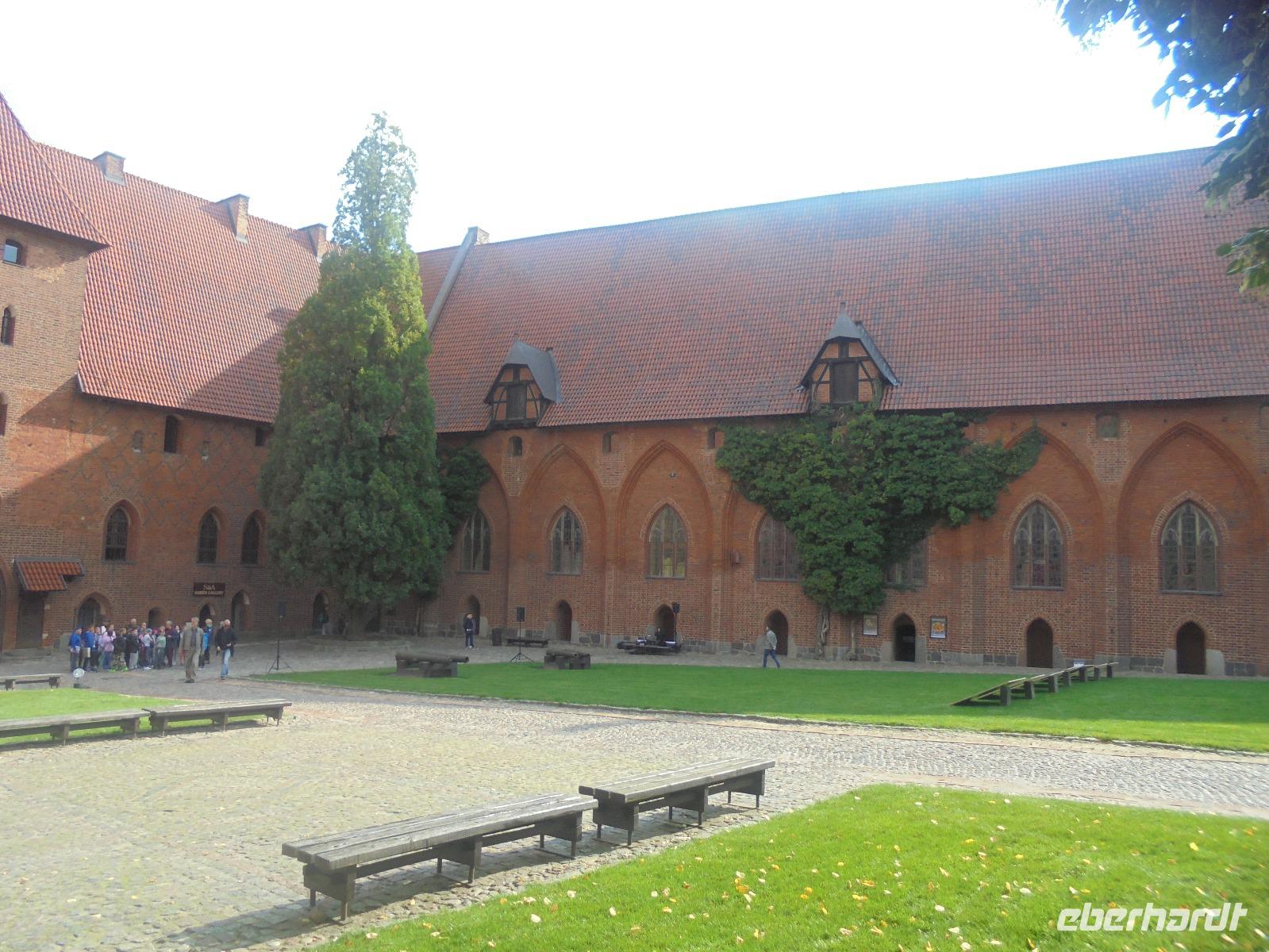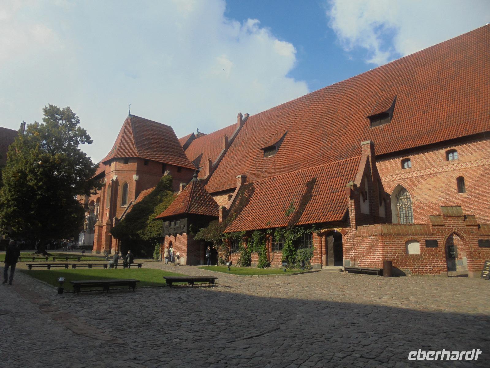 Auf Polnisch heißt sie Malbork und liegt am Fluss Nogat, einem Mündungsarm der Weichsel. Der Deutschen Orden wollte mit dem Bau der riesigen Burg seine Eroberungen im Gebiet der Pruzzen sichern und gleichzeitig die Herrscher umliegender Staaten abschrecken. Ende des 13. Jh. wurde der gewaltige Bau in Backsteingotik errichtet und gilt heute als größtes Backsteingebäude Europas Der älteste Teil der Burganlage heißt Hochschloss und beherbergte als Kernbau ursprünglich Kapelle, Versammlungsraum und Schlafsaal der Mönchskrieger, denn als Kreuzritterorden war der Deutsche Orden Ende des 12. Jh. im Heiligen Land gegründet worden. Beim späteren Ausbau wurde die Kapelle zu einer großen Kirche erweitert die heute die anderen umfangreichen Gebäudeteile überragt. Seit 1309 war die Burg das Zentrum des Ordensstaates, blieb bis zu ihrer Verpfändung 1454 Sitz der Hochmeister des Deutschen Ordens.