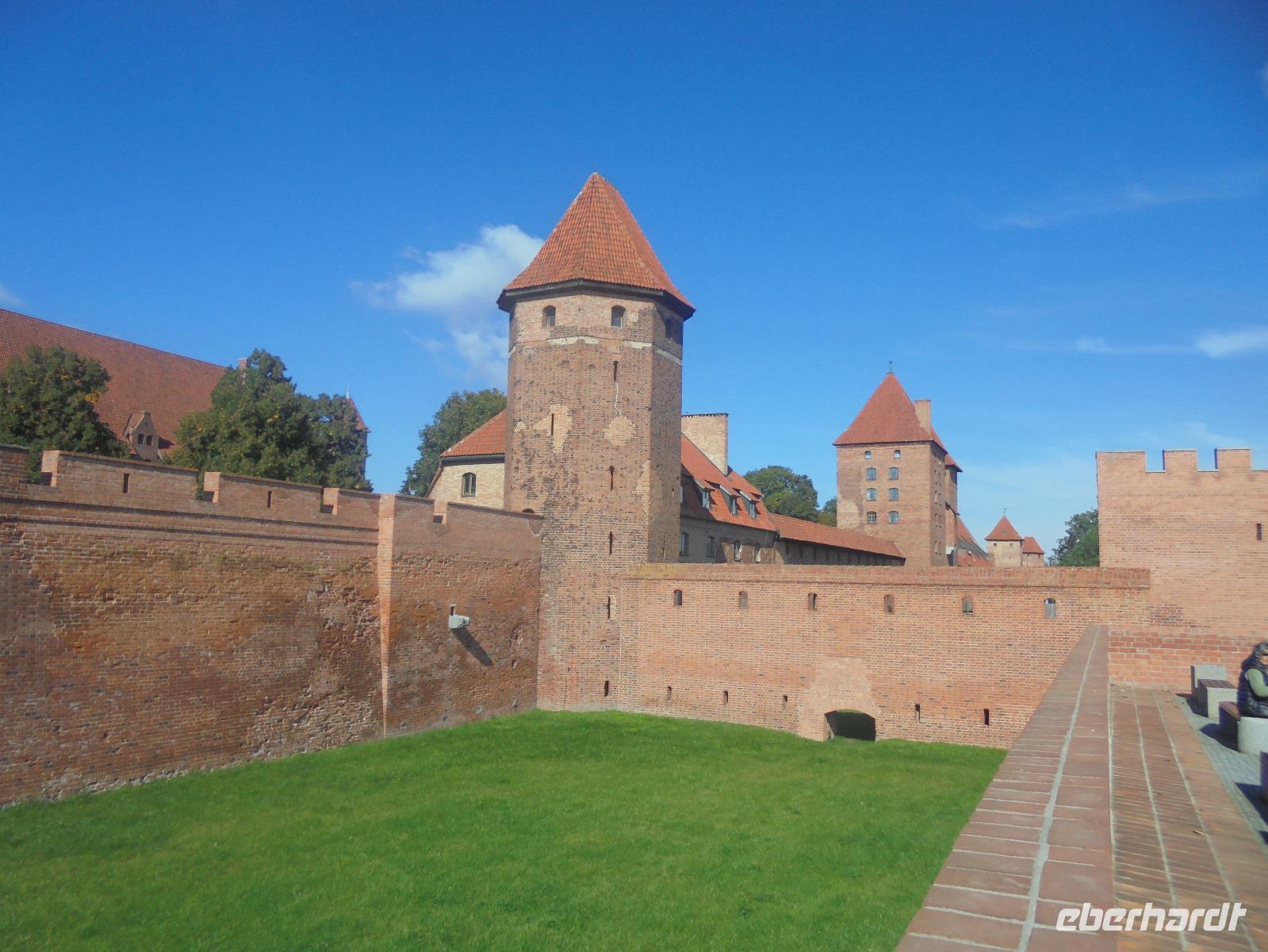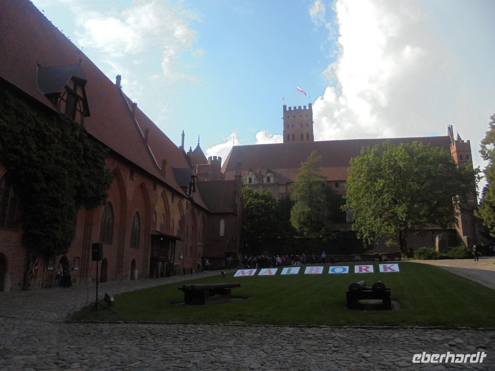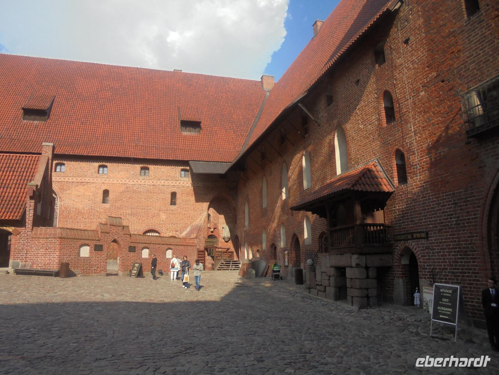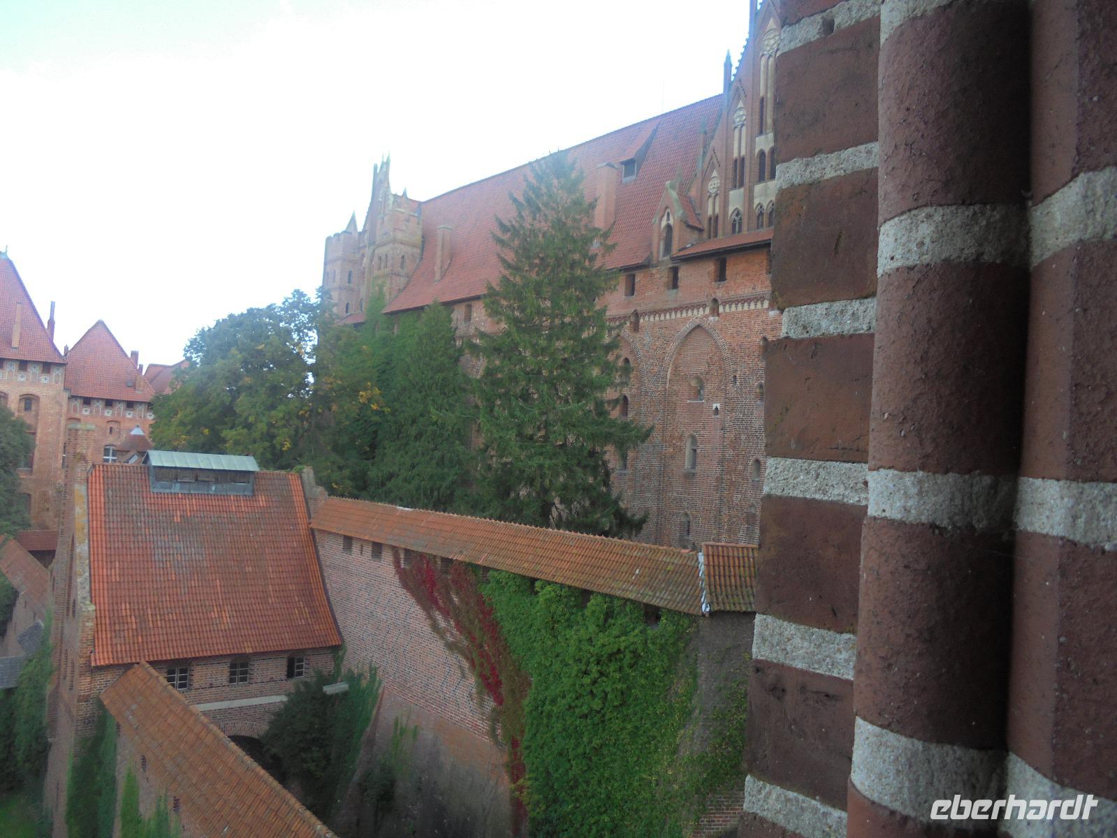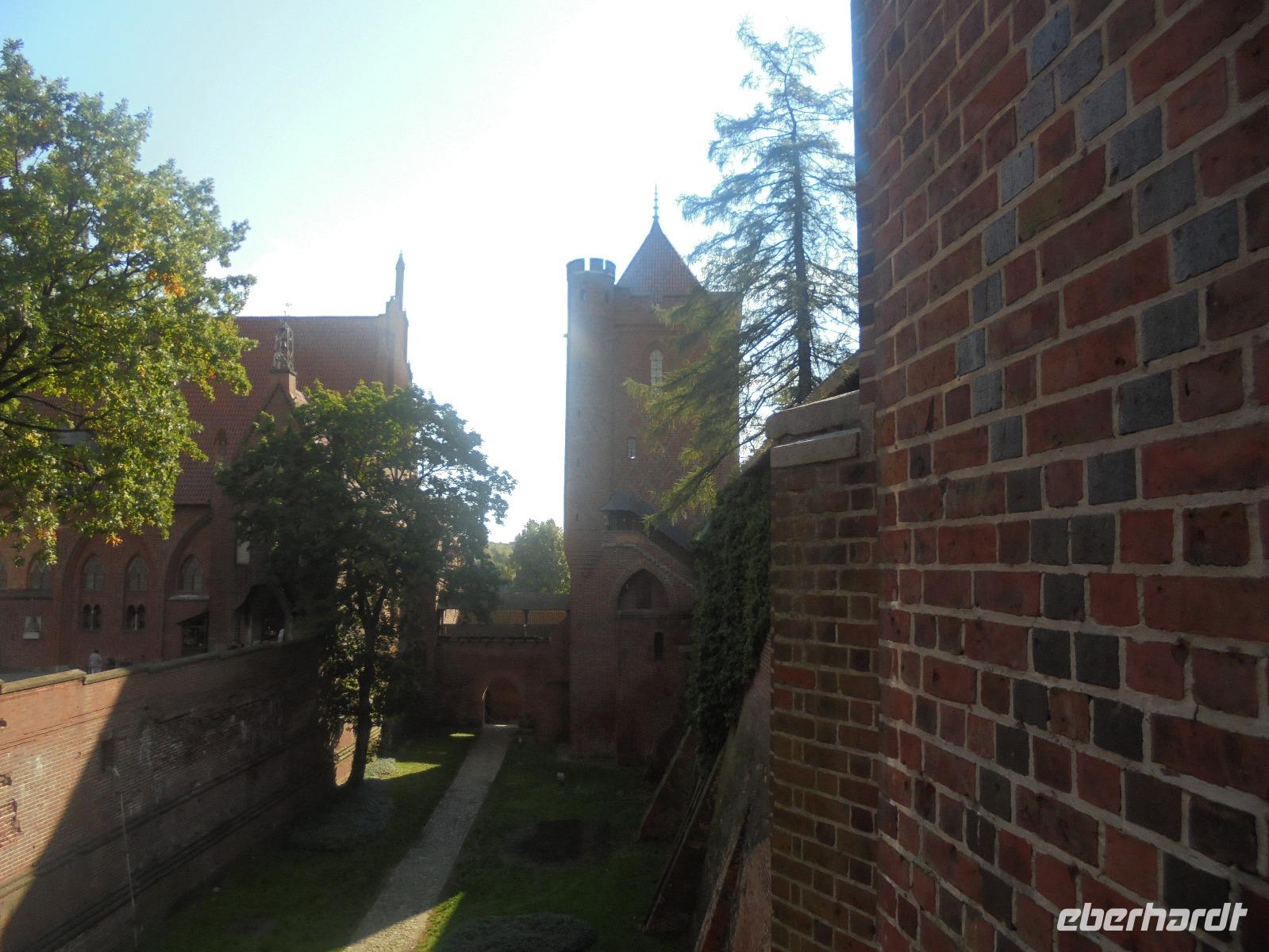 Auf Polnisch heißt sie Malbork und liegt am Fluss Nogat, einem Mündungsarm der Weichsel. Der Deutschen Orden wollte mit dem Bau der riesigen Burg seine Eroberungen im Gebiet der Pruzzen sichern und gleichzeitig die Herrscher umliegender Staaten abschrecken. Ende des 13. Jh. wurde der gewaltige Bau in Backsteingotik errichtet und gilt heute als größtes Backsteingebäude Europas Der älteste Teil der Burganlage heißt Hochschloss und beherbergte als Kernbau ursprünglich Kapelle, Versammlungsraum und Schlafsaal der Mönchskrieger, denn als Kreuzritterorden war der Deutsche Orden Ende des 12. Jh. im Heiligen Land gegründet worden. Beim späteren Ausbau wurde die Kapelle zu einer großen Kirche erweitert die heute die anderen umfangreichen Gebäudeteile überragt. Seit 1309 war die Burg das Zentrum des Ordensstaates, blieb bis zu ihrer Verpfändung 1454 Sitz der Hochmeister des Deutschen Ordens.