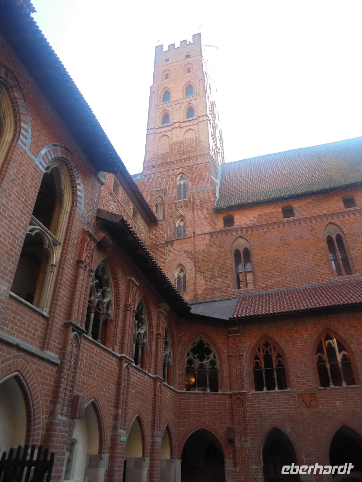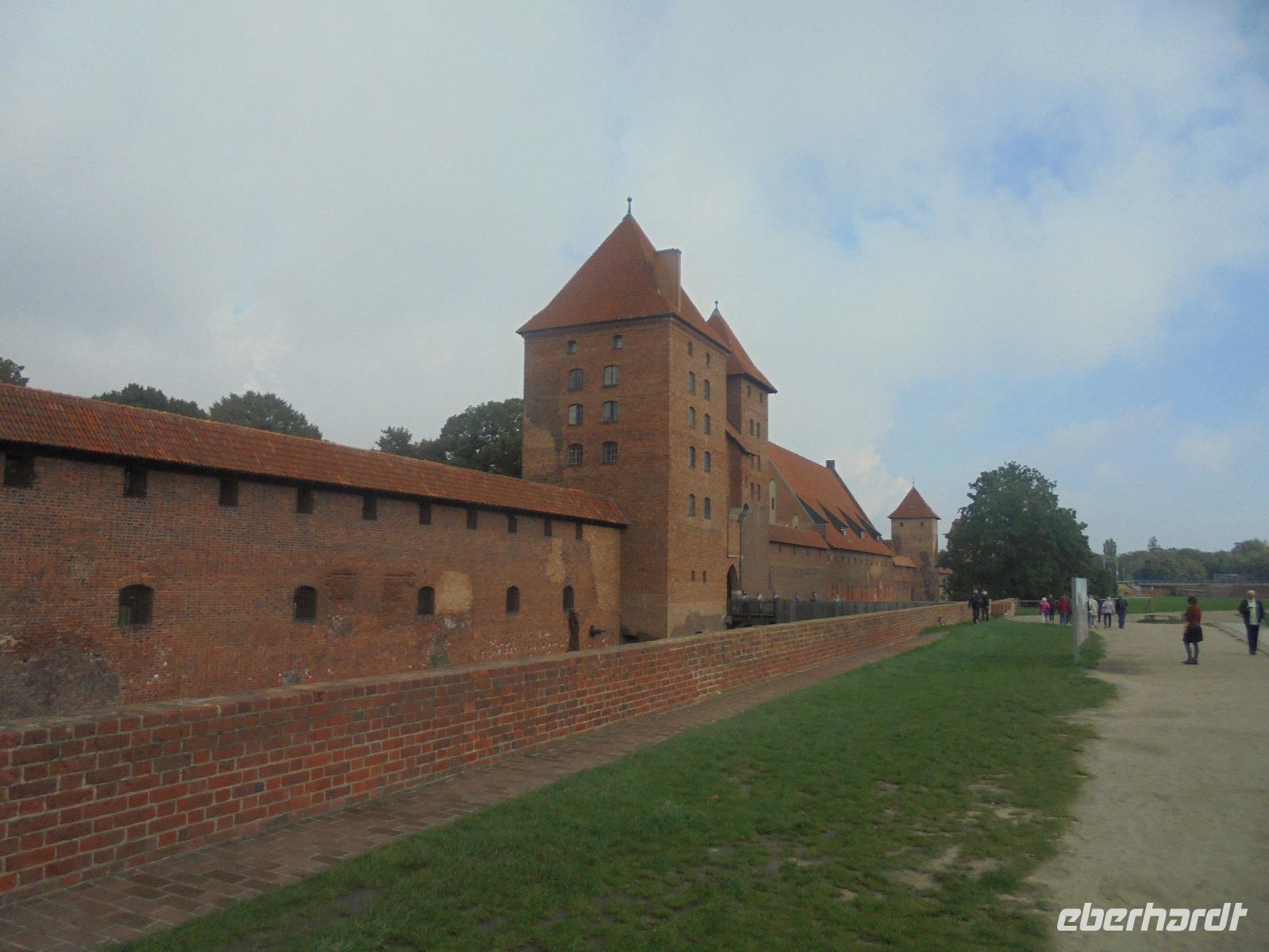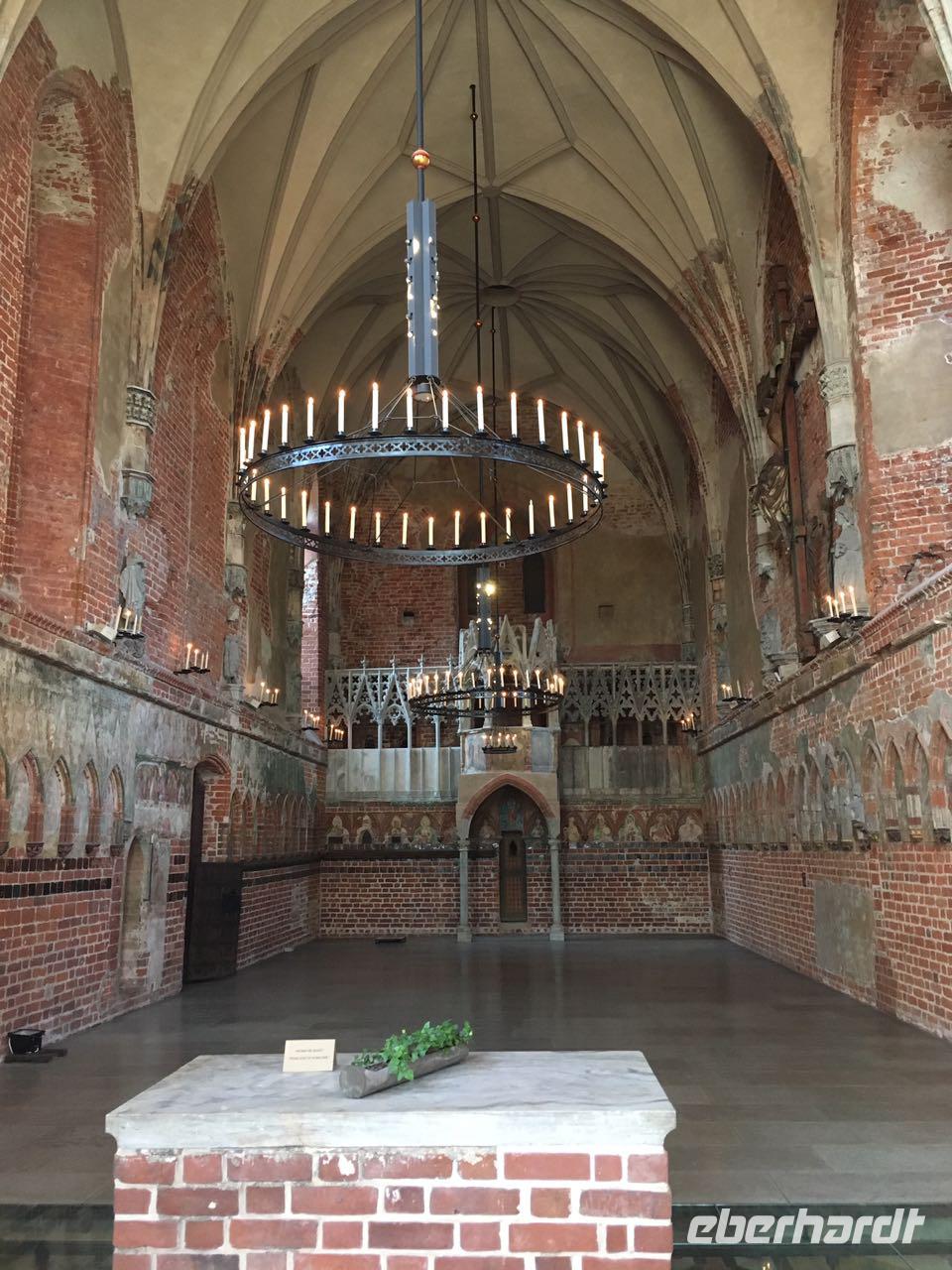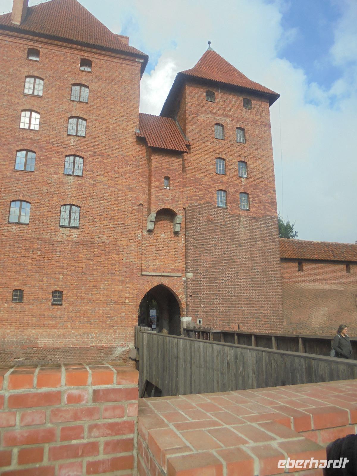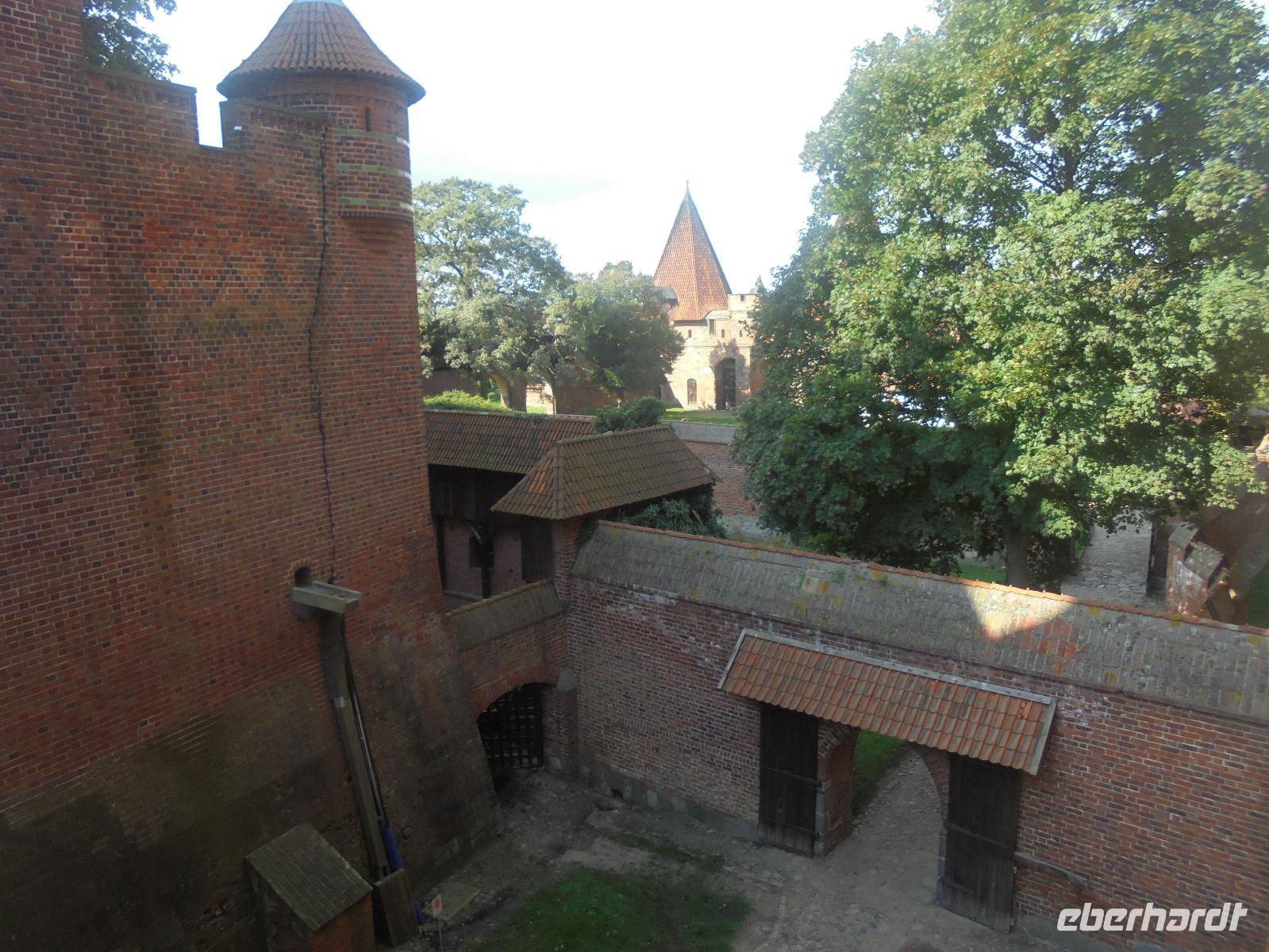 Auf Polnisch heißt sie Malbork und liegt am Fluss Nogat, einem Mündungsarm der Weichsel. Der Deutschen Orden wollte mit dem Bau der riesigen Burg seine Eroberungen im Gebiet der Pruzzen sichern und gleichzeitig die Herrscher umliegender Staaten abschrecken. Ende des 13. Jh. wurde der gewaltige Bau in Backsteingotik errichtet und gilt heute als größtes Backsteingebäude Europas Der älteste Teil der Burganlage heißt Hochschloss und beherbergte als Kernbau ursprünglich Kapelle, Versammlungsraum und Schlafsaal der Mönchskrieger, denn als Kreuzritterorden war der Deutsche Orden Ende des 12. Jh. im Heiligen Land gegründet worden. Beim späteren Ausbau wurde die Kapelle zu einer großen Kirche erweitert die heute die anderen umfangreichen Gebäudeteile überragt. Seit 1309 war die Burg das Zentrum des Ordensstaates, blieb bis zu ihrer Verpfändung 1454 Sitz der Hochmeister des Deutschen Ordens.