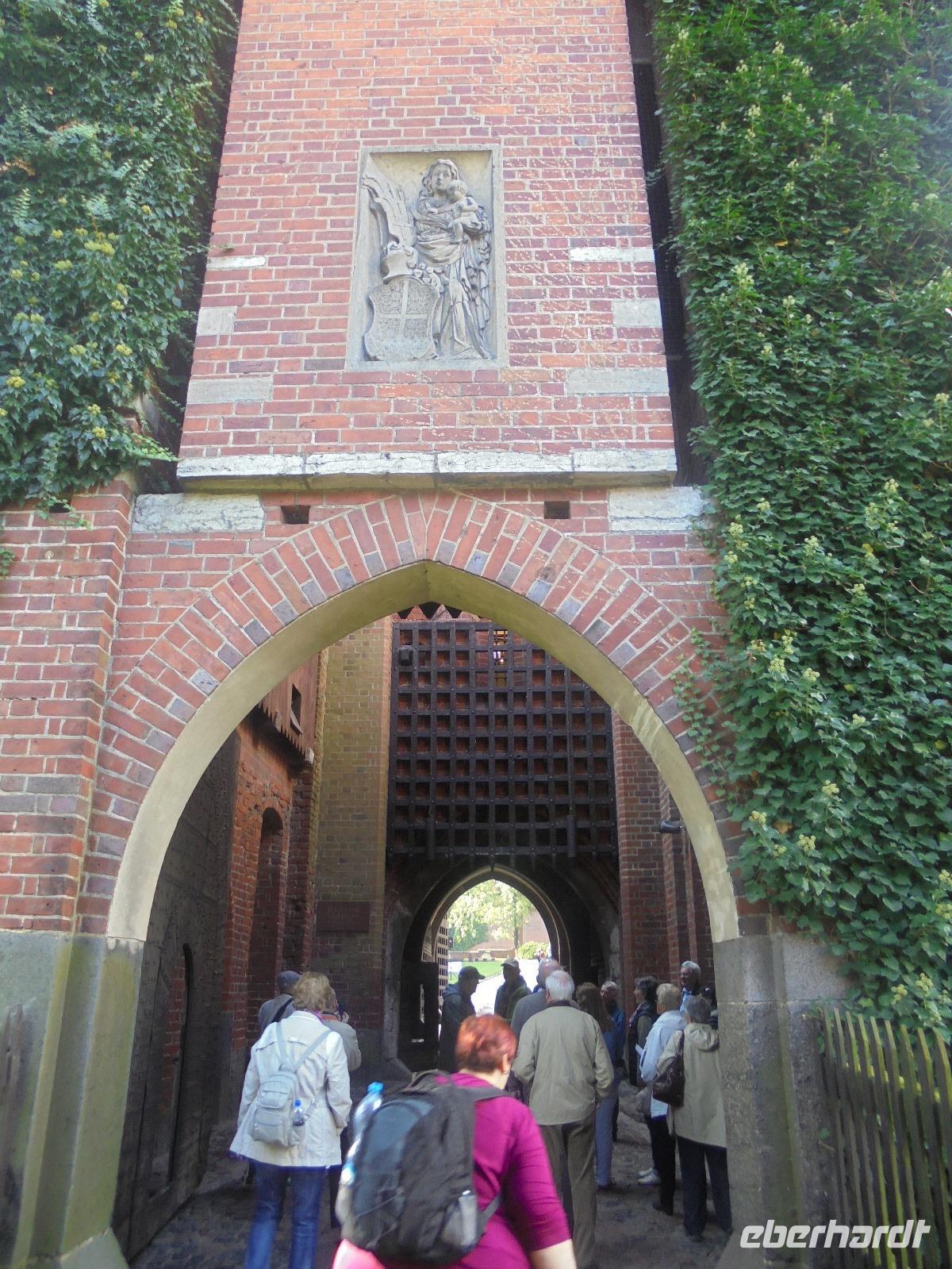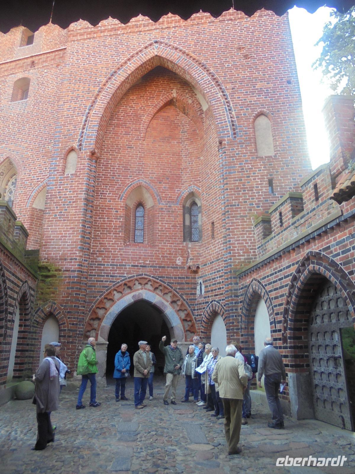 Wir hatten eine interessante und inhaltsreiche Gesamtführung in der Burg, die ein beeindruckendes, einheitliches und überaus malerisches Bild bietet, beherrscht vom wuchtigen Palast und der danebenliegenden Kirche. Zunächst durchquerten wir einen Teil der gewaltigen Befestigungsanlagen, überwiegend aus dem 15. Jahrhundert, die ein verschachteltes Verteidigungssystem aus Gräben, Mauern und Bastionen bilden - mit für Burgen sehr ungewöhnlichen Details wie beispielsweise einem teilweise vierfach gestaffelten Mauerring. Wir sahen nicht nur die furchteinflößenden Tore mit Fallgattern und Gußerkern, die die schönen Pforten und Innenhöfe, sondern konnten auch die im Inneren befindliche Klosteranlage, die Ordenskirche und sogar die Palastküche bewundern. Jedes neue Detail rief Staunen hervor und zeugte vom Einfallsreichtum der Erbauer, sogar der Dansker, ein nach außen gerichteter einzeln stehender Turm, durch einen langen Gang mit gewaltigen Außenmauern zu erreichen, der die Toilettenanlage enthielt - eine der größten, die je in eine Burg des Mittelalters eingebaut wurden.