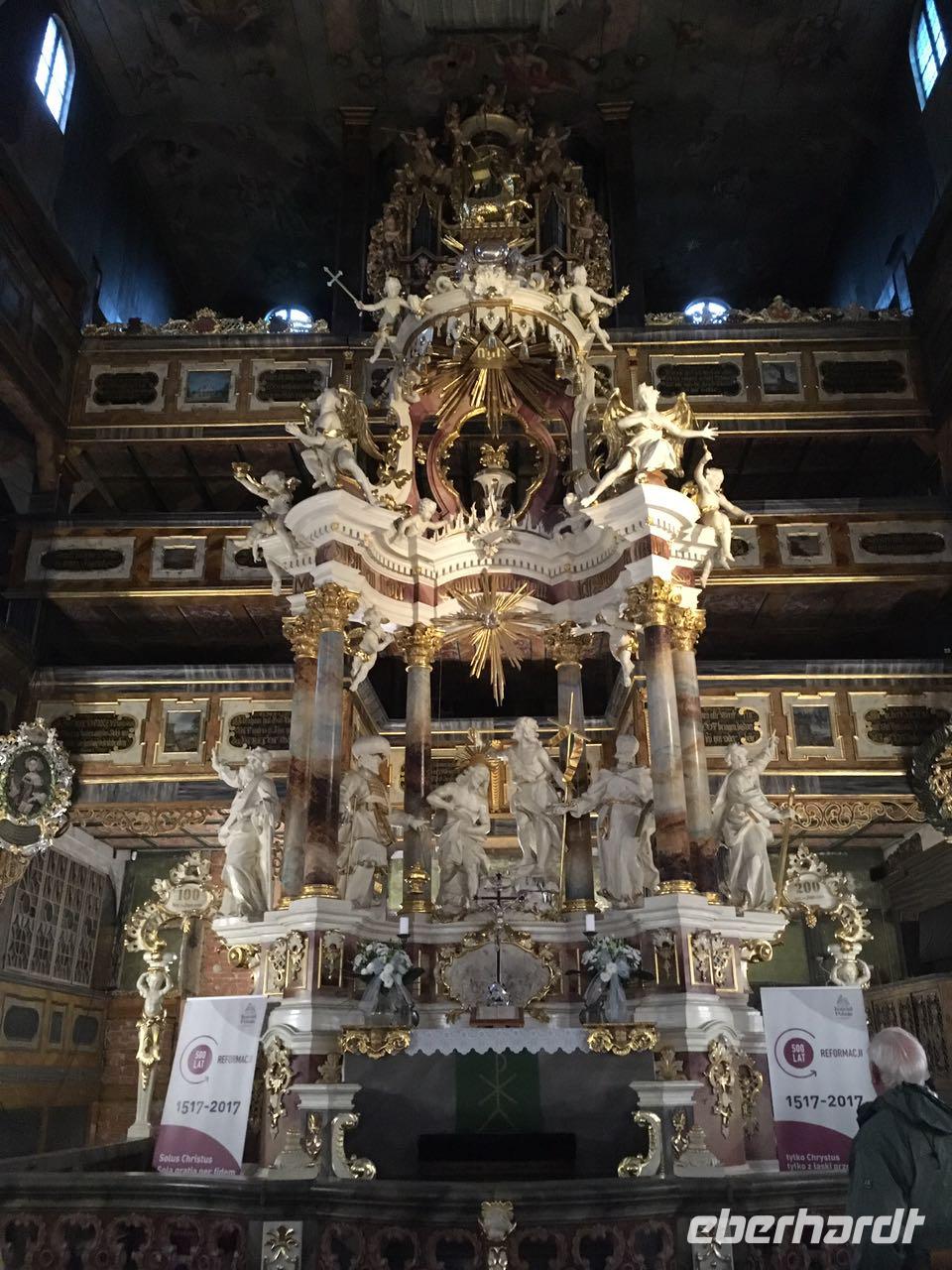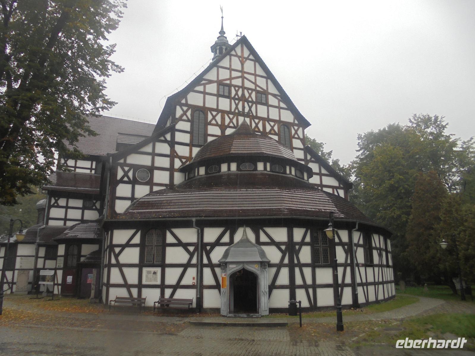 Unser nächstes Ziel war wiederum eine Kirche, diesmal aber eine protestantische, die nicht nur eine ganz besondere Geschichte erzählt, sondern auch mit einem extravaganten Erscheinungsbild aufwarten kann. Schon seit dem Jahre 2001 steht die evangelische Friedenskirche von Schweidnitz (Swidnica) auf der Liste des UNESCO-Weltkulturerbes. Der Ort war einst Residenz eines eigenen Herzogtums und hier wurde unter anderem einer der Beschlüsse des Westfälischen Friedens, der im Jahr 1648 den 30jährigen Krieg beendete, umgesetzt: die Erlaubnis für die schlesischen Protestanten, drei „Friedenskirchen" zu bauen. So entstanden diese Sakralbauwerke in Glogau, Schweidnitz und Jauer, aber unter sehr schwierigen und speziellen Bedingungen, die die Katholiken gestellt hatten. So durften weder Steine noch Ziegel als Baumaterial verwendet werden, nur Holz, Lehm und Stroh waren erlaubt. Türme oder Glocken durften die Kirchen nicht haben und sie mussten außerhalb der Stadtmauern stehen. Schließlich betrug die maximal erlaubte Bauzeit ein Jahr und die Gemeinde musste die Baukosten selbst aufbringen.