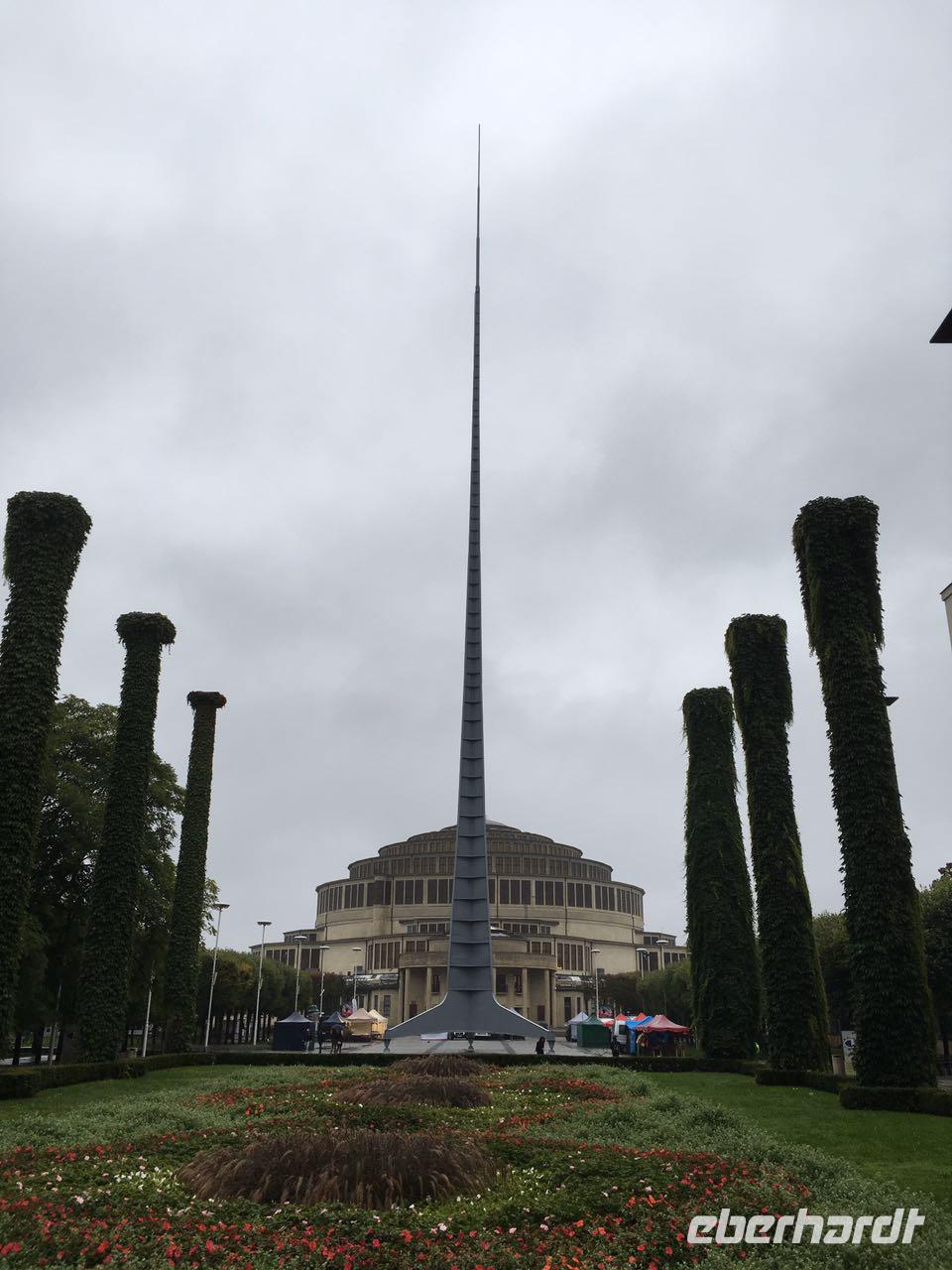Nach der Besichtigung des eindrucksvollen Bauwerkes erreichten wir dann die einstige schlesische Hauptstadt Breslau (Wroclaw), die zweifellos zu den schönsten Städten Polens zählt. Stadtführer Norbert zeigte uns mit Begeisterung trotz des regnerischen Wetters und der beginnenden Abenddämmerung die schönsten Ecken seiner Heimatstadt. Den Anfang machte die Jahrhunderthalle, die Anfang des 20. Jh. als eine der ersten Großhallen unter Verwendung von Stahlbeton errichtet wurde. Die nach einem Entwurf des Architekten und Stadtbaurates Max Berg errichtete Veranstaltungshalle ist zusammen mit der 1948 vor dem Haupteingang aufgestellten Iglica, einer fast 100 m hohen Metallnadel, eines der Wahrzeichen der Stadt Breslau und gehört seit 2006 zum UNESCO-Weltkulturerbe. Sie wird immer noch für Messen, Sportveranstaltungen und kulturelle Veranstaltungen genutzt und bietet inklusive Stehplätzen bis zu 20.000 Personen Platz.