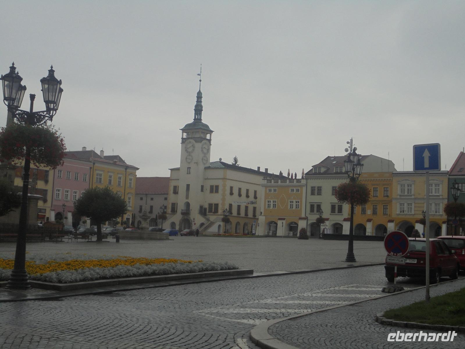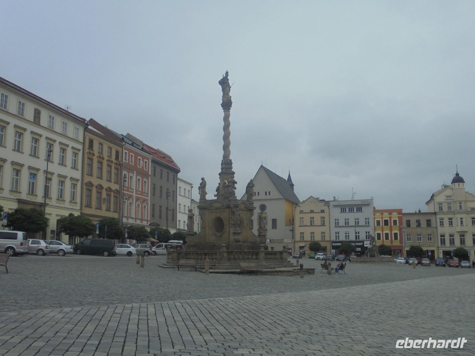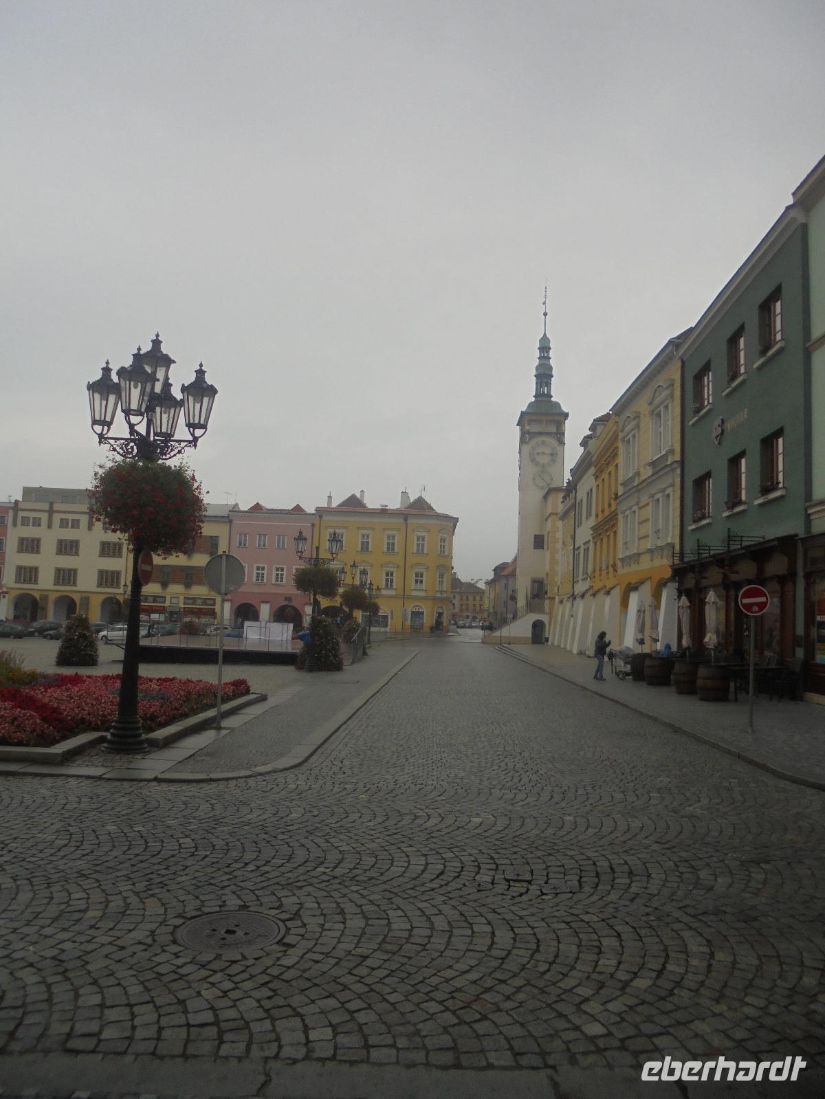 Wenige Schritte daneben liegt der Hauptplatz des historischen Ölmütz, der innere oder Hauptmarkt. Obermarktes oder „Oberrings" genannt, bilden seinen Blickfang das wuchtige Rathaus sowie die phantastisch verzierte Pestsäule. Historisch gesehen einst ein Kauf- und Gewerbehaus, das die reichen Zünften der Stadt betrieben, wird der Rathausbau von seinem 75 m hohen Turm überragt. Vom gotischen Gebäude mit zahlreichen Verzierungen war aber gerade aufgrund von Bauarbeiten nicht viel zu sehen.