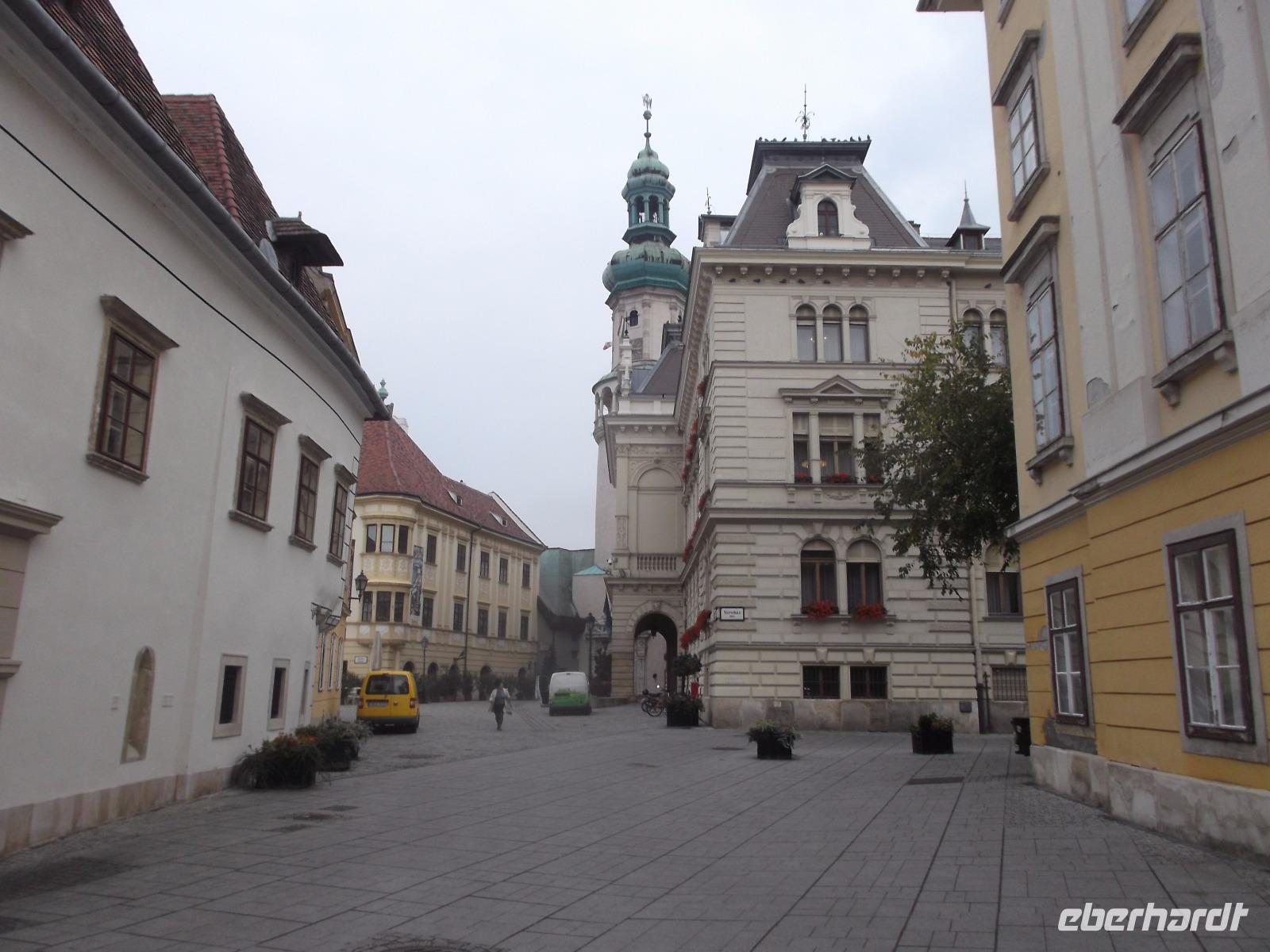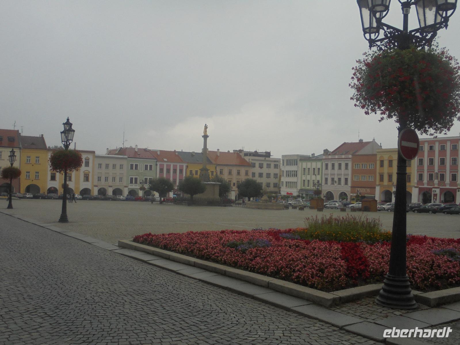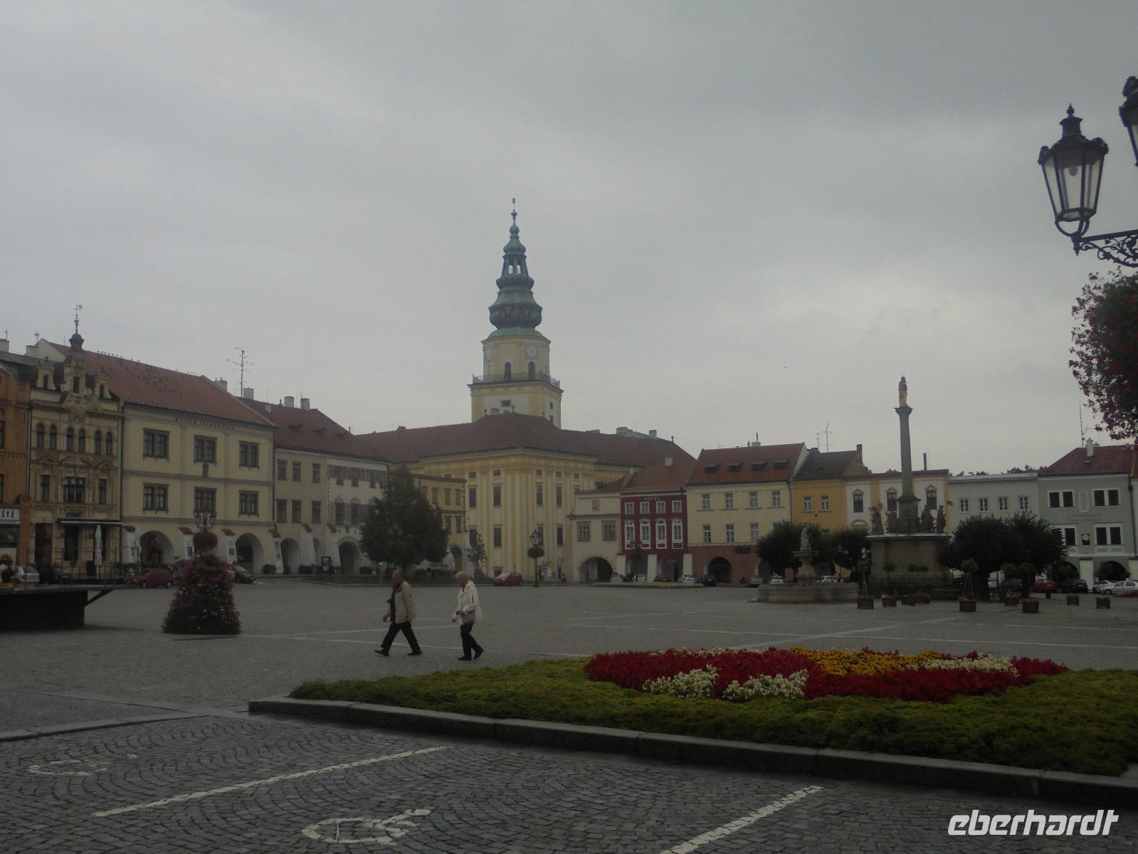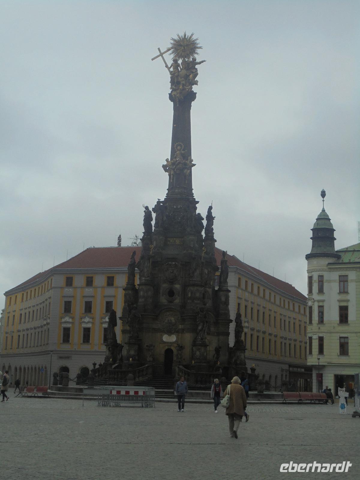 Wenige Schritte daneben liegt der Hauptplatz des historischen Ölmütz, der innere oder Hauptmarkt. Obermarktes oder „Oberrings" genannt, bilden seinen Blickfang das wuchtige Rathaus sowie die phantastisch verzierte Pestsäule. Historisch gesehen einst ein Kauf- und Gewerbehaus, das die reichen Zünften der Stadt betrieben, wird der Rathausbau von seinem 75 m hohen Turm überragt. Vom gotischen Gebäude mit zahlreichen Verzierungen war aber gerade aufgrund von Bauarbeiten nicht viel zu sehen.