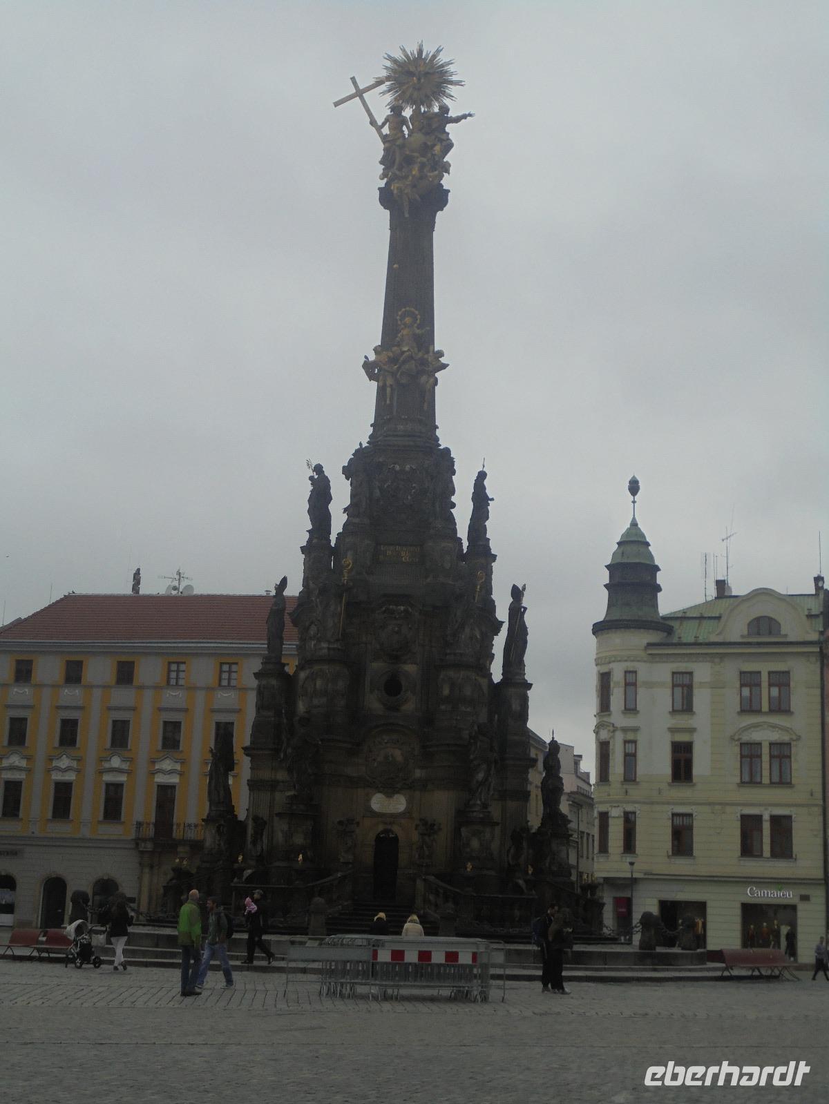 Das zweifellos bekannteste Olmützer Bauwerk und vielleicht auch sein schönstes ist die neben dem Rathaus stehende Dreifaltigkeitssäule des Architekten und Steinmetzen Wenzel Render. Das architektonische Juwel wurde 2001 in die Liste des UNESCO-Weltkulturerbes aufgenommen und ist für Europa mit seiner Kapelle im Sockel und seinem überreichen Figurenschmuck als Bauwerk einzigartig. Zudem hat es eine Höhe von 34 m und ist damit in dem an derartigen Gebäuden nicht gerade armen Europa die größte der erhaltenen Pestsäulen. Nach Überwindung der großen Pestepidemie 1716 in Mitteleuropa wurde sie als Dankesbau vom Olmützer Bildhauer Wenzel Render begonnen, der sie als Bildergalerie mit Sandsteinplastiken zum Dank für das Ende der Pestepidemie in Böhmen anlegte. Sein Lebenswerk förderte er über seinen Tod hinaus, denn er vermachte sein Privatvermögen der Stadt, damit diese für die Vollendung der Säule sorgen sollte.