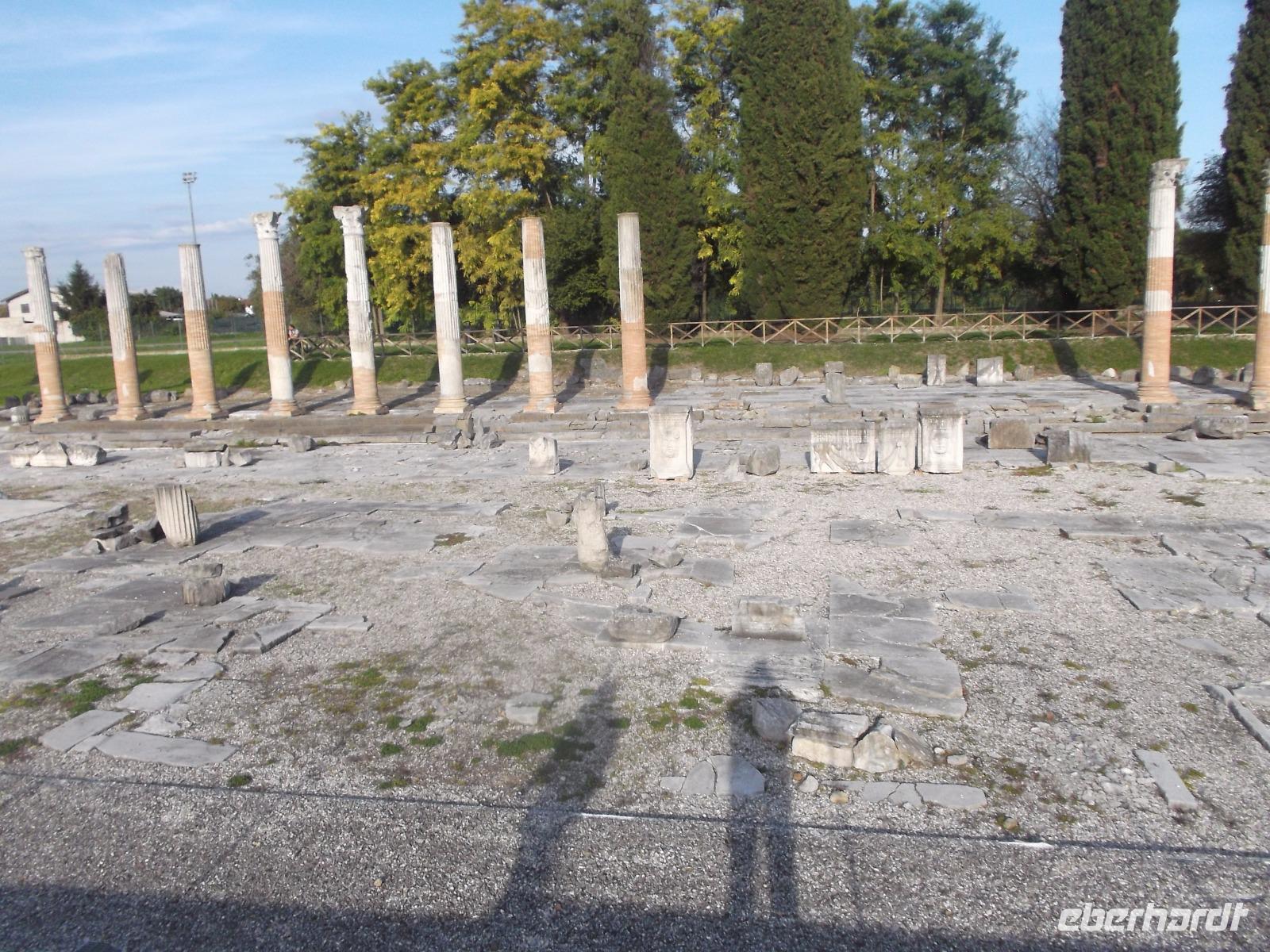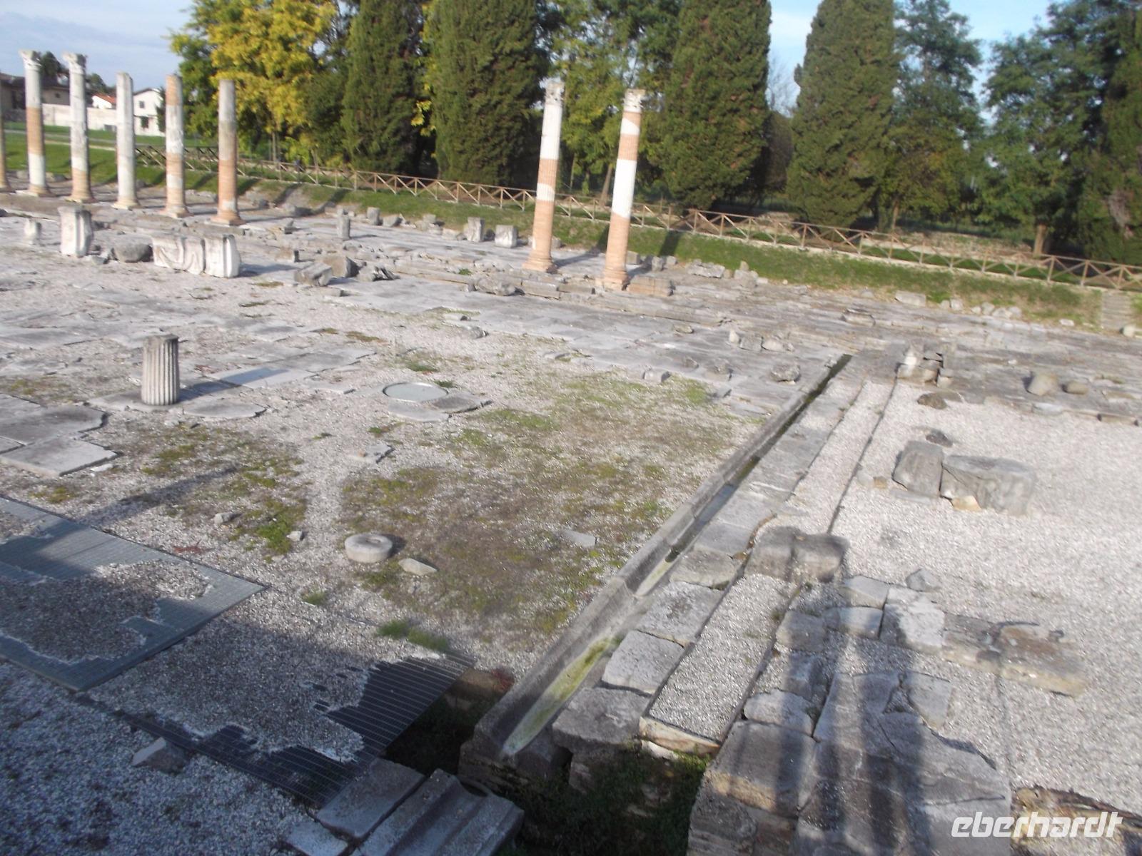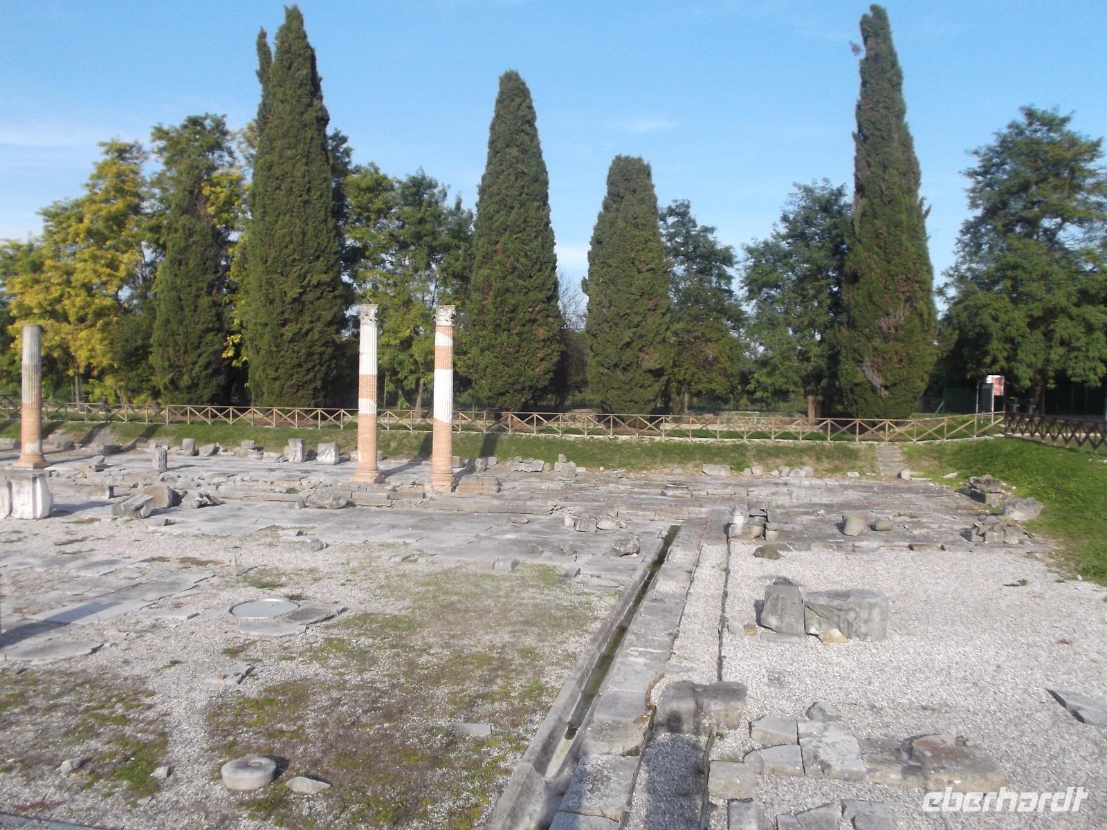 Nach dem Besuch der Basilika und ihrer grandiosen Mosaike hatten wir Zeit, noch an den Ausgrabungen und den Resten der antiken Stadt und des römischen Forums vorbeizuschlendern, die die Bedeutung des vorchristlichen Handelsplatzes und Verkehrszentrums Aquileia verdeutlichten: ursprünglicher Endpunkt der Handelsrouten wie Bernsteinstraße am Mittelmeer bis mindestens zur Völkerwanderungszeit, vor dem Aufstieg Venedigs zur Handelsmetropole an der Adria und bedeutender Anknüpfungspunkt an den Asienhandel und die weltweit bekannte Seidenstraße.