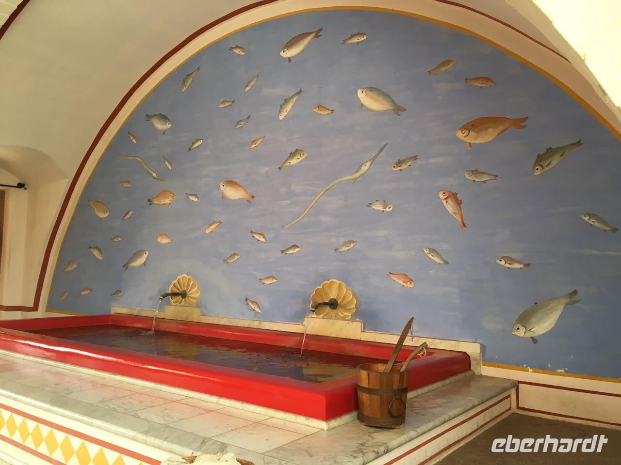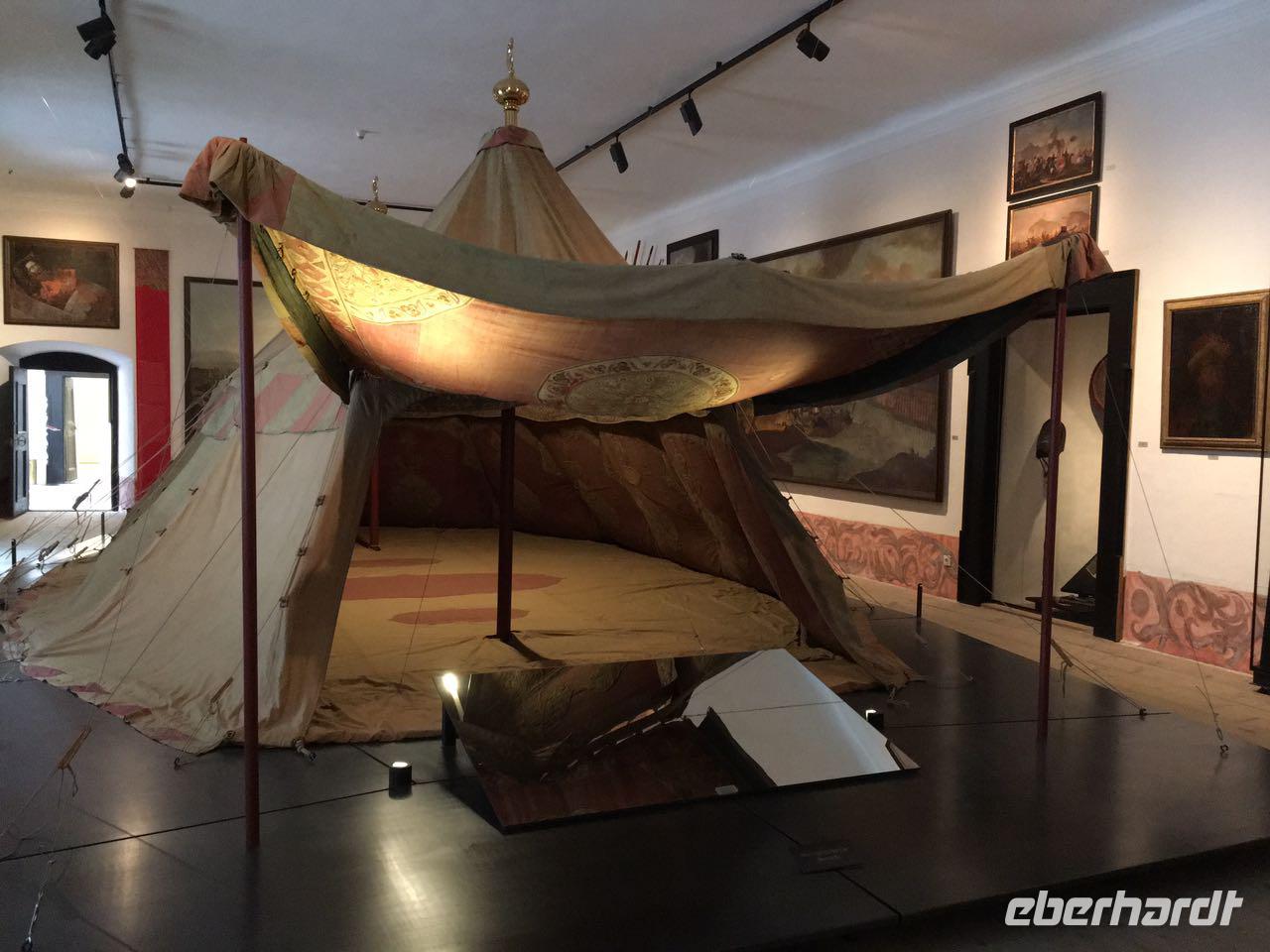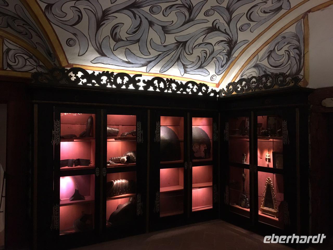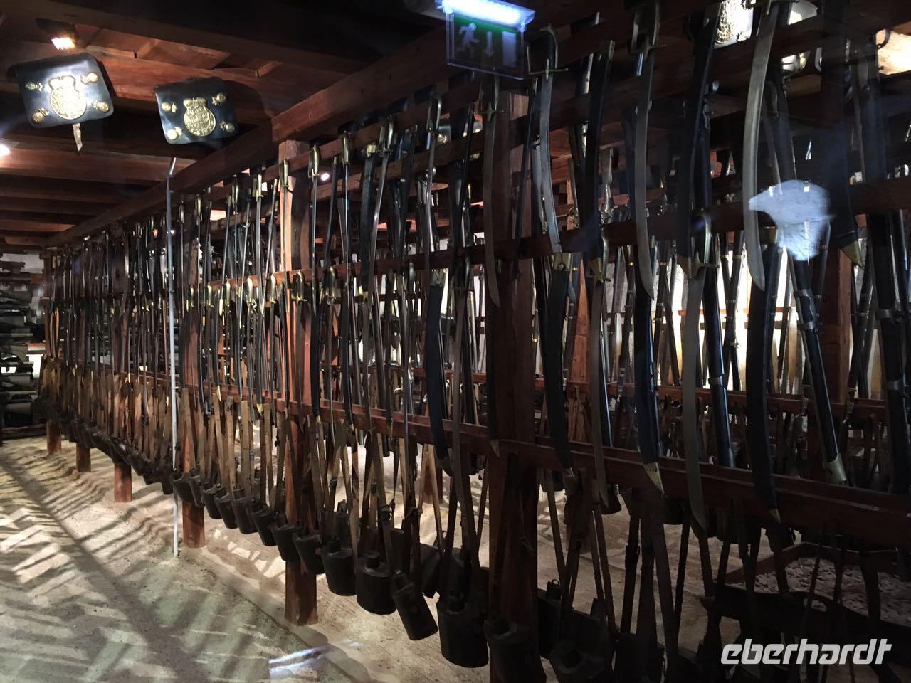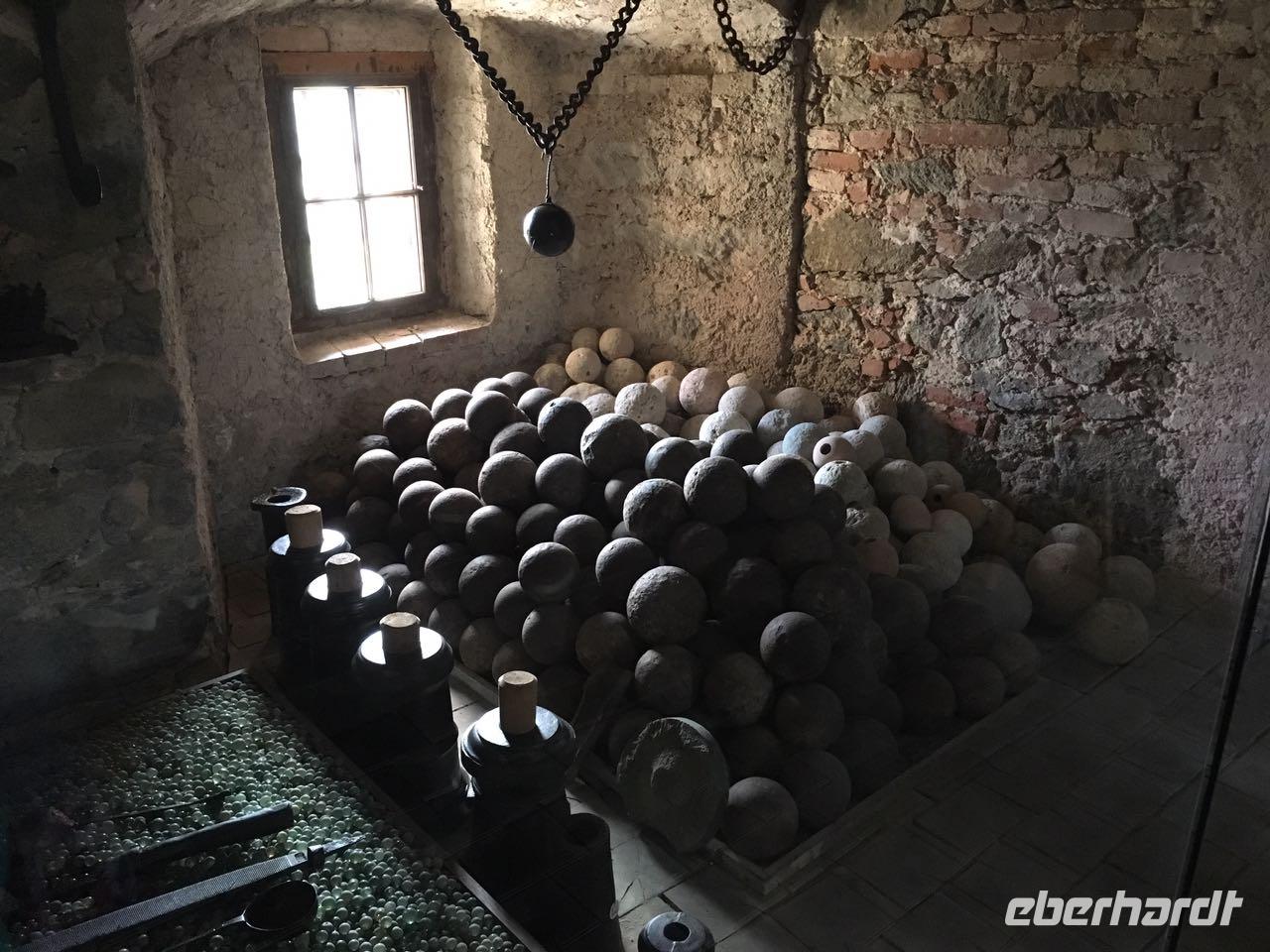Da die Eszterhazys von Anfang an Wert auf künstlerische Gestaltung, Repräsentation und übertriebene Darstellung der eigenen - teilweise ausgedachten - Vorfahren legten, wurde Burg Forchtenstein bald von einer Festung wurde sie zum prachtvollen Aufbewahrungsort für Waffen, das fürstliche Archiv und die fürstlichen Sammlungen, die Möbel, Uhren, exotische Tierpräparate, Schmuckgegenstände und „Wunderdinge" umfassten. Die Schatz- und Wunderkammern waren z.B. über einen Geheimgang erreichbar; die Türen konnten nur mit mehreren verschiedenen Schlüsseln geöffnet werden. Wir drangen ein in eine wunderbare Welt, die mit Beutestücken wie einem original erhaltenen Fürstenzelt aus der Zeit der Türkenkriege und Gemälden begann und mit ausgeprägten Waffensammlungen - darunter Kanonen, hunderte Lunten- und Steinschlossgewehre und gläserne Handgranaten - endete. Es waren unterhaltsame anderthalb Stunden, die wie im Fluge vergingen, als wir dann zum Abschluss noch dem erstaunlich tiefen Burgbrunnen unsere Aufmerksamkeit widmeten.