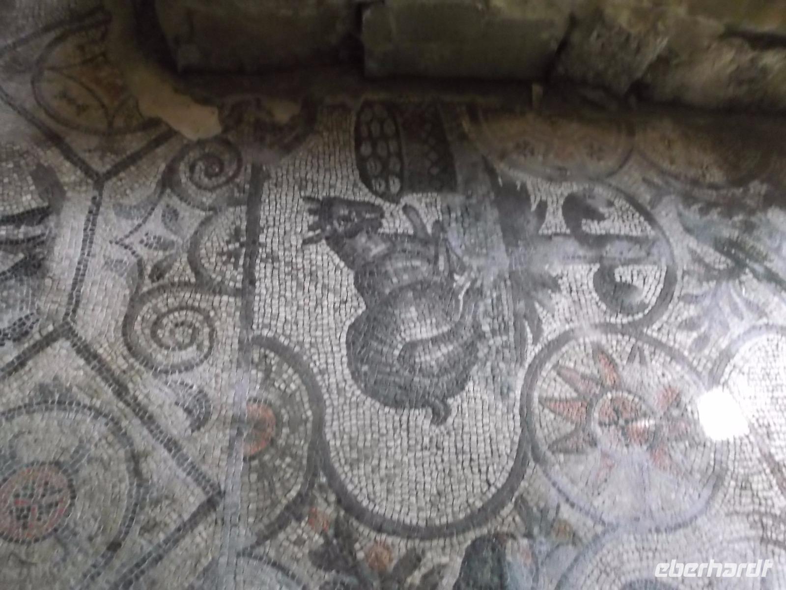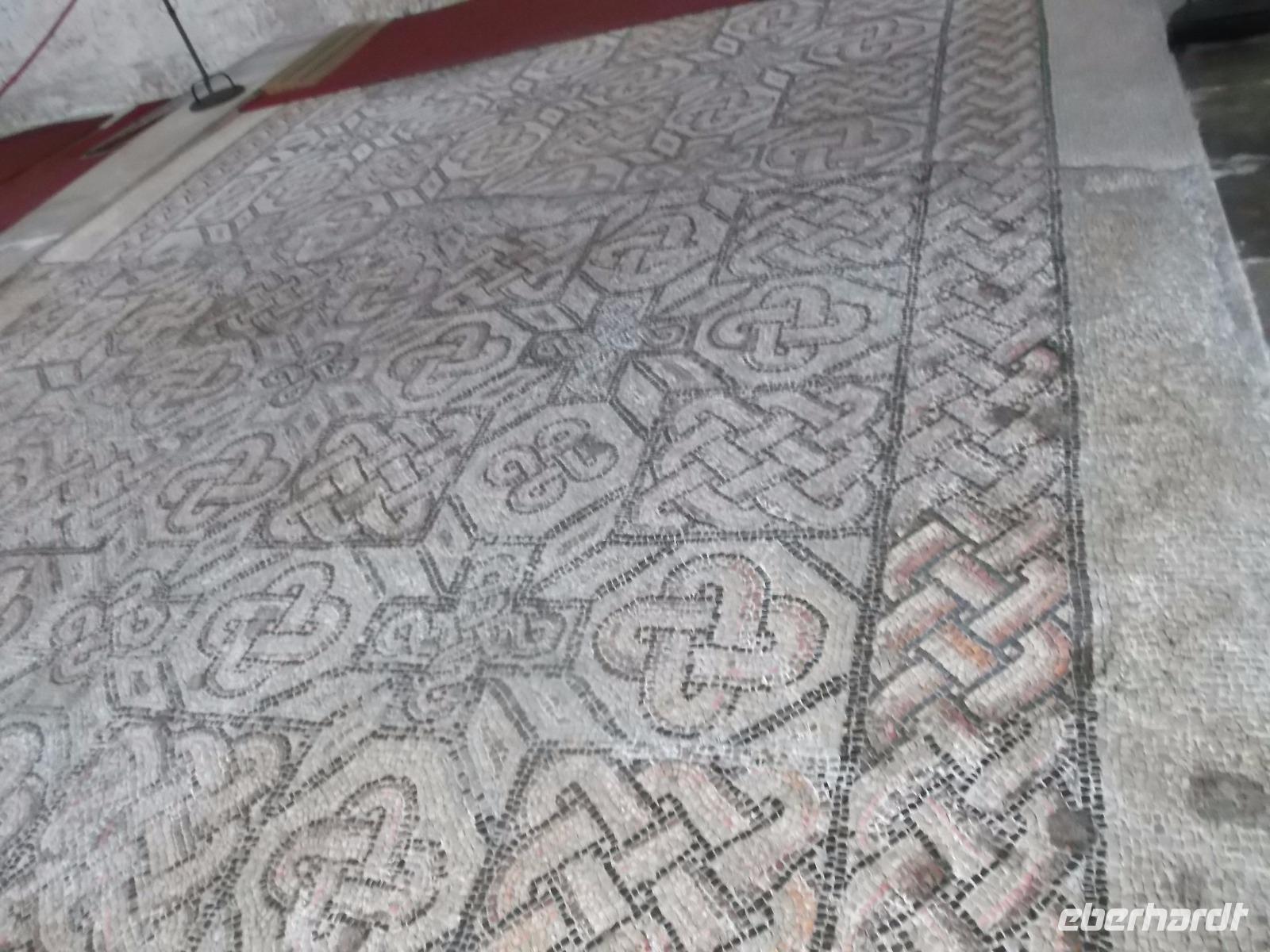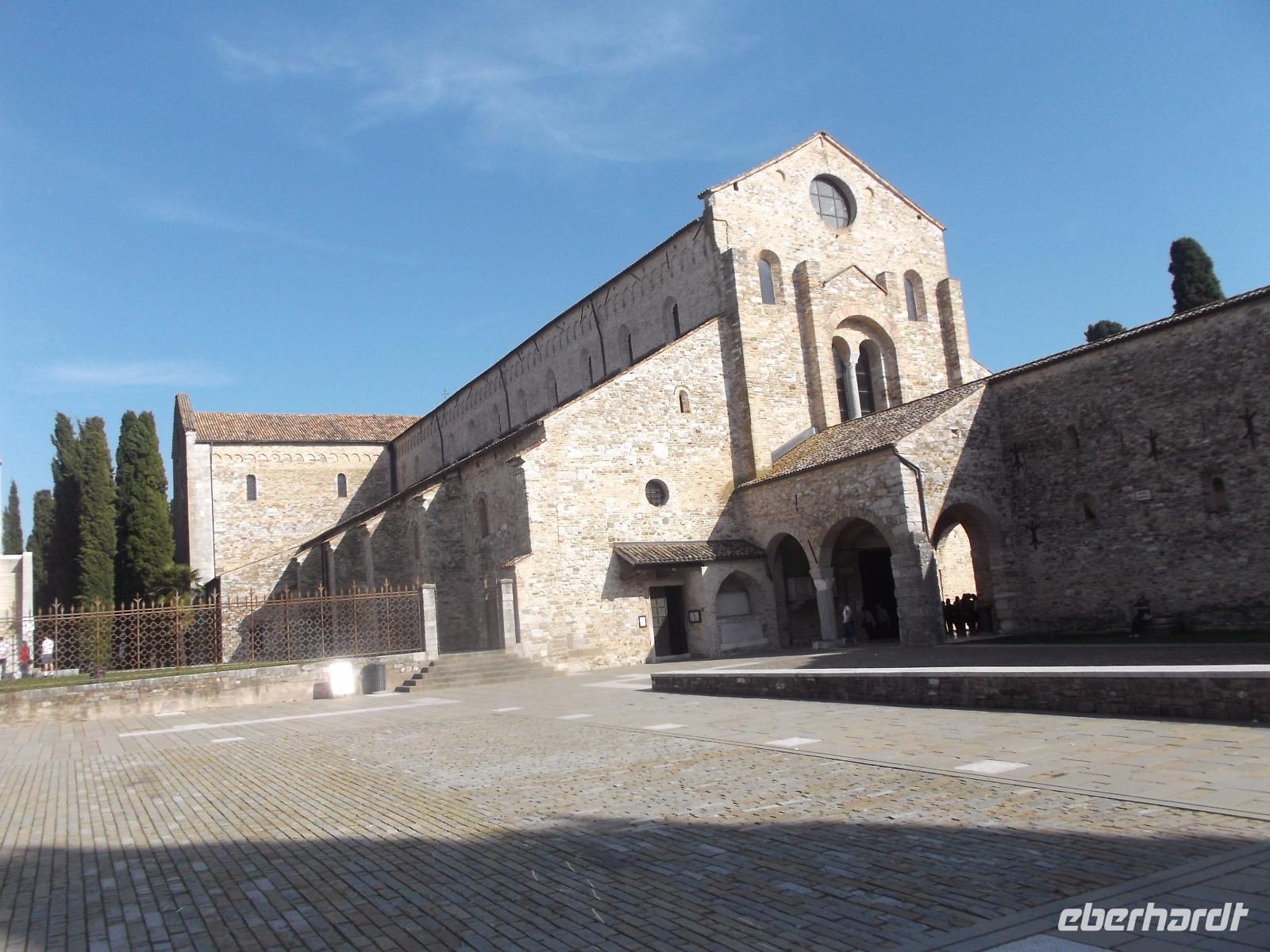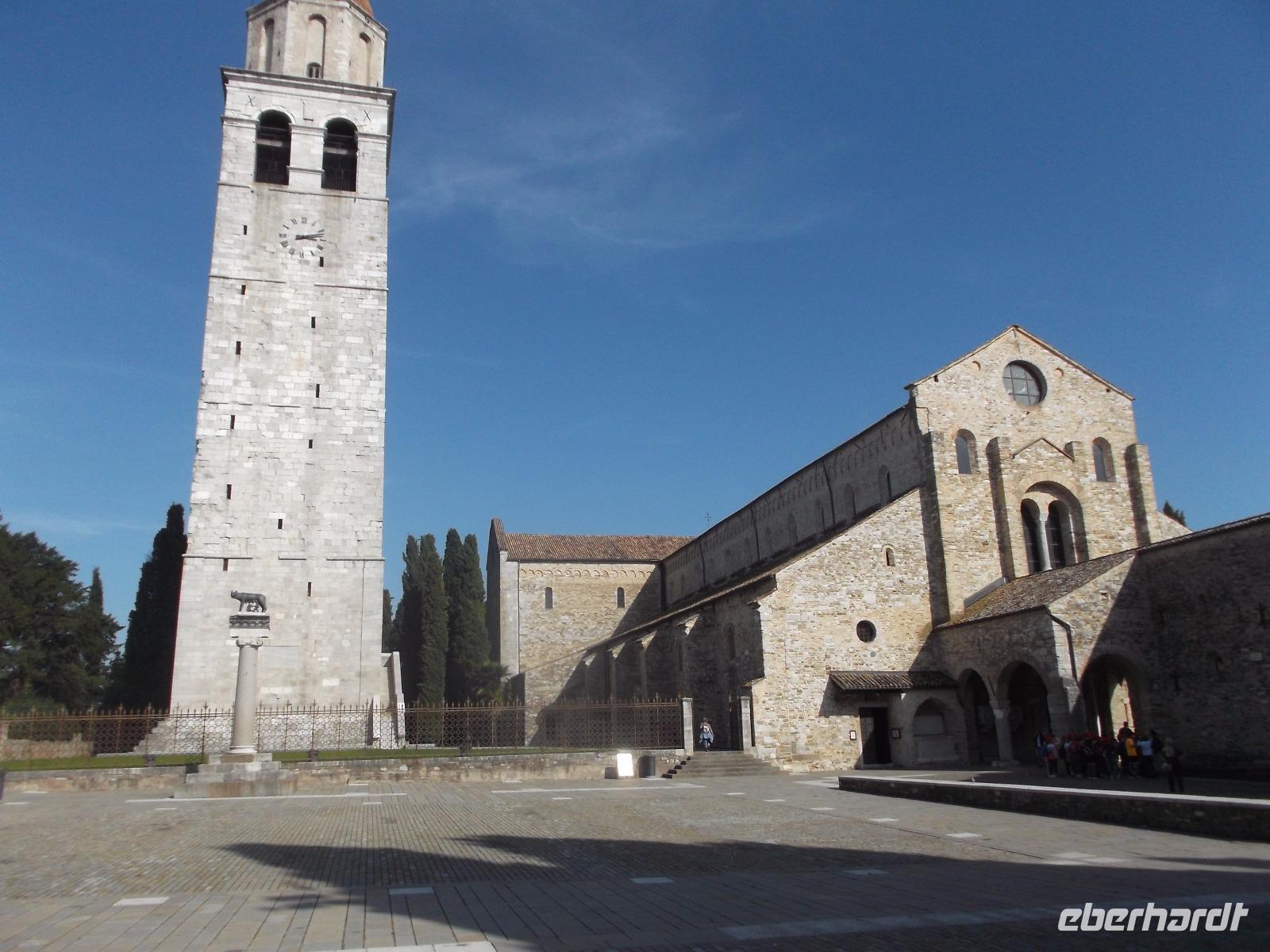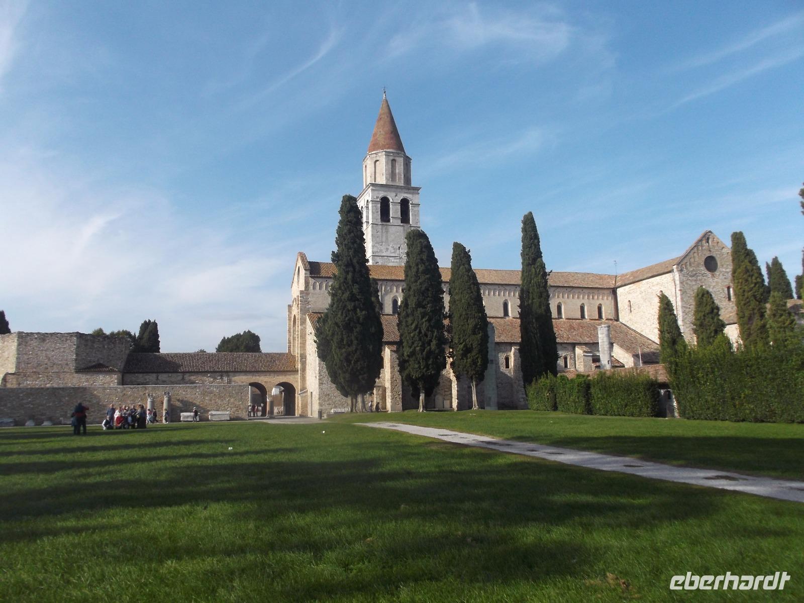 Unser nächstes Ziel war das nicht allzuweit entfernte Aquileia. In römischer, spätantiker und der Völkerwanderungszeit endeten hier zahlreiche Römerstraßen, wohl auch die Bernsteinstraße. Das war noch bevor sich die Stadt Venedig entwickelte. Aquileia war ein äußerst wichtiger Verkehrsknotenpunkt und hatte in der Kirchengeschichte immense Bedeutung, denn das Patriarchat von Aquileia, das erst im 18. Jh. aufgelöst wurde, als Aquileia schon seit Jahrhunderten kaum noch Bedetung besaß, soll von keinem Geringeren als dem heiligen Evangelisten Markus im Auftrag von Petrus eingerichtet worden sein. Dies erklärt die gewaltige, großartige frühchristliche Basilika hier, die schon lange zum Weltkulturerbe gehört. Hauptgrund dafür und Usprung der Berühmtheit des Ortes sind vor allem seine Mosaikböden. Sie stammen aus verschiedenen Zeitepochen, liegen teilweise in mehreren Schichten übereinander und bilden die größten frühchristlichen Mosaikflächen Italiens Aus der Zeit des Bischofs Theodorus um 300 n.Chr stammen die „theodorischen Mosaiken", über die spätere Bauten des 11. Jahrhunderts gesetzt wurde. Zum Teil auf Glasstegen laufend konnten wir die gewaltigen Ausdehnungen qualitätvoller Mosaiken bewundern, von denen allein nahe dem Glockenturm fast 650 m² zu besichtigen sind. Sie zeigen vor allem geometrische Formen und Tiere. Im Gegensatz zu den kämpferischen und Jagdszenen römischer Mosaike haben hier die Tieren betont ruhige Haltung - sollen sie doch den Charakter des friedlichen Zusammenlebens der neuen christlichen Religion versinnbildlichen.