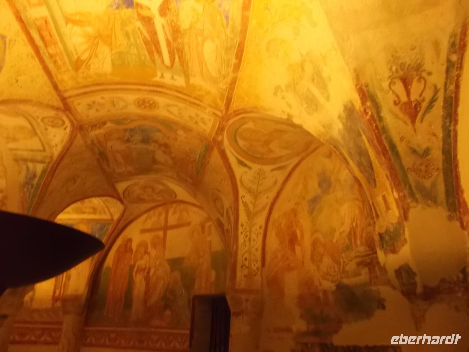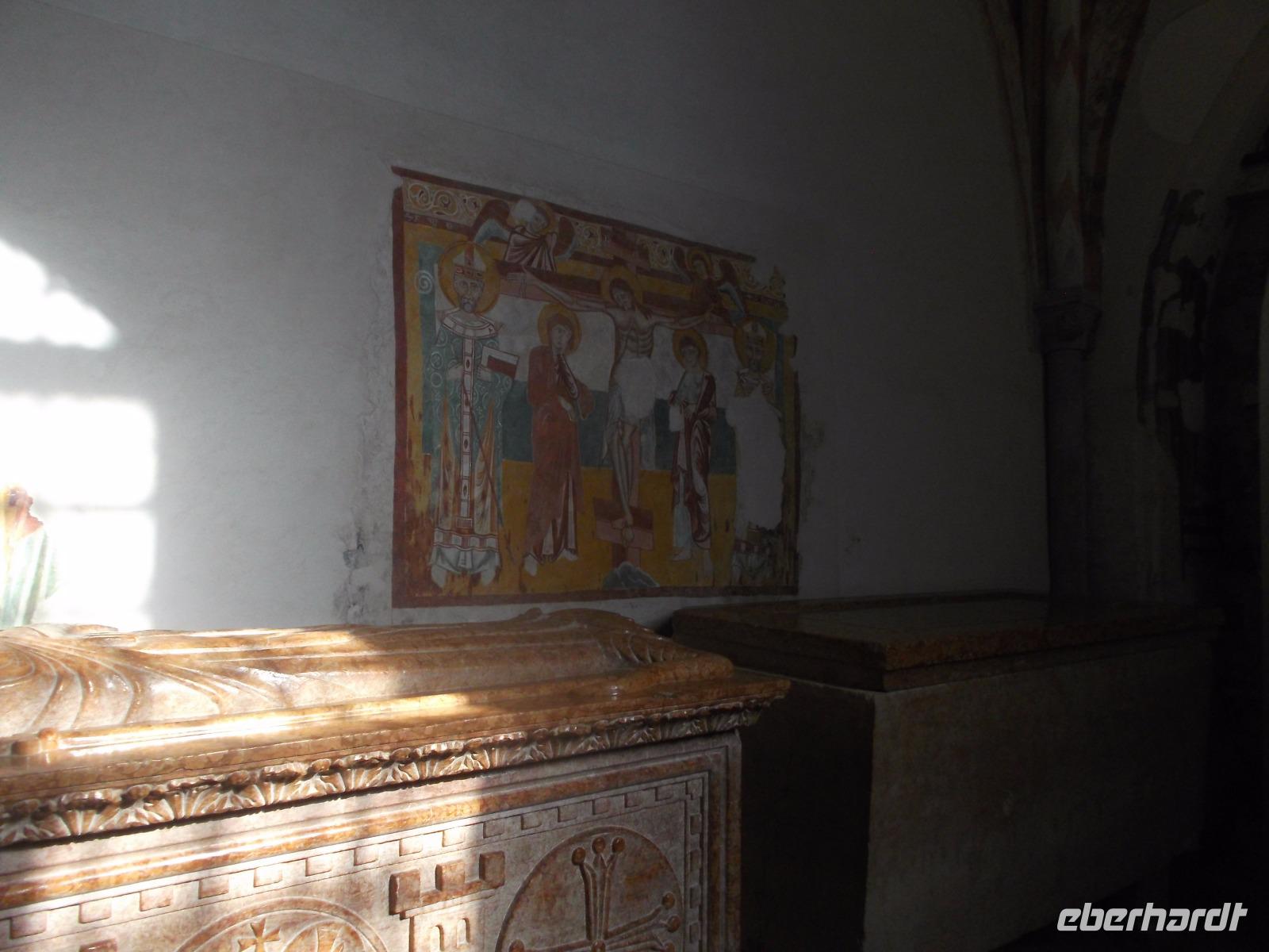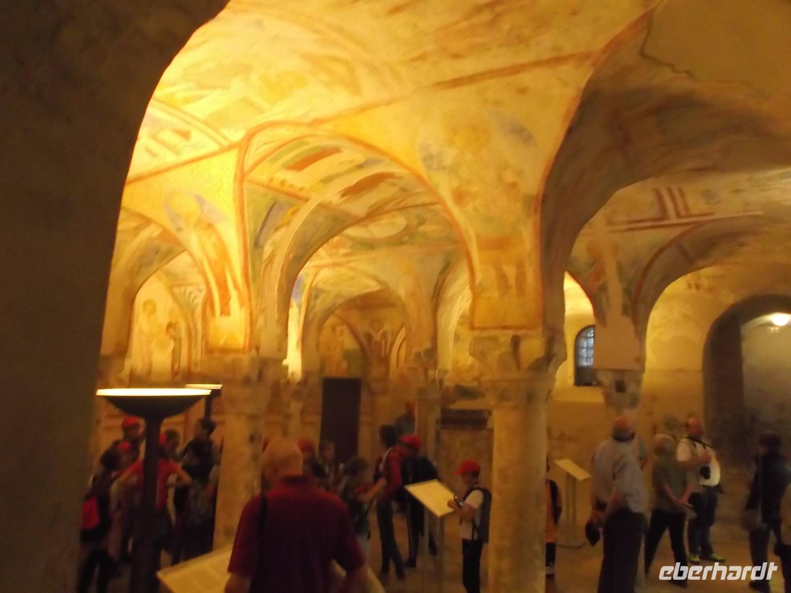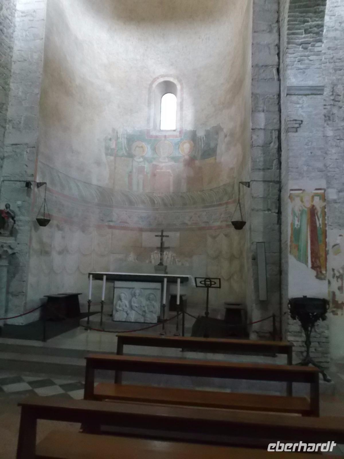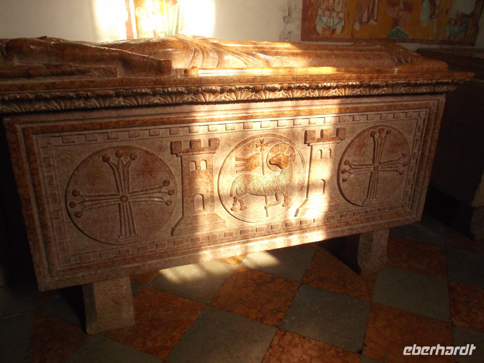 Unser nächstes Ziel war das nicht allzuweit entfernte Aquileia. In römischer, spätantiker und der Völkerwanderungszeit endeten hier zahlreiche Römerstraßen, wohl auch die Bernsteinstraße. Das war noch bevor sich die Stadt Venedig entwickelte. Aquileia war ein äußerst wichtiger Verkehrsknotenpunkt und hatte in der Kirchengeschichte immense Bedeutung, denn das Patriarchat von Aquileia, das erst im 18. Jh. aufgelöst wurde, als Aquileia schon seit Jahrhunderten kaum noch Bedetung besaß, soll von keinem Geringeren als dem heiligen Evangelisten Markus im Auftrag von Petrus eingerichtet worden sein. Dies erklärt die gewaltige, großartige frühchristliche Basilika hier, die schon lange zum Weltkulturerbe gehört. Hauptgrund dafür und Usprung der Berühmtheit des Ortes sind vor allem seine Mosaikböden. Sie stammen aus verschiedenen Zeitepochen, liegen teilweise in mehreren Schichten übereinander und bilden die größten frühchristlichen Mosaikflächen Italiens Aus der Zeit des Bischofs Theodorus um 300 n.Chr stammen die „theodorischen Mosaiken", über die spätere Bauten des 11. Jahrhunderts gesetzt wurde. Zum Teil auf Glasstegen laufend konnten wir die gewaltigen Ausdehnungen qualitätvoller Mosaiken bewundern, von denen allein nahe dem Glockenturm fast 650 m² zu besichtigen sind. Sie zeigen vor allem geometrische Formen und Tiere. Im Gegensatz zu den kämpferischen und Jagdszenen römischer Mosaike haben hier die Tieren betont ruhige Haltung - sollen sie doch den Charakter des friedlichen Zusammenlebens der neuen christlichen Religion versinnbildlichen.