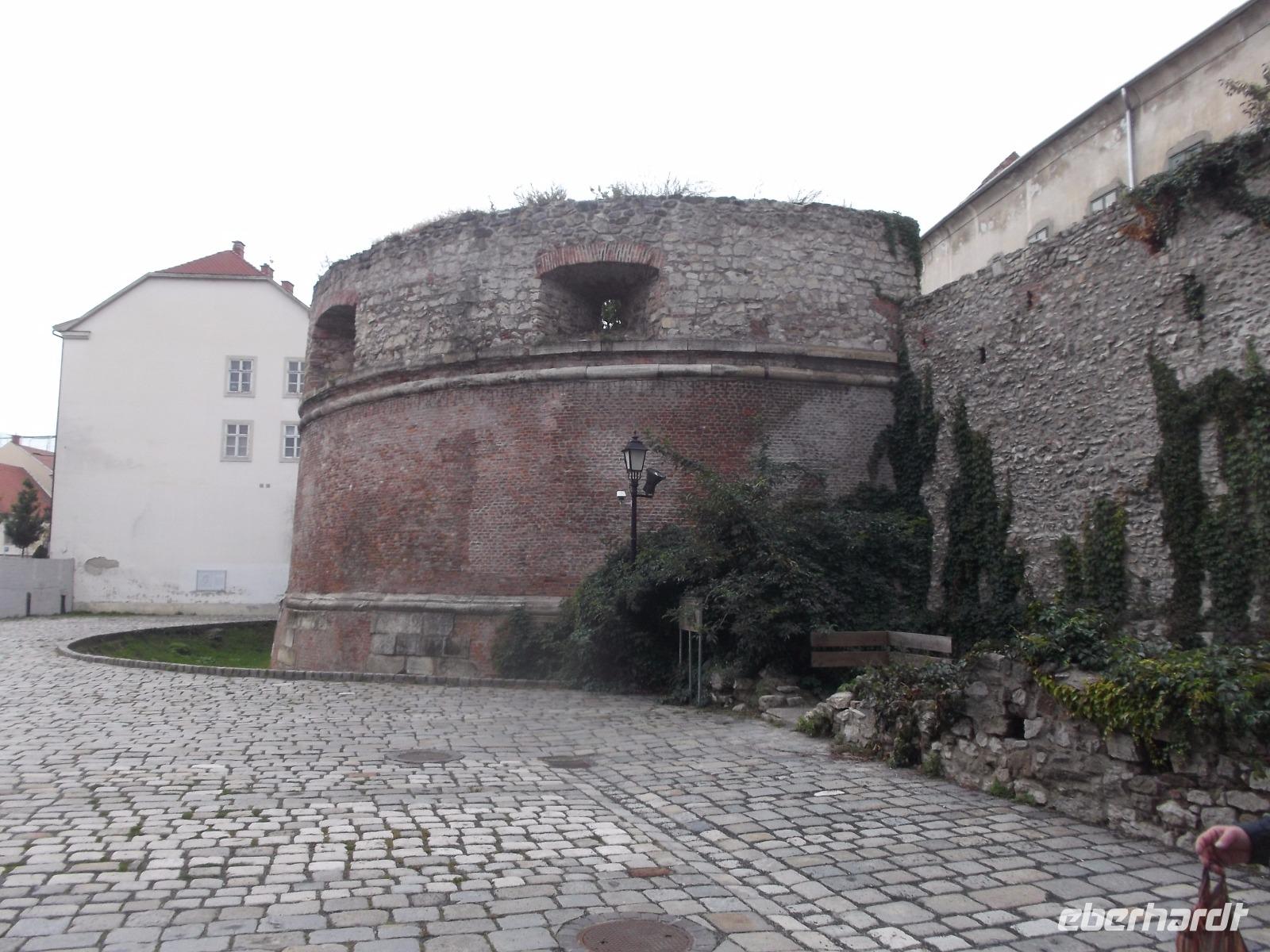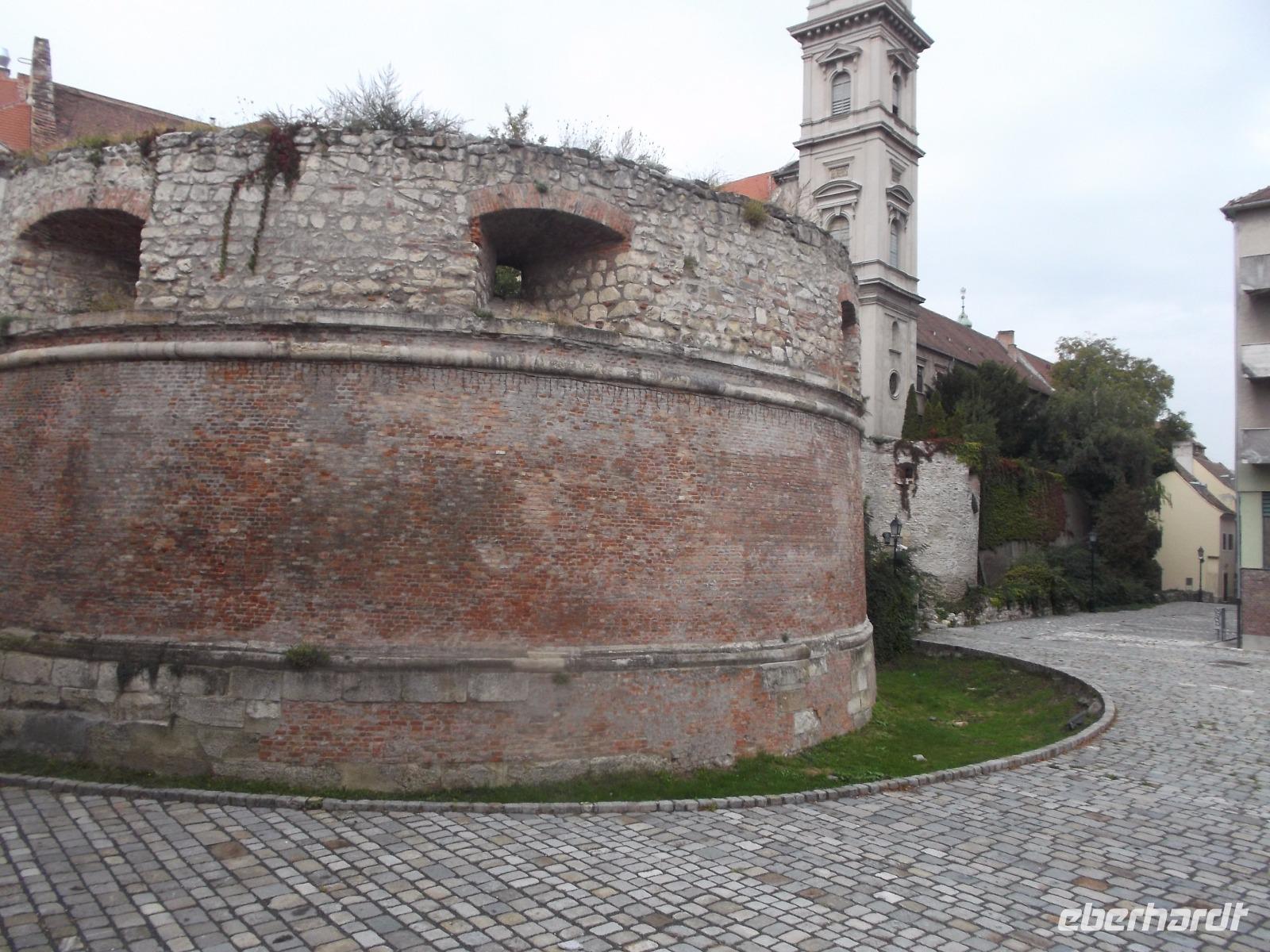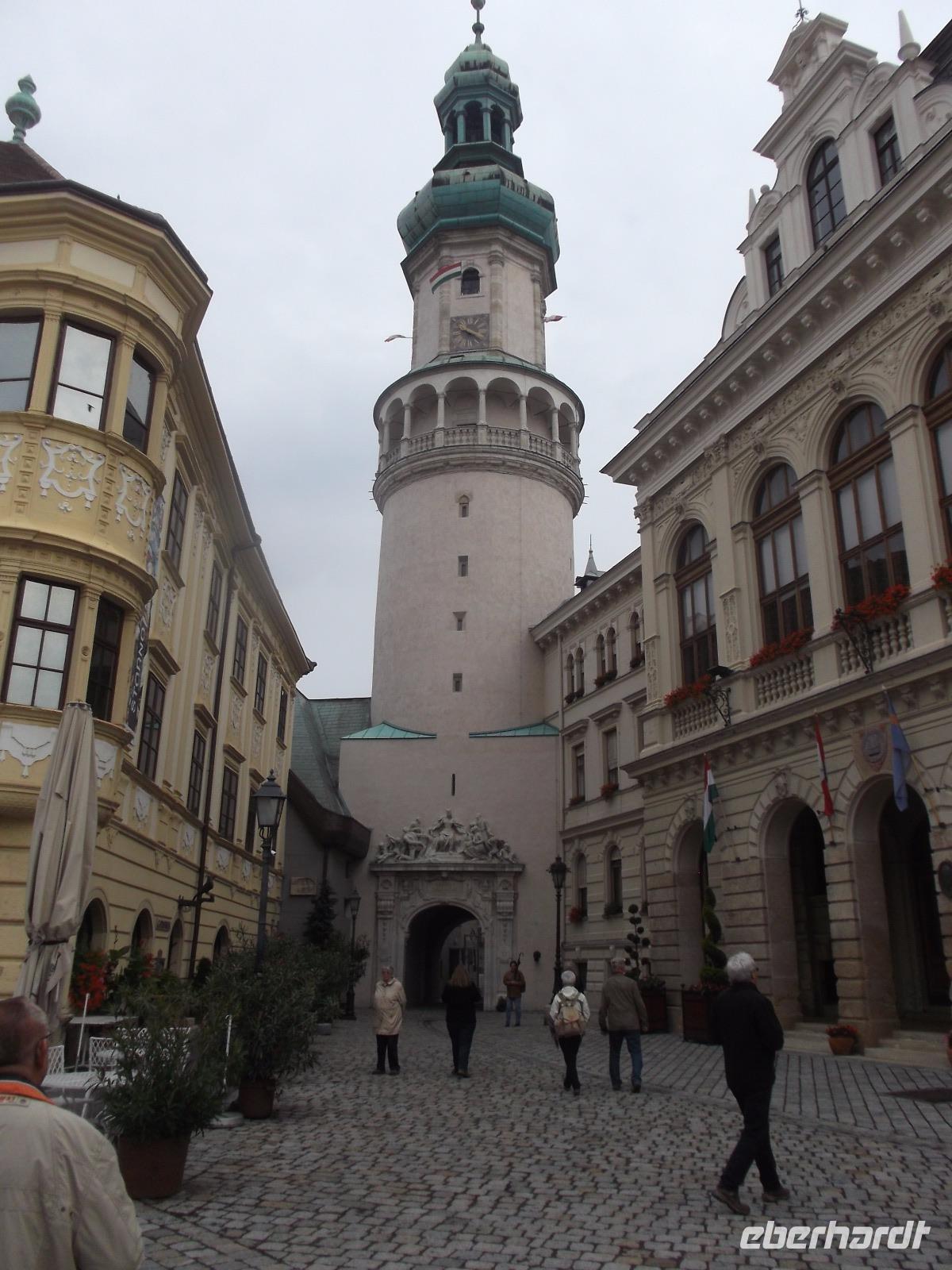 Stadtführerin Katalina führte uns durch die Altstadt und ihre Geschichte - von den Stadtmauerresten mit ihren Bastionen bis zum Wahrzeichen der Stadt, dem Feuerturm mit Stadttor, dessen Grundmauern auch noch aus der römischen Epoche stammen. Ödenburg ist damit eine der ältesten Städte Ungarns. Auf dem Marktplatz ist tatsächlich in der Pflasterung ein Hinweis auf die alte Bernsteinstraße zu erkennen und im Eingangsbereich der Touristeninformation finden sich echte ergrabene Reste der historischen Bernsteinstraße aus Römerzeiten.