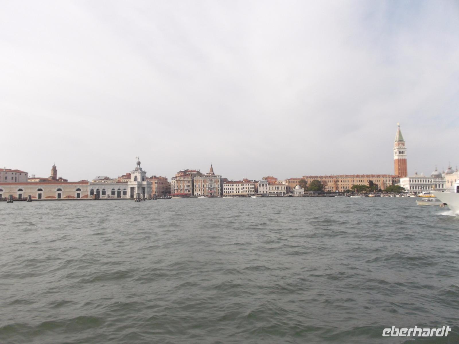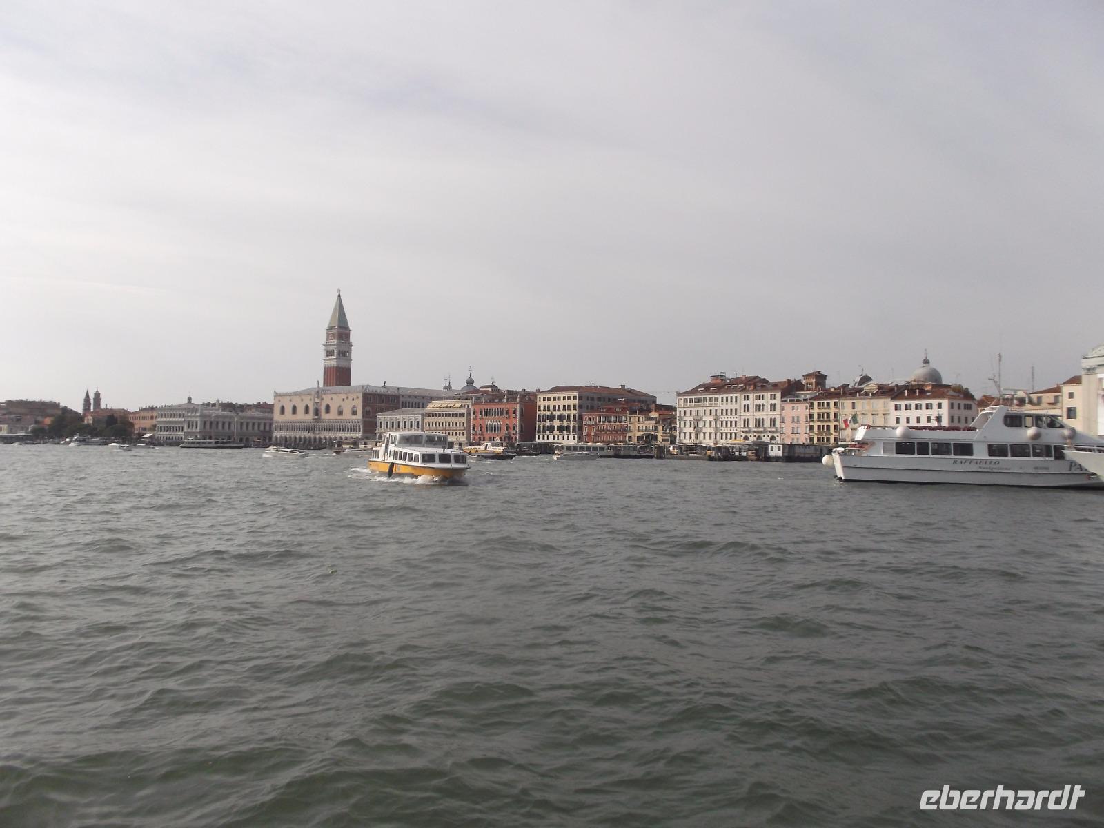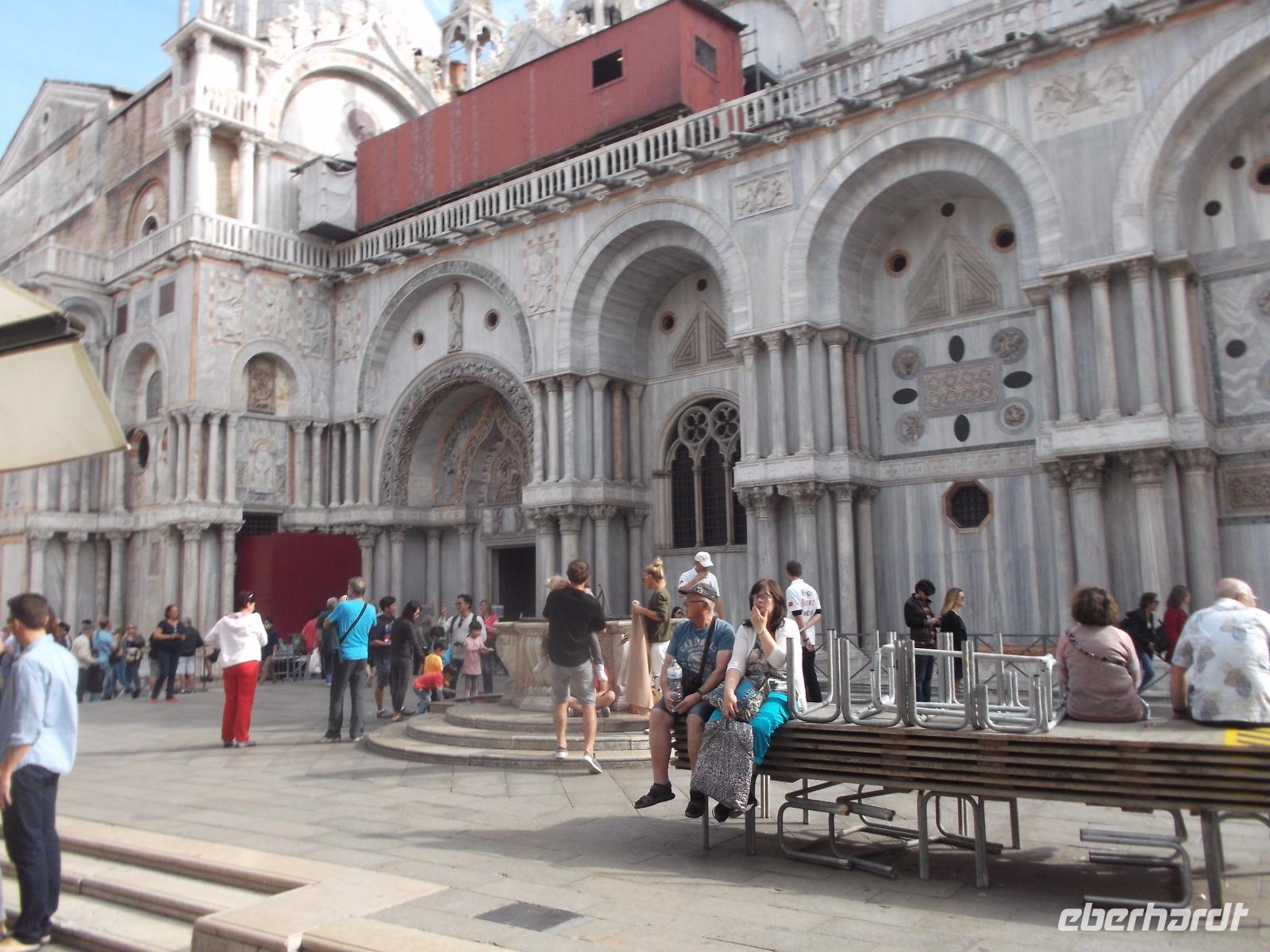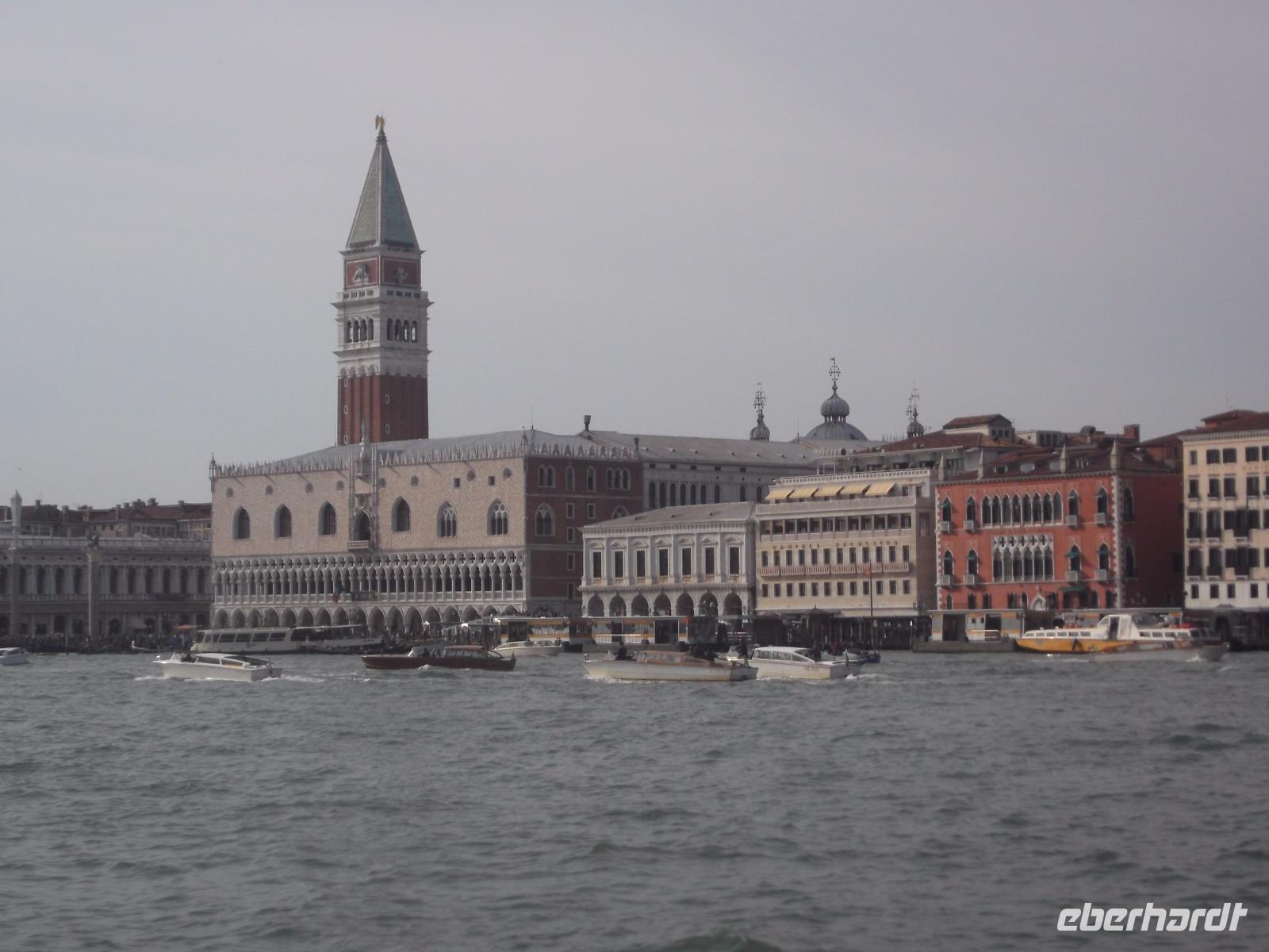 Von hier aus ging es zum Herzen der Lagunenstadt, dem Markusplatz. Zwar gilt als sein Wahrzeichen wohl der weithin sichtbare, nachts mitunter früher als Leuchtturm verwendete Campanile. Aber er und die bedeutenden Bauten wie der aus dem 13. - 17. Jh. stammende Markusdom, das Staatsheiligtum der Republik Venedig bis zu ihrer Auflösung 1797 und der Dogenpalast aus dem 14./15. Jh. stehen eigenlich gar nicht am Markusplatz, sondern davor, zum Wasser der Lagune hin.
