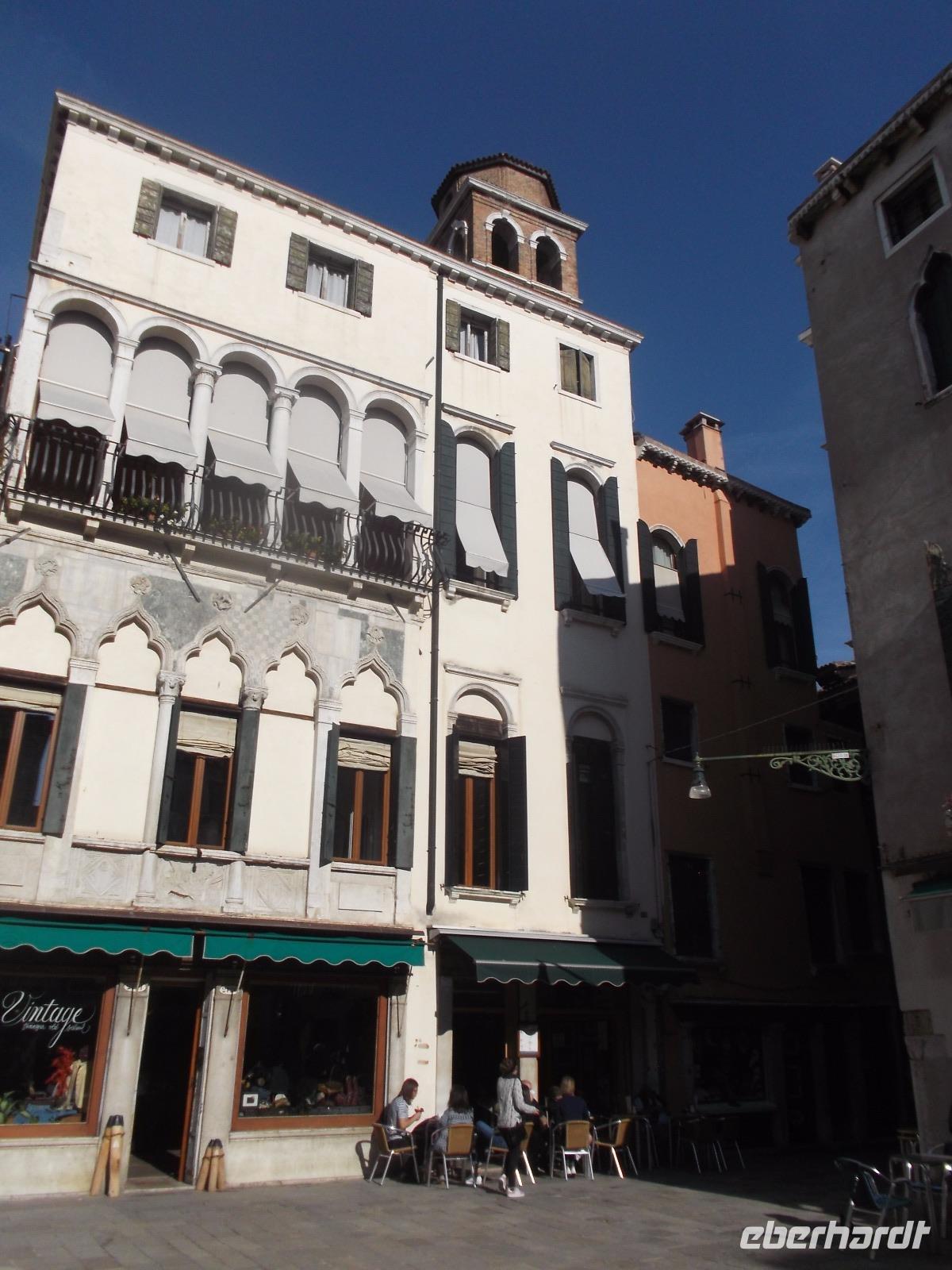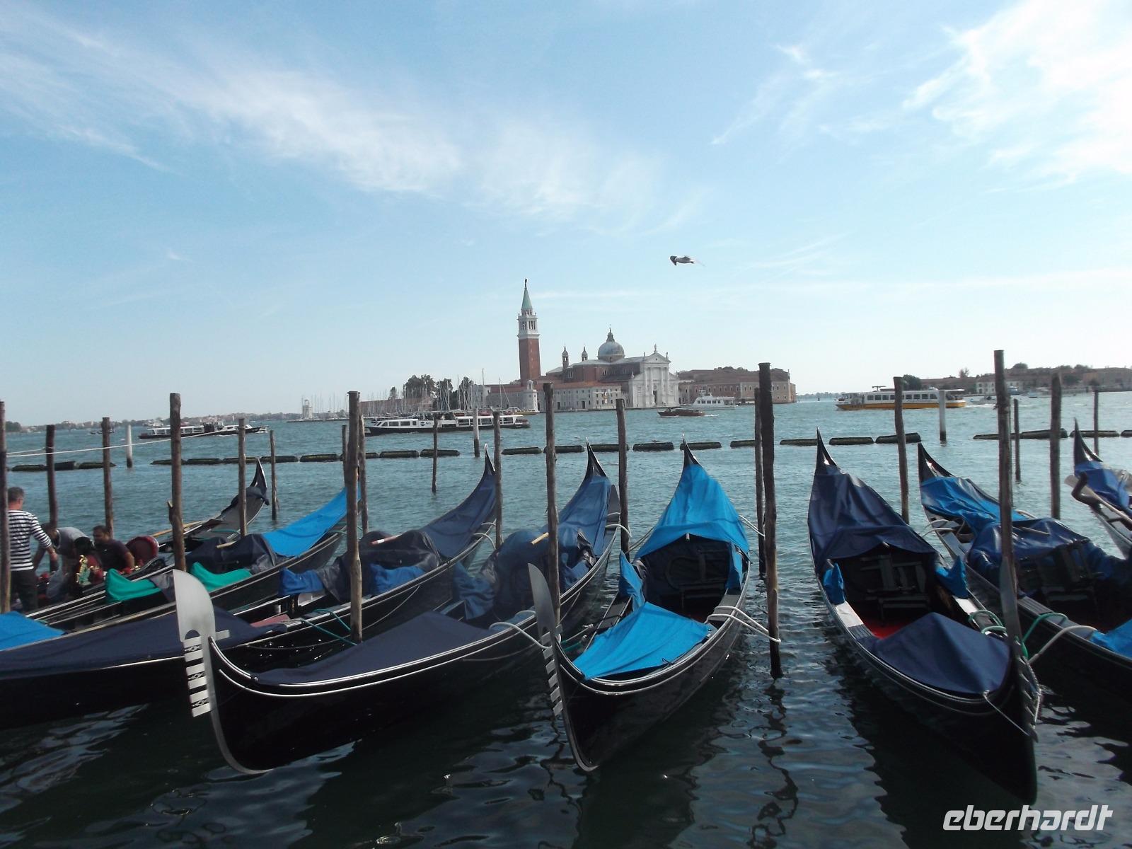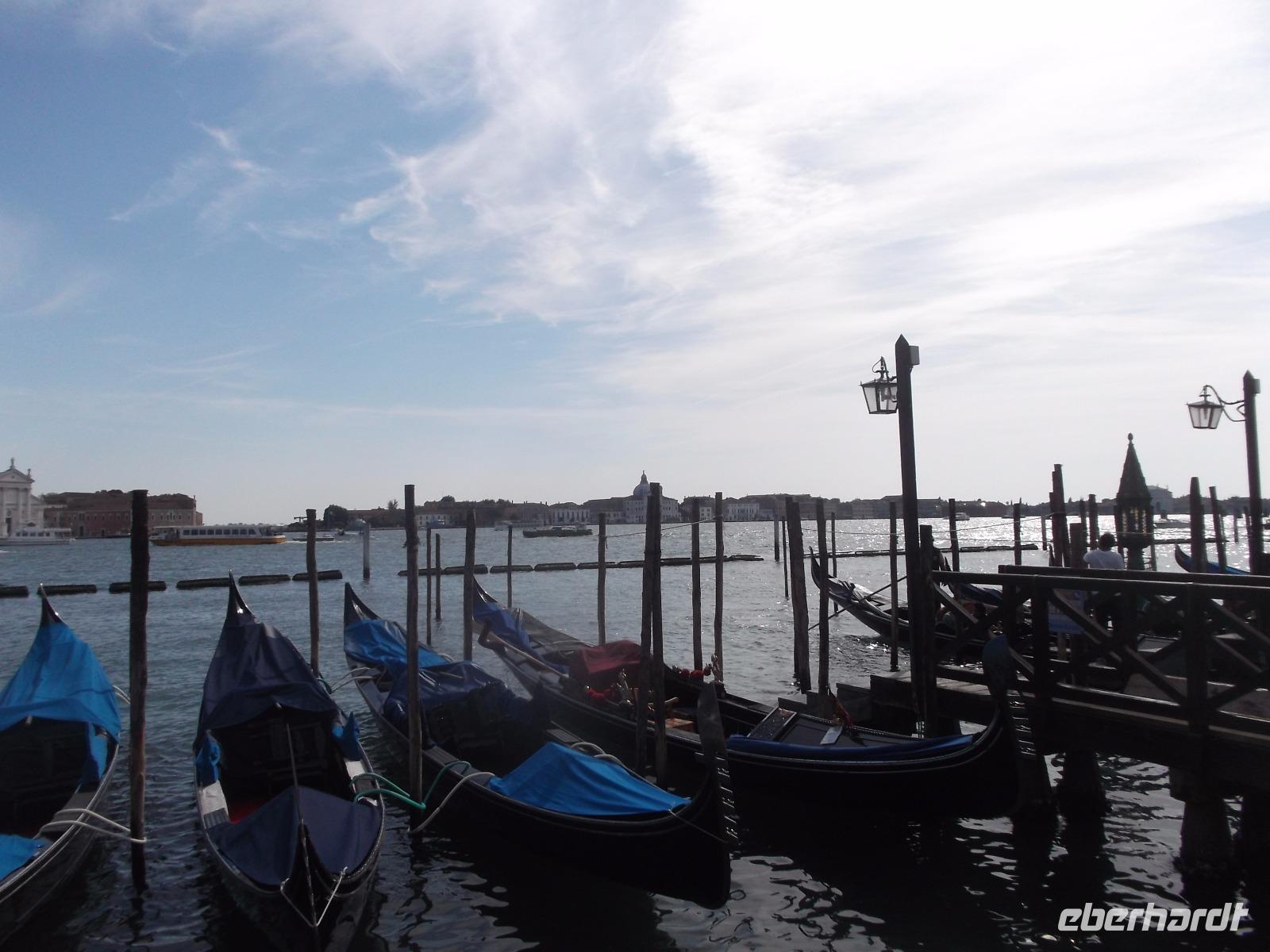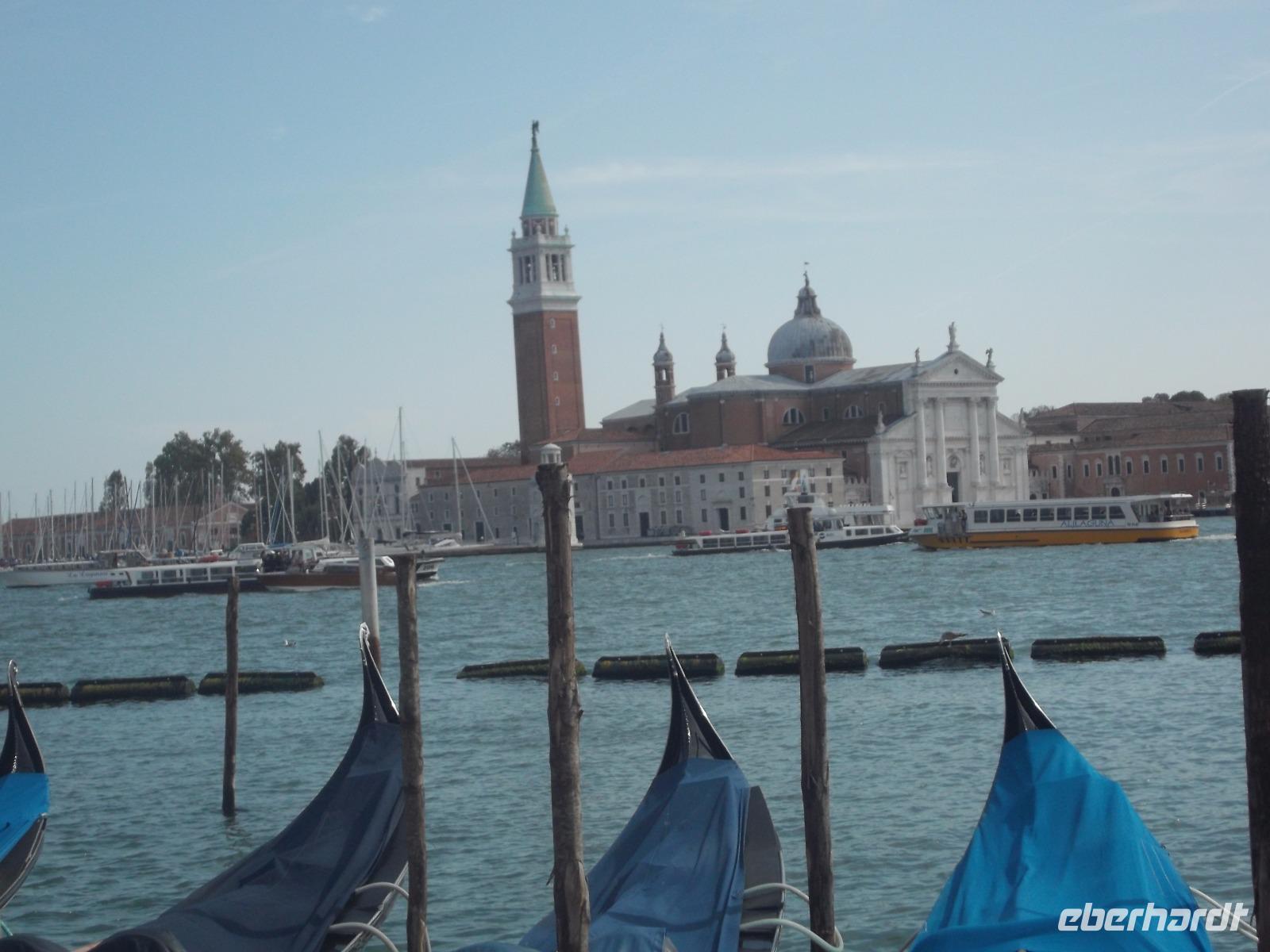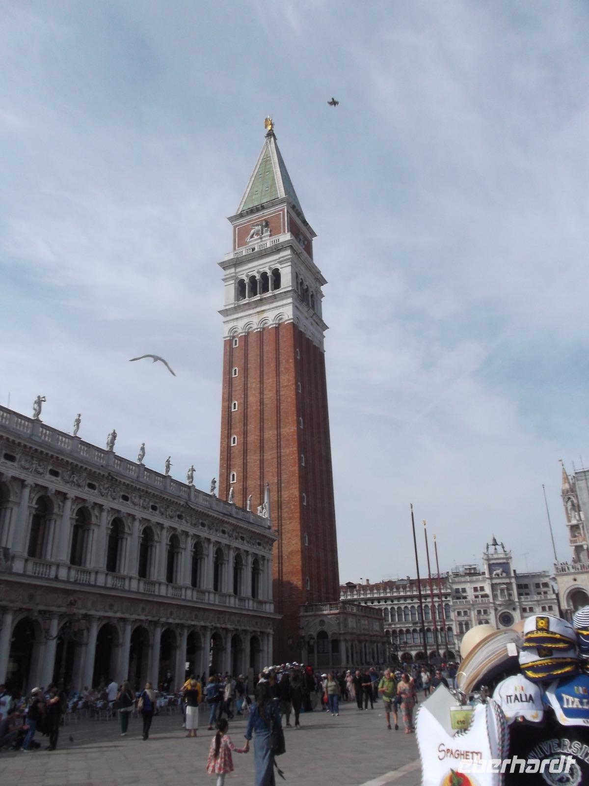Von hier aus ging es zum Herzen der Lagunenstadt, dem Markusplatz. Zwar gilt als sein Wahrzeichen wohl der weithin sichtbare, nachts mitunter früher als Leuchtturm verwendete Campanile. Aber er und die bedeutenden Bauten wie der aus dem 13. - 17. Jh. stammende Markusdom, das Staatsheiligtum der Republik Venedig bis zu ihrer Auflösung 1797 und der Dogenpalast aus dem 14./15. Jh. stehen eigenlich gar nicht am Markusplatz, sondern davor, zum Wasser der Lagune hin.