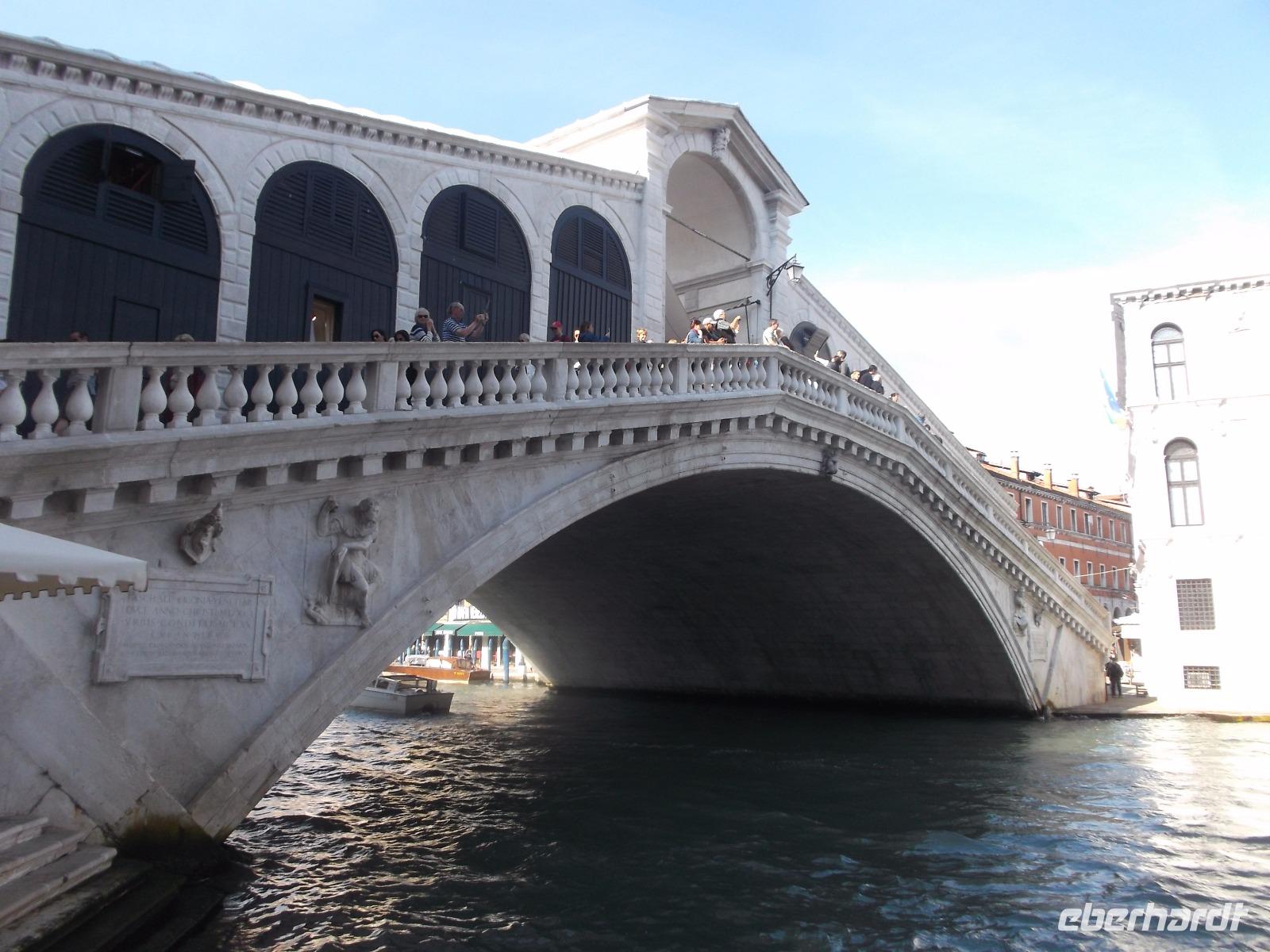 Die 48 m lange, 22 m breite und auf beiden Seiten bebaute Verbindung über den Canale Grande ist die wohl bekannteste Brücke der Lagunenstadt. Schneeweiß schimmernd überspannt sie seit über 420 Jahren den breitesten Kanal Venedigs. Interessant ist, dass in der Stadt buchstäblich JEDES Gebäude auf eingerammten Pfählen als Fundament errichtet werden musste - die Rialto-Brücke bildet da keine Ausnahme: auf jeweils etwa 6000 Pfählen ist jedes ihrer beiden Widerlager gegründet.