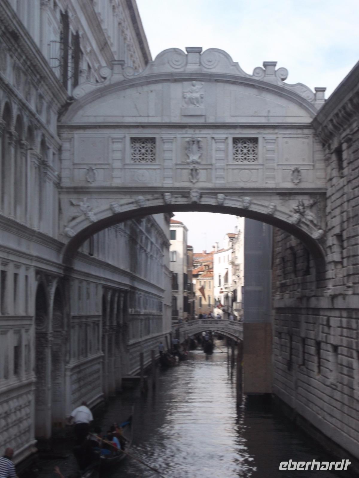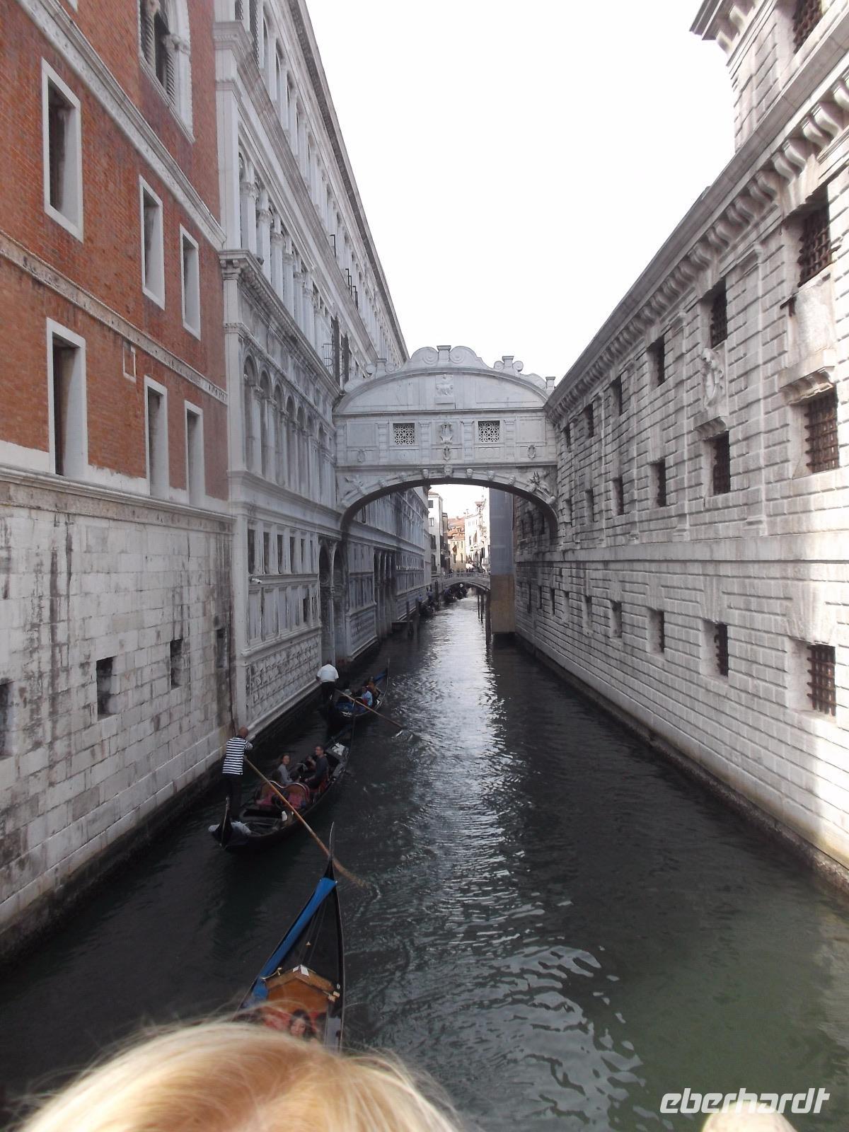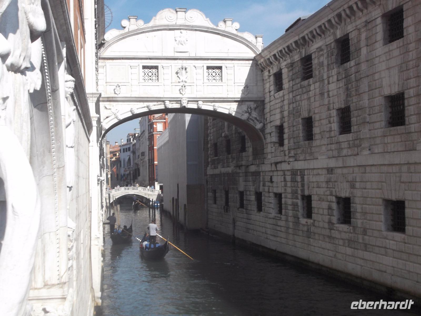 Nach Verabschiedung von Stadtführer Massimo gingen wir noch gemeinsam am Campanile und den Säulen mit den beiden Stadtheiligen Markus und Theodorus vorbei zur Wasserseite des Dogenpalastes, an dessen anderer Außenwand sich die berühmte Seufzerbrücke befindet, die die Verbindung vom Palast zum Gefängnis herstellt, die durch einen schmalen Seitenkanal getrennt sind. Hier wurden angeblich die von venezianischen Gerichten Verurteilten zur Haft oder zur Exekution vom Palast in die Gefängnisräume geleitet. Ihren heutigen Namen erhielt die zu Anfang des 17. Jh. gestaltete Brücke erst im Zeitalter der Romantik wo man sich vorstellte, dass die Gefangenen auf ihrem Weg ins Gefängnis von hier aus zum letzten Mal einen tränenreichen Blick in die Freiheit der Lagune werfen konnten. Von hier aus gab es dann für alle Freizeit - für eigene Unternehmungen, einen Besuch im Dom oder Dogenpalast vielleicht, für den man aber anstehen musste oder für typisch venezianische Pizza...