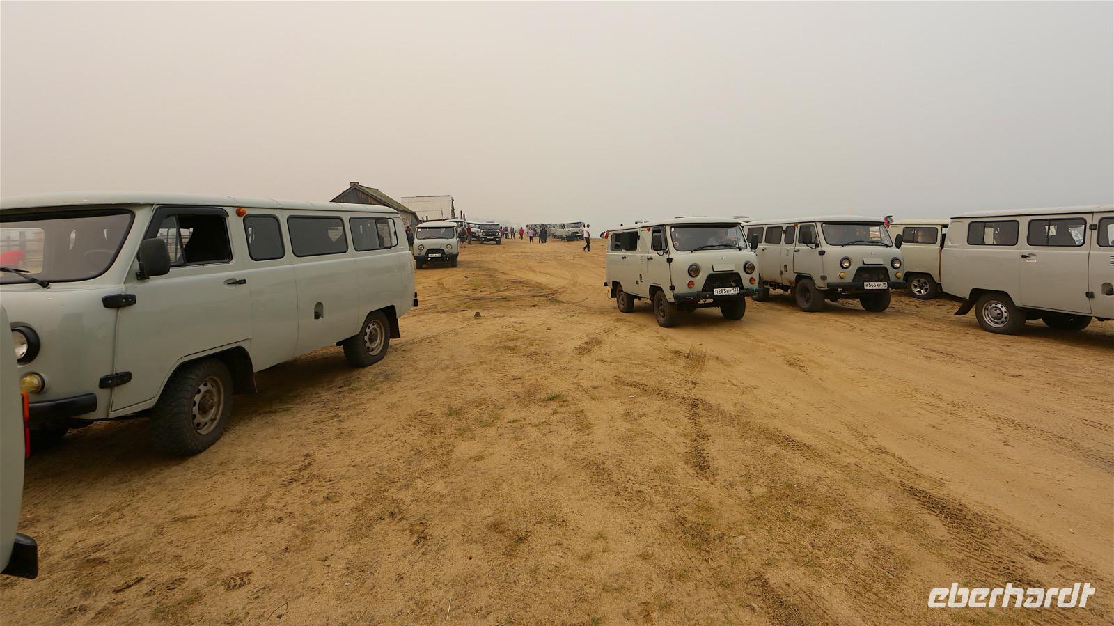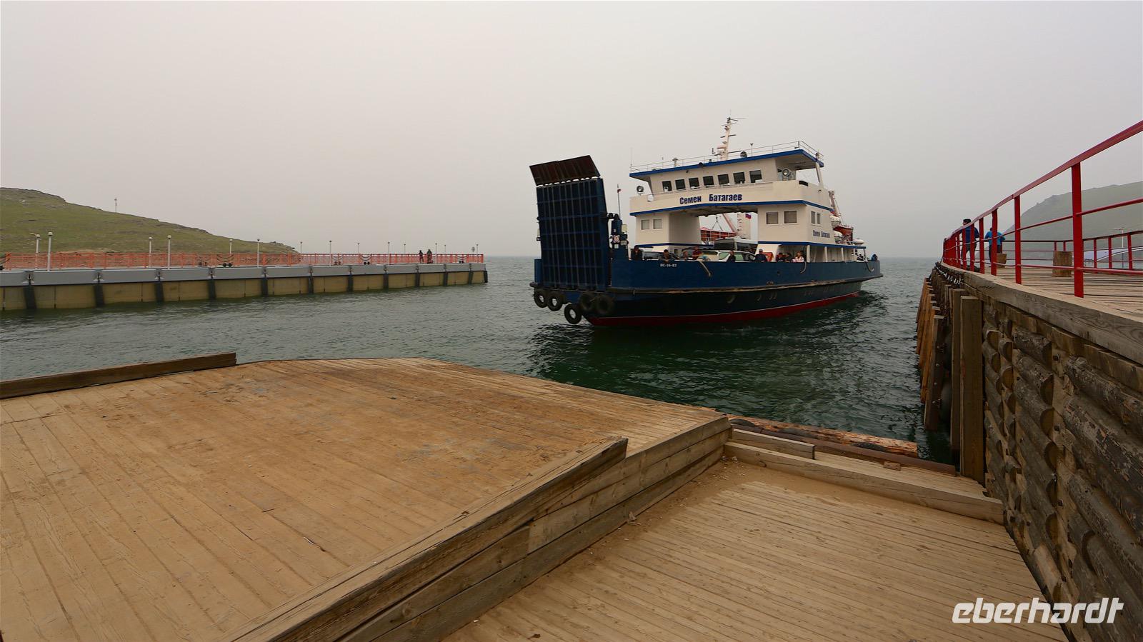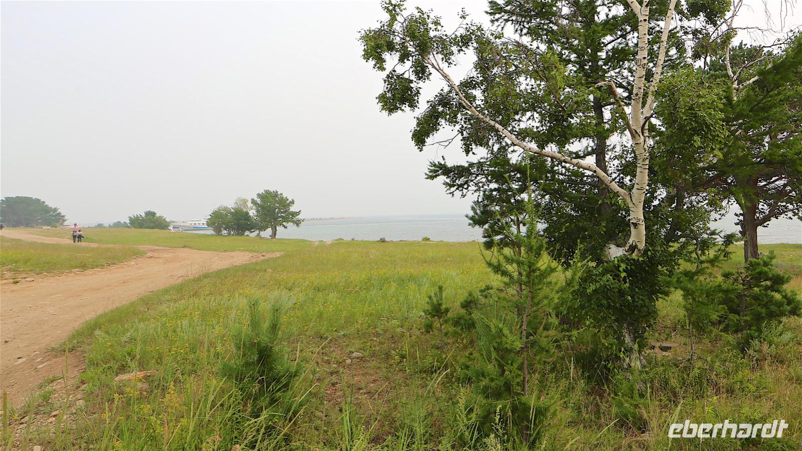 Als auf der Weiterfahrt zum Olchon der Regen langsam aufhört, bleibt es nebelig. Geruch, wie von einem Lagerfeuer, macht sich breit. Er wird stärker, je näher wir dem Olchon kommen. Von der Fähre sind das andere Ufer und die Küstenlinien von Insel und Festland nicht zu erkennen. Die Sicht gibt den Blick kaum über 100 m frei. Erst später erfahren wir, dass die sibirischen Wälder etwa 400 km nördlich von uns auf einer Fläche von etwa 3 Millionen Hektar brennen. Nun werfen Nebel und Rauch Schatten auf unser Programm und verdecken Sonne, Baikal und Landschaft.