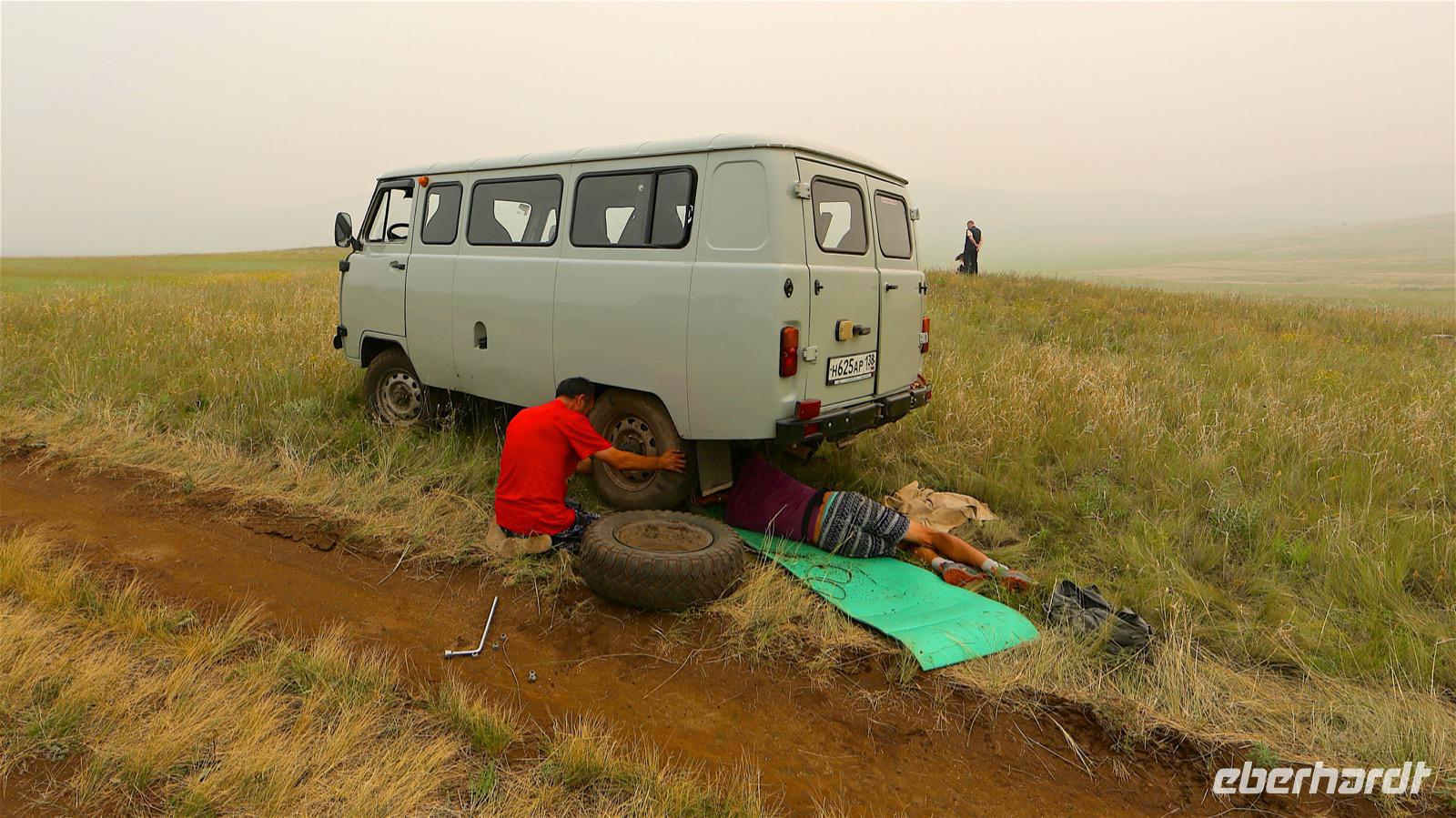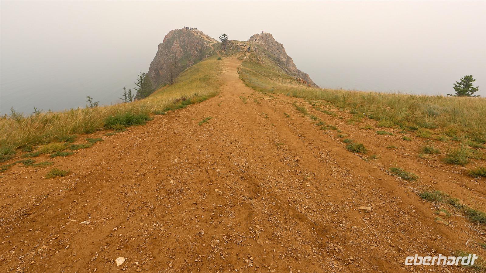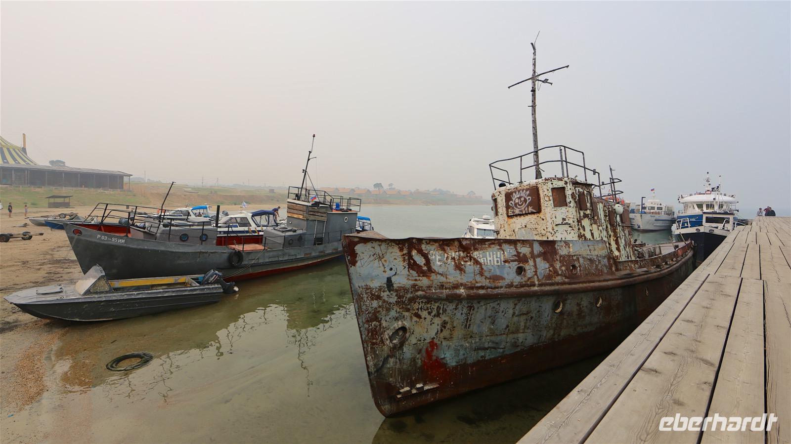 Als auf der Weiterfahrt zum Olchon der Regen langsam aufhört, bleibt es nebelig. Geruch, wie von einem Lagerfeuer, macht sich breit. Er wird stärker, je näher wir dem Olchon kommen. Von der Fähre sind das andere Ufer und die Küstenlinien von Insel und Festland nicht zu erkennen. Die Sicht gibt den Blick kaum über 100 m frei. Erst später erfahren wir, dass die sibirischen Wälder etwa 400 km nördlich von uns auf einer Fläche von etwa 3 Millionen Hektar brennen. Nun werfen Nebel und Rauch Schatten auf unser Programm und verdecken Sonne, Baikal und Landschaft.