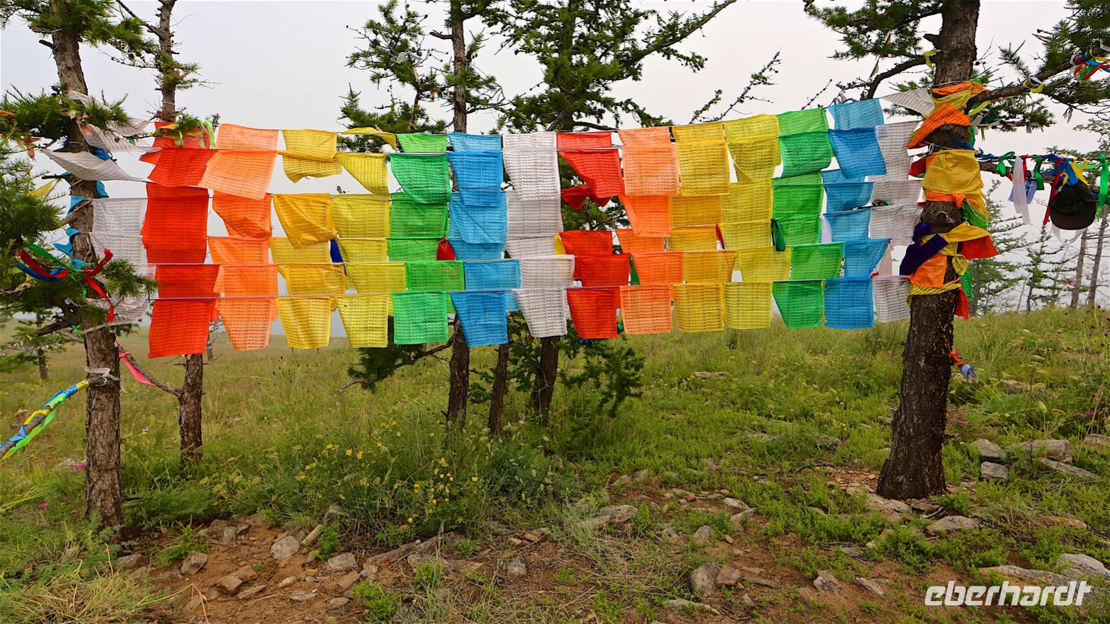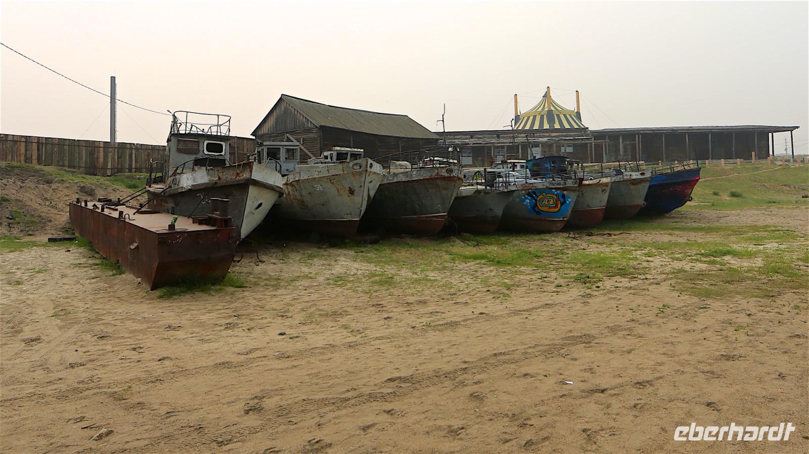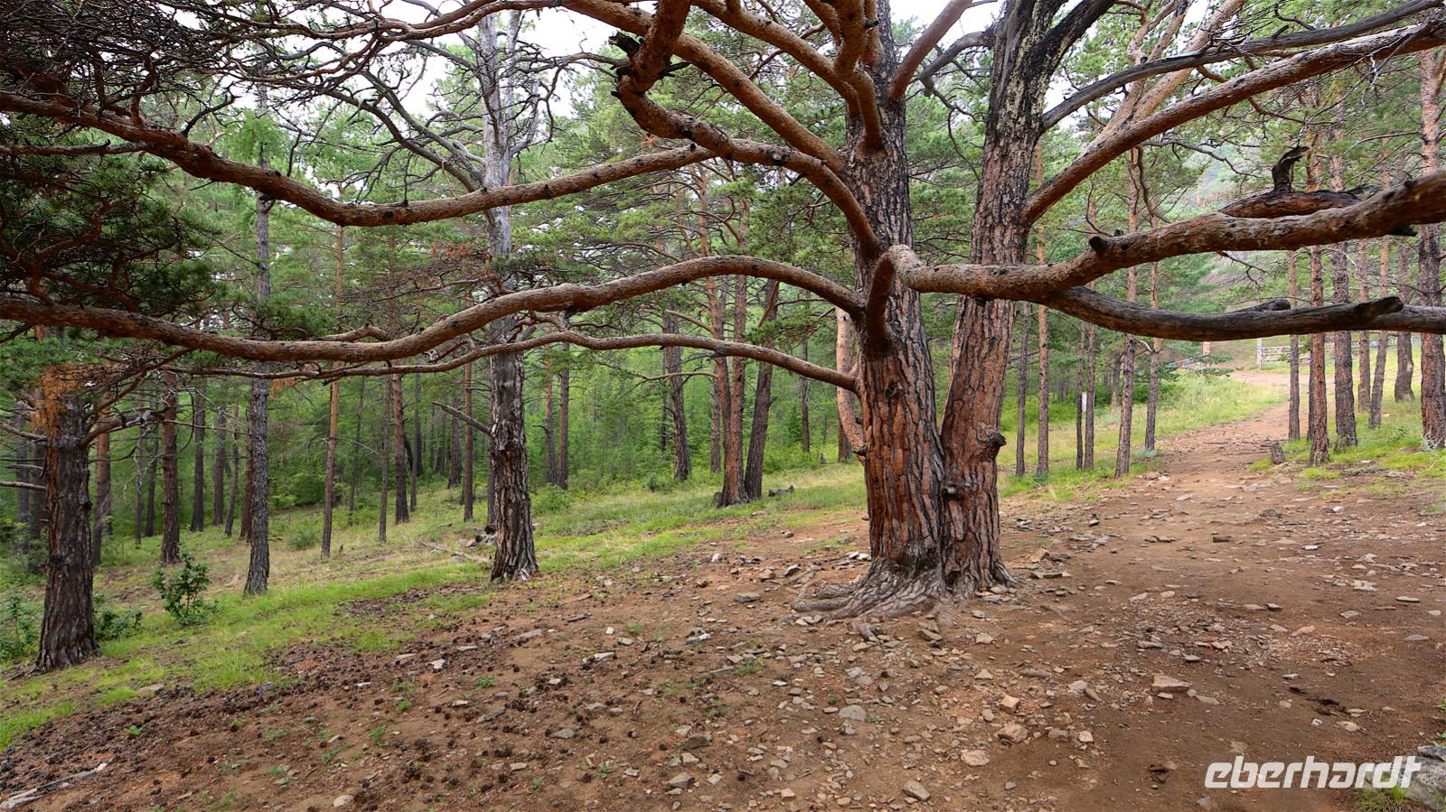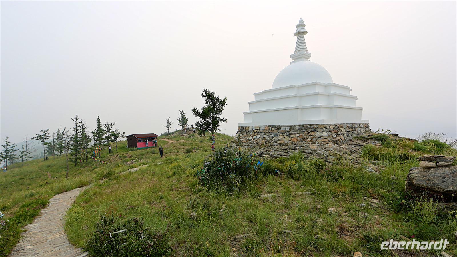 Die Insel Ogoj ist ein recht unscheinbares Eiland, eine buddhistische Stupa hat sie zum Wallfahrtsort und zur Touristenattraktion gemacht. Wir wollen uns heute davon überzeugen. Zwei Motor-Yachten bringen uns am Morgen vom Chuschirer Hafen dorthin. Etwa eine Stunde dauert die Fahrt. Zu sehen ist wieder nicht viel. Aber es ist trocken. Die Sonne müht sich, den Dunst zu durchbrechen, erfolglos. Eine Gruppe von uns entdeckt unterwegs einige Baikalrobben und beobachtet sie. Wir haben weniger Glück. Auf der Insel gehen wir den Hügel hinauf zur Stupa. Auf die 108 empfohlenen Umrundungen, sie versprechen wohl Erfüllung und Zufriedenheit, verzichten wir, aus Zeitgründen. Mit den Yachten fahren wir anschliessend zum Festland, wo wir uns auf Wanderung zur Heiligen Quelle des großen Olchoner Schamanen Chamnai-Boo begeben. Anschliessend gibt es zum Mittag am Freiluftsitz an der Landestelle Salat und gegrilltes Hühnchen, Blini und Tee, bevor uns die die Boote zurück nach Chuschir bringen. Bis zum Abendessen und danach nutzen wir die Zeit für eigene Entdeckungen im Dorf.