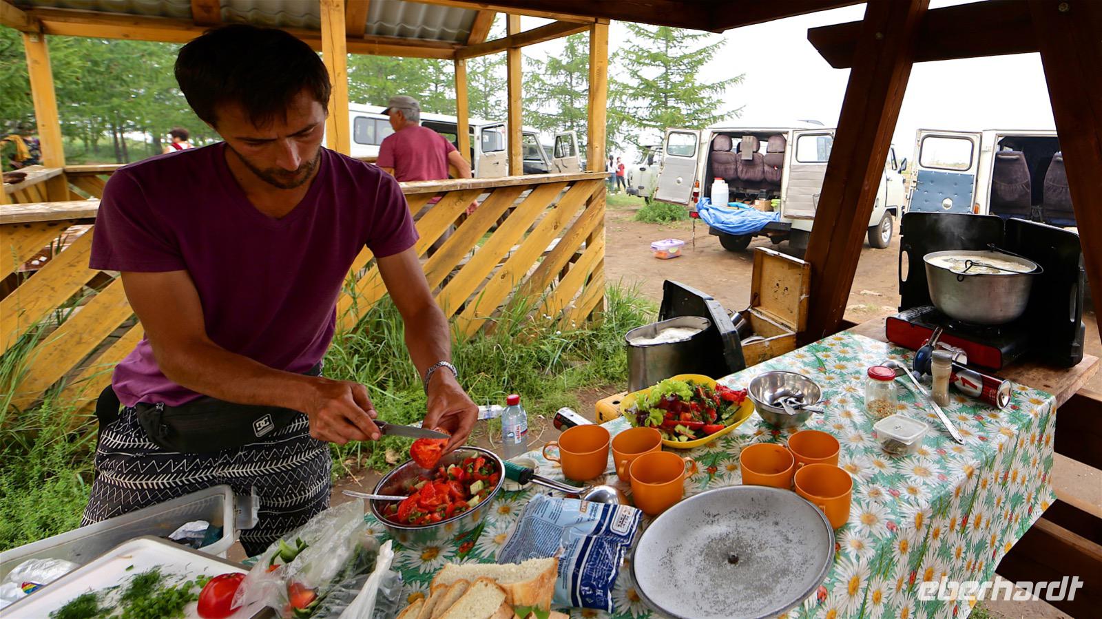 Die Fahrer sind geübt, die Begeisterung der Fahrgäste unterschiedlich. Wir halten am ehemaligen GULAG, es ist nicht viel zu sehen, weitere Stationen sind ein Strand, den wir auf dem Rückweg noch einmal zum Baden ansteuern wollen und die Felsengruppe der „Drei Brüder". Ein Fahrzeug hat eine Reifenpanne, die Fahrer bekommen das Problem innerhalb von etwa 30 Minuten gelöst. Schliesslich sind wir am Kap und brechen zu einer kleinen Wanderung auf. Die Sicht ist etwas besser geworden, Landschaft und das andere Ufer entziehen sich dennoch unseren Blicken. Die Fahrer machen sich an die Zubereitung des Mittagessens (Salat, Fischsuppe, Gebäck und Tee). Nach unsere Rundtour haben wir gut Appetit. Das Essen schmeckt allen. Es gibt auch wieder Wodka, diesmal gegen die schlechte Sicht.
