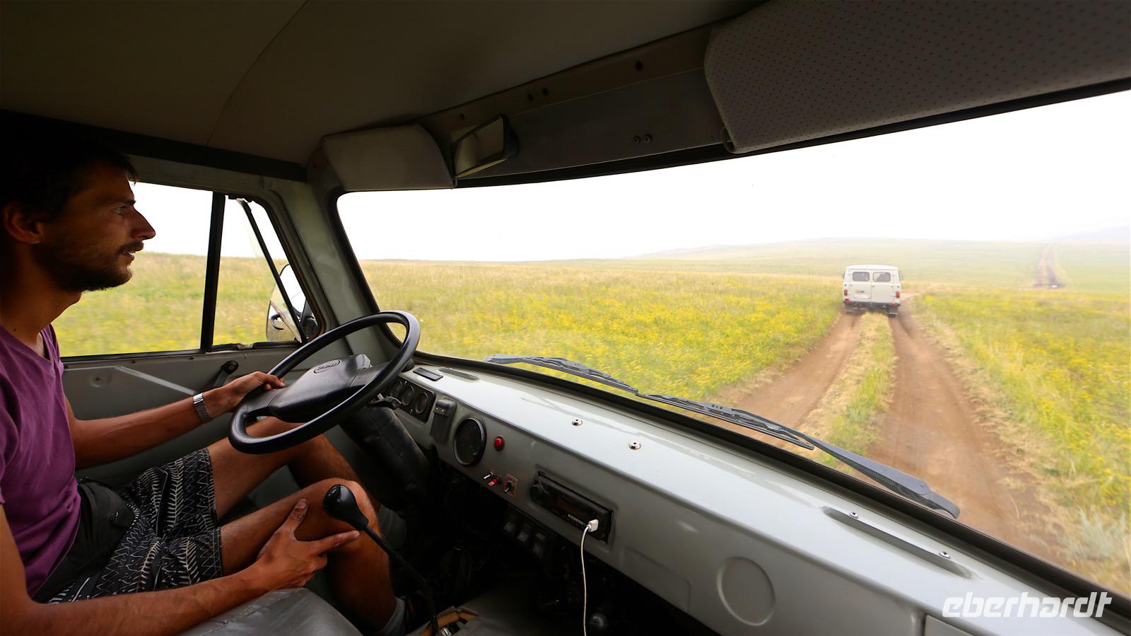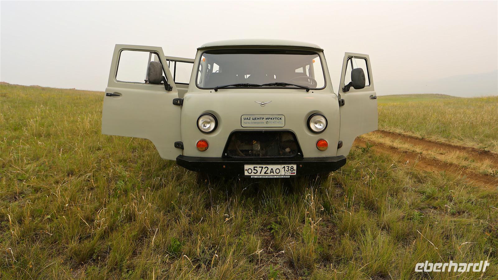 Noch einmal feiern wir Geburtstag. Wir gratulieren. Es gibt Schampanskoje und Schokolade. Draußen ist es diesig, sehr diesig, aber es ist warm. Unser Ausflug führt uns heute zum Nordkap (Kap Choboi). Wir fahren in den typischen UAZ Buchanka. Ein anderes Fahrzeug würde die wilde Strecke wohl kaum bewältigen.