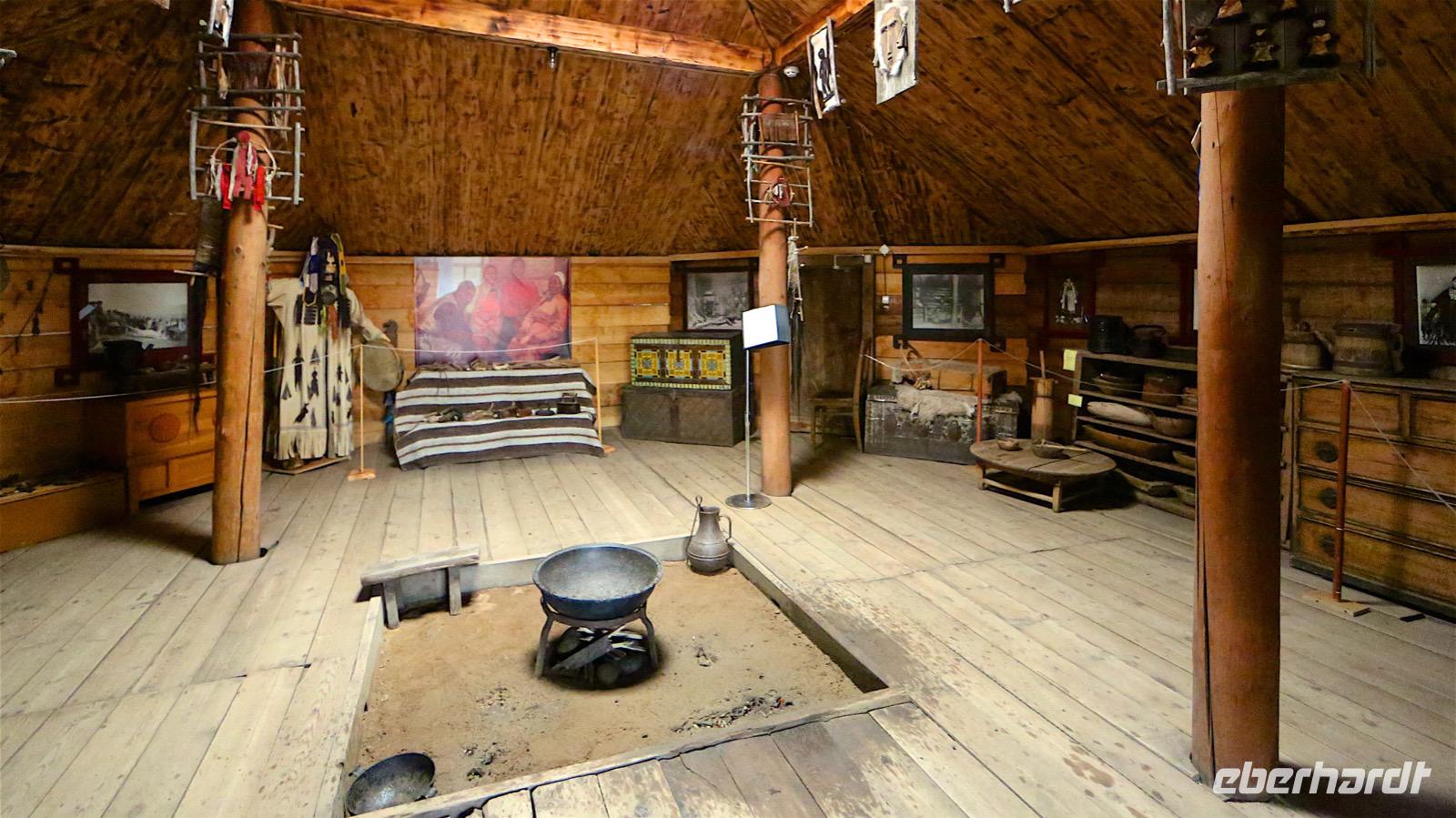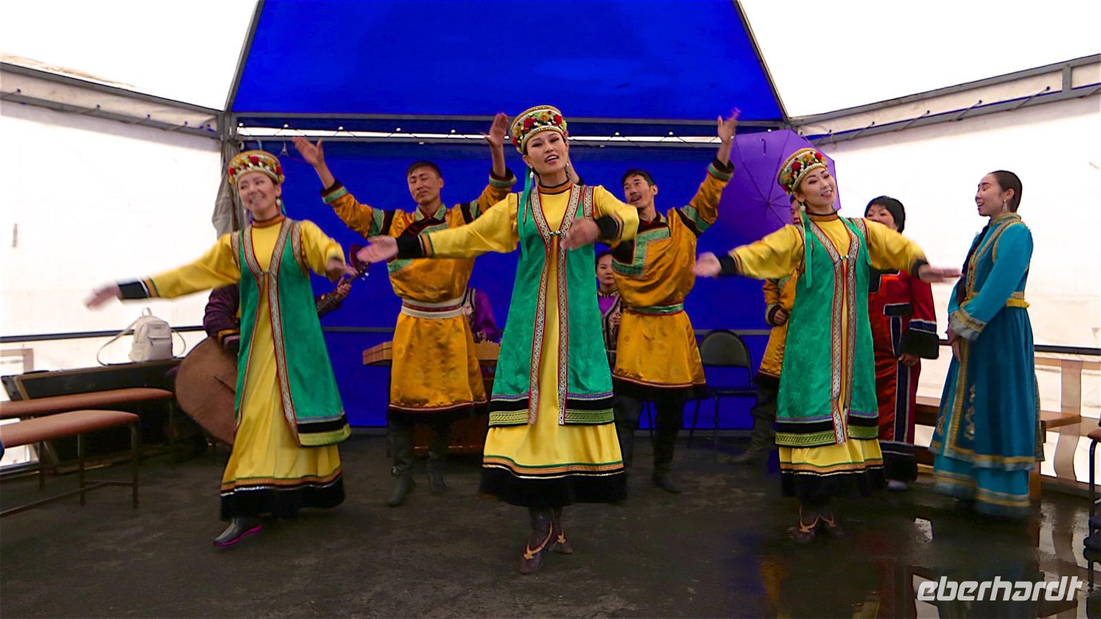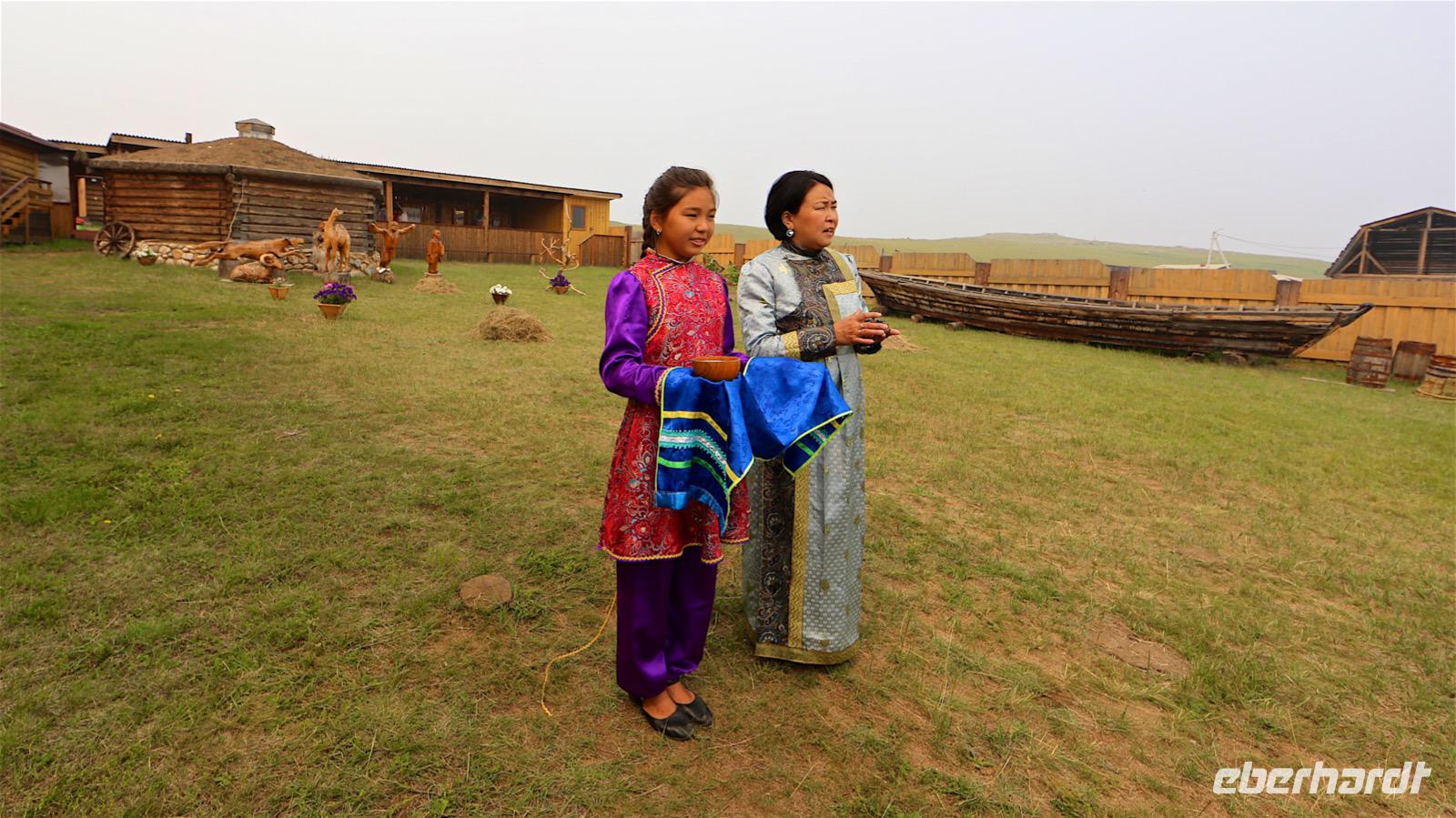 Heute geht es gewissermaßen ins Zentrum des Baikals. Wir wollen zum Olchon, der größten Insel des Sees und dort in den größten Ort der Insel, Chuschir. Unterwegs werden wir uns in Ustj Orda mit dem Schamanissmus der Westbaikalischen Burjaten vertrauter machen. Zwei Kleinbusse warten im Regen vor dem Hotel. Bis Ustj Orda gießt es pausenlos. Das Burjatendorf steht unter Wasser. Das volkstümliche Programm in Trachten und traditioneller Musik gefällt. Es macht uns nicht zuletzt erneut darauf aufmerksam, dass Russland ein Vielvölkerstaat ist, mit zahlreichen Kulturen, wie sie unterschiedlicher nicht sein können. Mittagessen gibt es in einer Art Jurtensiedlung, burjatische Küche natürlich.