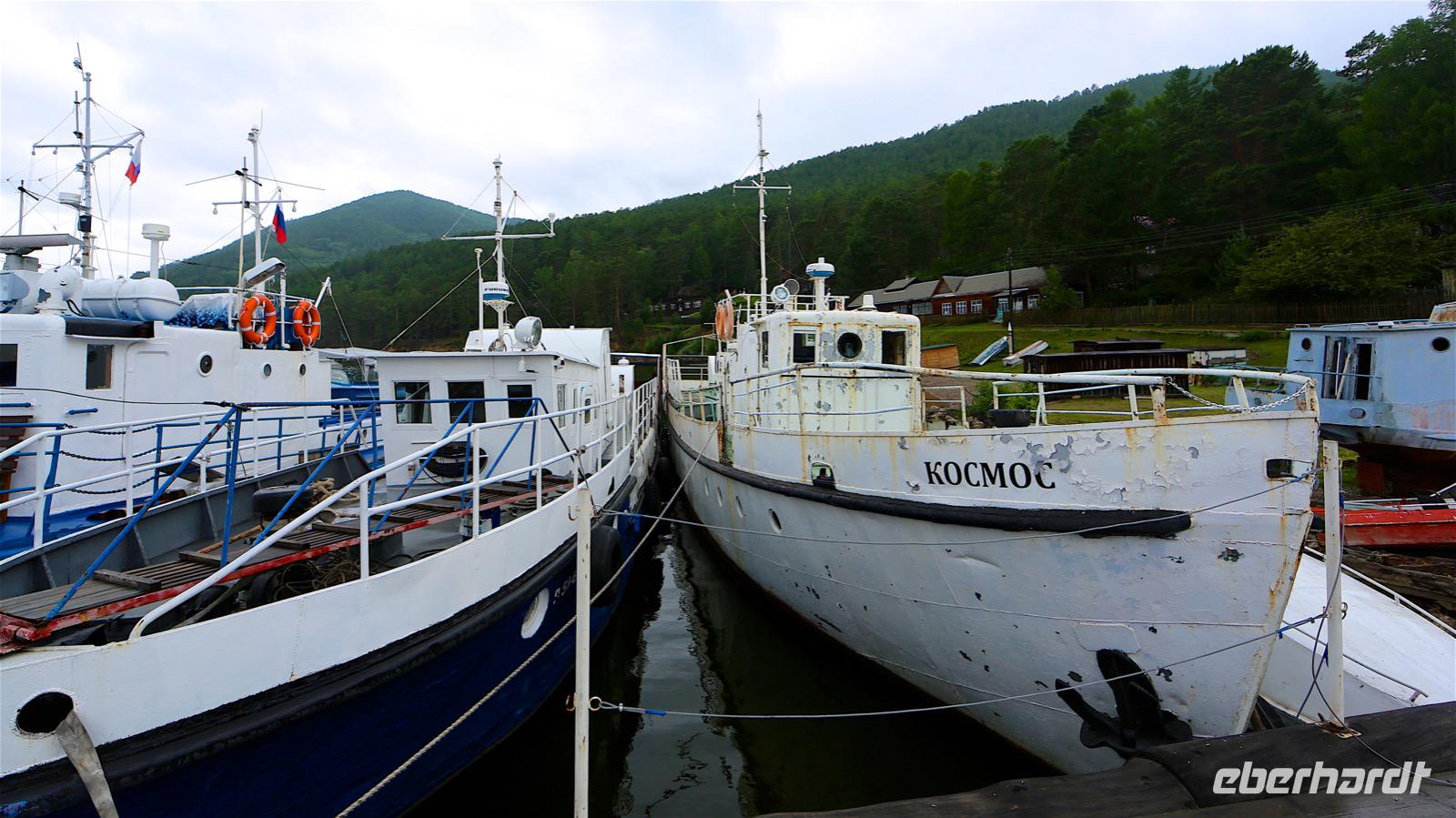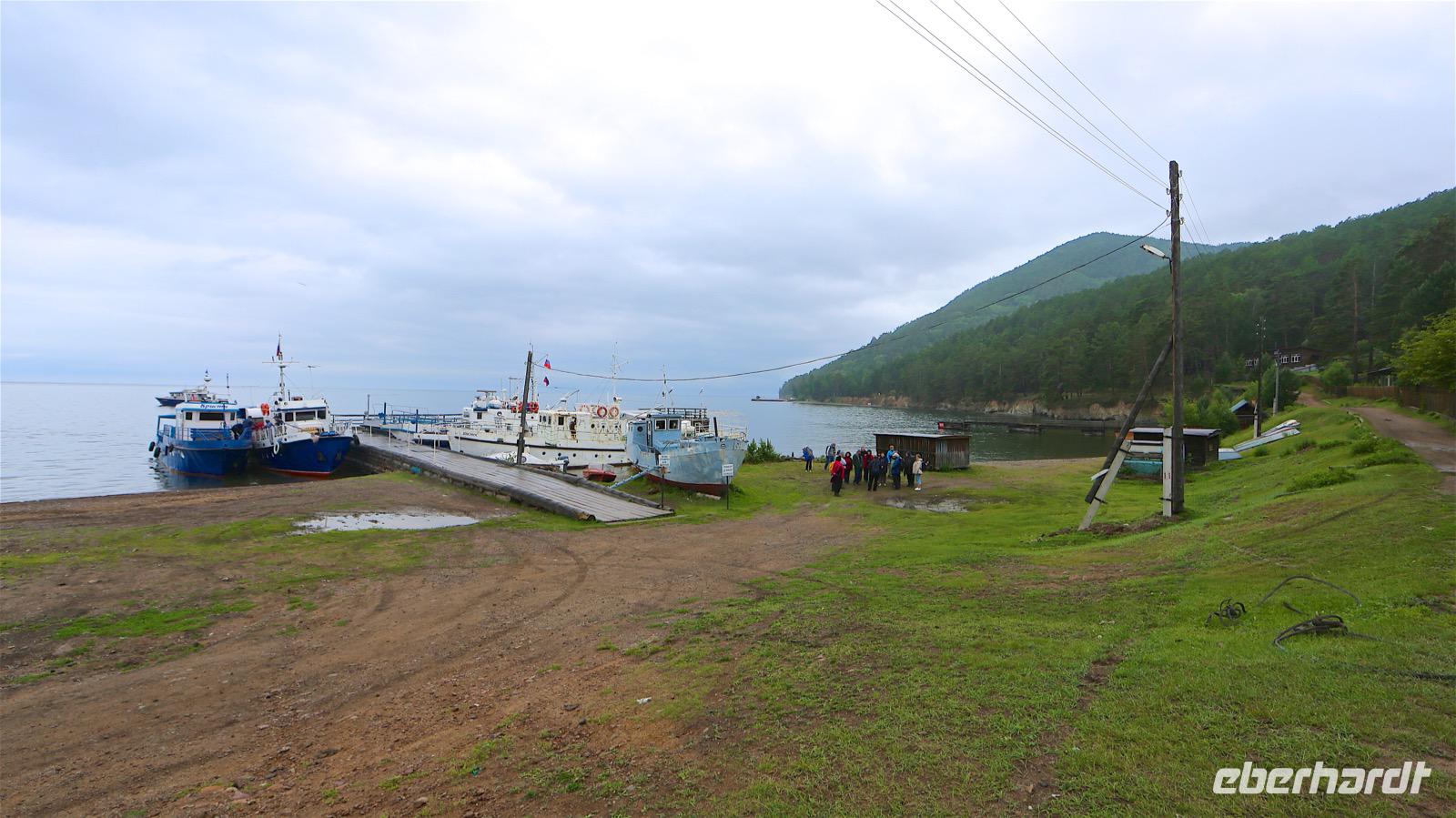 Es hat auch die ganze Nacht unablässig geregnet. Als wir uns am Morgen nach dem Frühstück zur Abfahrt versammeln, hat sich daran nichts geändert. Wir wollen mit den Schiff ins nahe Bolschie Koty, ein kleines Dorf am Baikalstrand, und zunächst mit dem Kleinbus zum Anleger. Um 10:00 Uhr legen wir mit zwei in die Jahre gekommenen, wahrscheinlich ehemaligen Fischereischiffen, ab. Als Schlechtwettervarianten gibt es Sitzplätze unter Deck oder unter einem Verdeck am Heck des Schiffes. Zu sehen ist nicht viel, stellenweise nimmt der Regen etwas ab und wir spazieren an Deck und erfreuen uns der Uferlandschaft, an der wir vorbeiziehen. Bolschie Koty empfangt uns im Dunst, es ist recht neblig, regnet jedoch nur verhalten. Wir entschliessen uns zu einem Spaziergang entlang des Ufer, die geplante Wanderung auf die Höhenzüge, lässt die Witterung leider nicht zu. Bald setzt der Regen wieder heftig ein und zwingt uns zum Rückzug. Wir unternehmen noch einen kurzen Rundgang und wollen früher zur Datscha, auf der wir heute erwartet werden, gehen. Kurz tauchen wir noch ins russische Dorfleben ein, einige historische oder auch nur betagte Holzhäuser, Banja, Strand, örtliches Geschäft, ländliche Siedlung und Kappelle. Dann sind wir auf der Datscha, Tatjana, unsere Gastgeberin erwartet uns bereits. Wir freuen uns über die trockenen Räumlichkeiten und genießen die von Tatjana bereiteten Köstlichkeiten.
