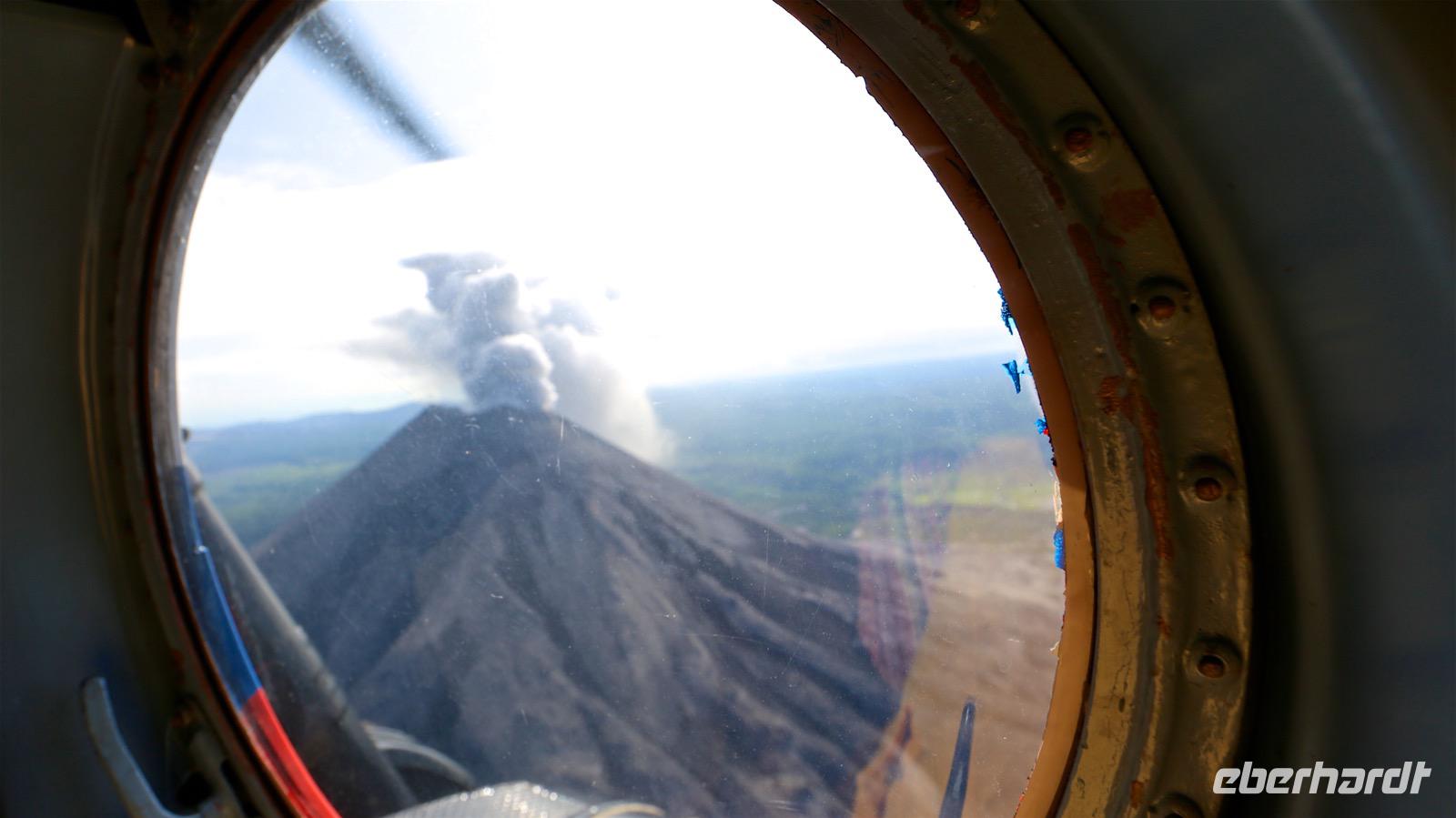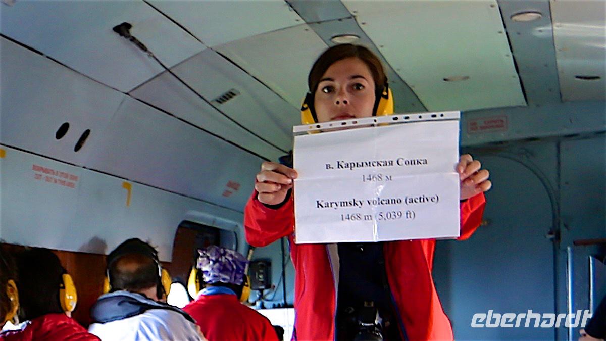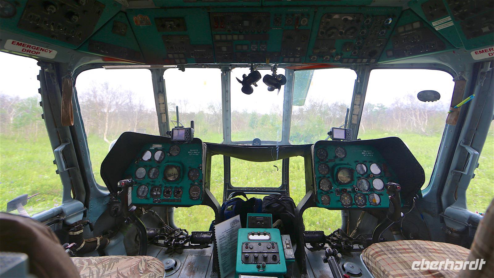Die Qual der Wahl stand für alle Reiseteilnehmer, das Programm dieses Tages betreffend. Bereits vor Anreise war die Frage zu entscheiden, den Geysiren Kamtschatkas einen Besuch abstatten oder die grandiose, der Hauptstadt vorgelagerte Avacha-Bucht zu erkunden und mit ihr ein Stück des Pazifischen Ozeans und seiner Bewohner. Der überwiegende Teil unserer Gruppe hatte sich für die heißen Gewässer entschieden. Zwei wollen auf eigene Faust die nähere Umgebung des Hotels erkunden. Zunächst jedoch beginnt unser erster vollständiger Tag auf der Halbinsel mit dem Frühstück in unserem Hotel. Das Antarius ist ein einfaches, aber sehr sauberes Hotel mit dem Komfort der Mittelklasse. Geschlafen haben die meisten gut, die Zeitumstellung machte nur wenigen zu schaffen. Zum Frühstück um 07:00 Uhr jedenfalls waren alle guter Dinge. Gut gestärkt starten bei heiterem Wetter zunächst die Seefahrer. Um 08:00 Uhr verlässt der Bus das Hotelgelände. Um 08:30 Uhr ist Abfahrt zu den Geysiren. Ein Hubschrauber der Vityaz Aero soll uns vom nahen Flugplatz in das knapp 200 km entfernte Tal der Geysire bringen. Etwa 15 Minuten dauert die Fahrt zum Startplatz. Die meisten von uns haben bis dato Hubschrauber lediglich von aussen und aus der Entfernung gesehen. Dementsprechend sind wir gespannt und voller Erwartungen. Wie an jedem Flughafen bringt uns ein Bus über das Rollfeld zu einem der vielen mit Kamtschatka-Motiven verzierten MI8. Zweiundzwanzig Passagiere kann dieser aufnehmen. Allenfalls spartanisch ist die Ausstattung zu nennen. Beim Zustieg scheinen einige beunruhigt, ihre Gesichter spiegeln so etwas zwischen Ärger und schauriger Ergriffenheit. Eine aufkommende Kontroverse zu den besten Sitzplätzen legt sich schnell und ist bereits wenige Minuten nach dem Start buchstäblich verflogen. Die Geräuschkulisse im Fluggerät erinnert an die einer Maschinenhalle. Wir sind mit Gehörschutzkapseln ausgestattet, die Kommunikation ist auf Gesten und Blicke beschränkt. Die recht großen Bullaugen geben die Sicht auf eine großartige Landschaft frei und mit jedem Kilometer wird sie spektakulärer.
