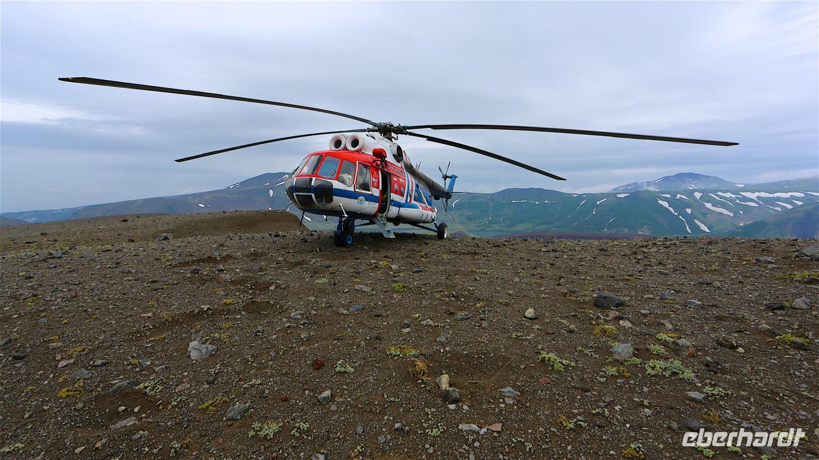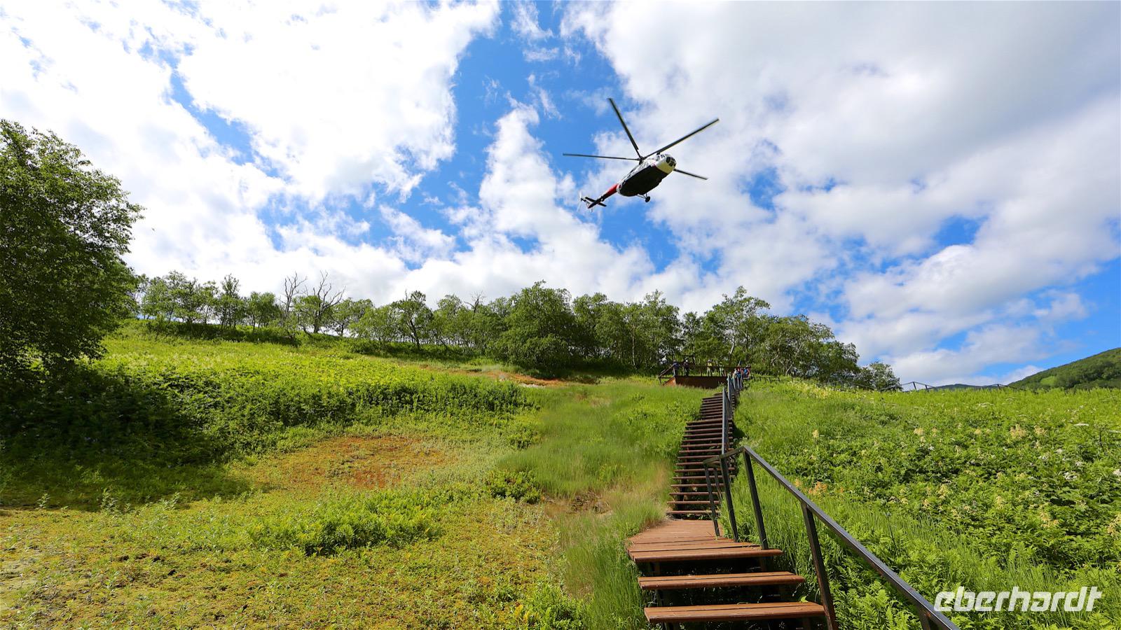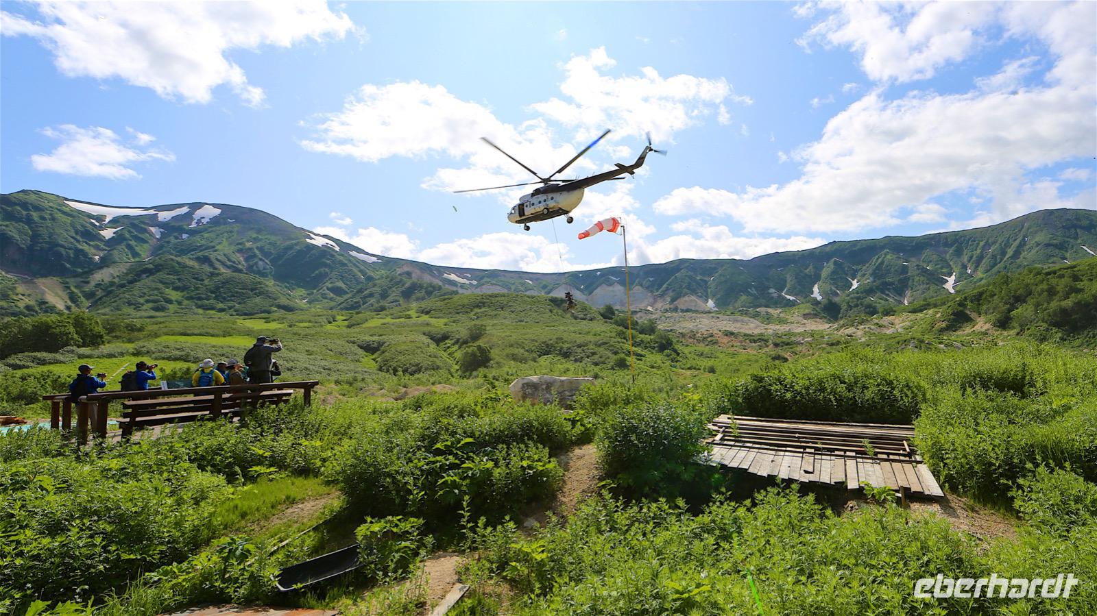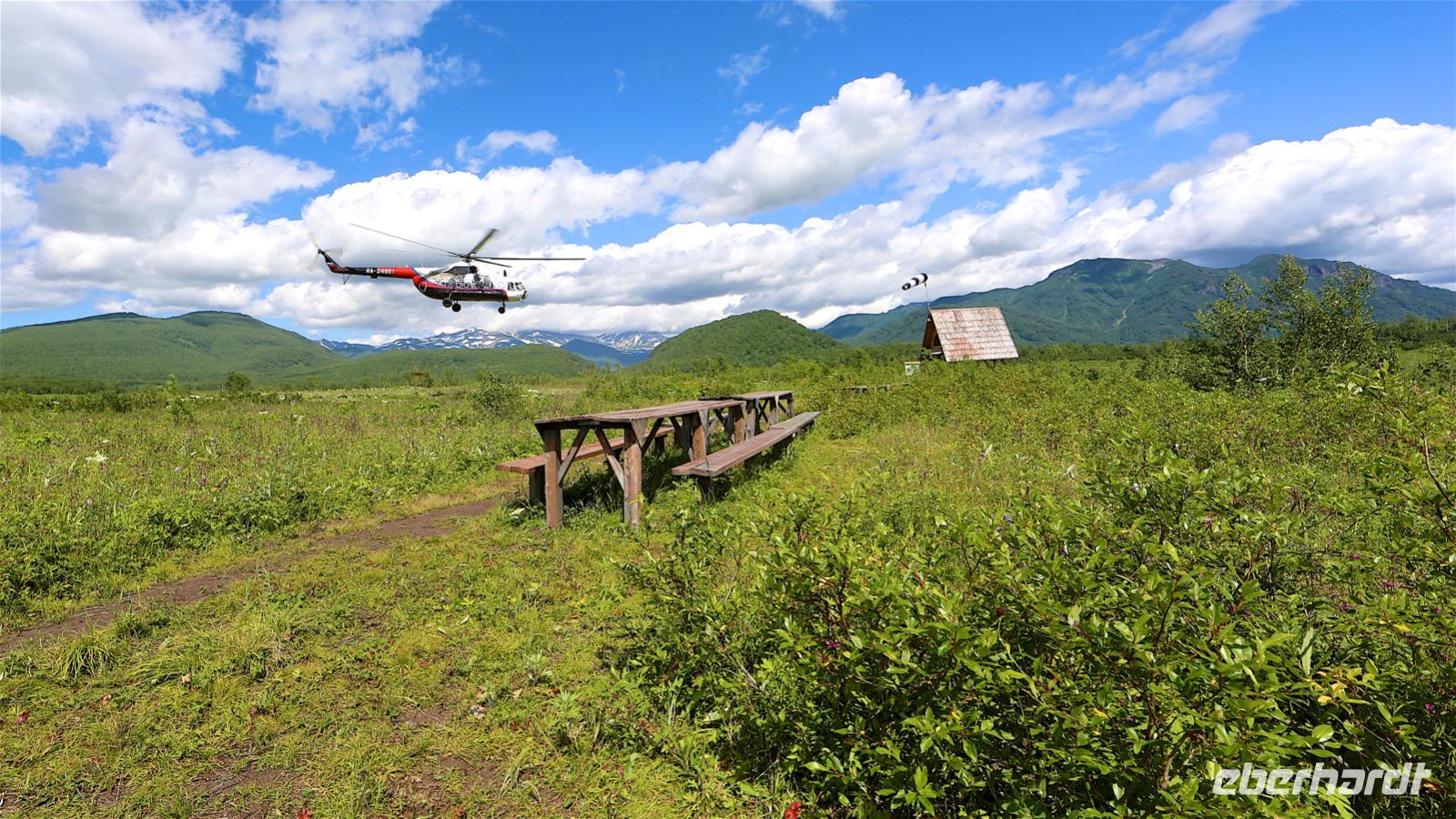 Nach dem Essen fliegen wir mit dem Hubschrauber weiter, zunächst auf den Gipfel eines Vulkans, anschliessend zu einem Thermalsee, der Gelegenheit zum Bade bieten soll. Heute allerdings hält sich die Begeisterung in Grenzen, dem Wetter wäre wohl noch zu trotzen, den dank der Feuchte überaus zahlreichen Mücken allerdings geben sich auch die letzten Badeenthusiasten schließlich geschlagen. Sergej, unser Pilot, hat vorsorglich beim Verlassen des Hubschraubers einige Rauchkerzen im Cockpit gezündet, um auch den Weiterflug mückenfrei absolvieren zu können. Gegen 17.00 Uhr sind wir schließlich wieder auf dem Flugplatz und werden bereits erwartet von unserer Wachtowka, die uns zur Schlittenhundefarm bringen soll.