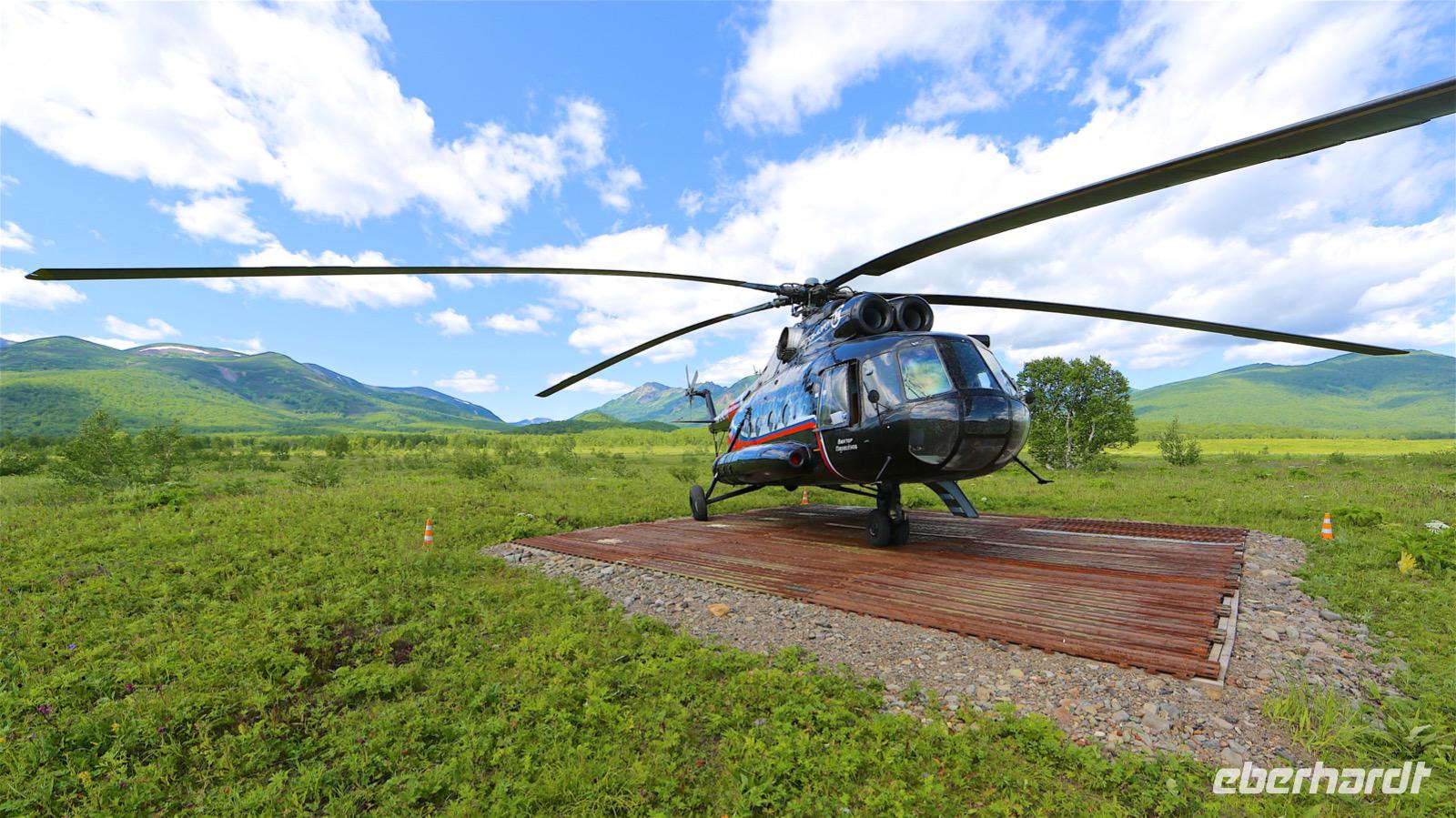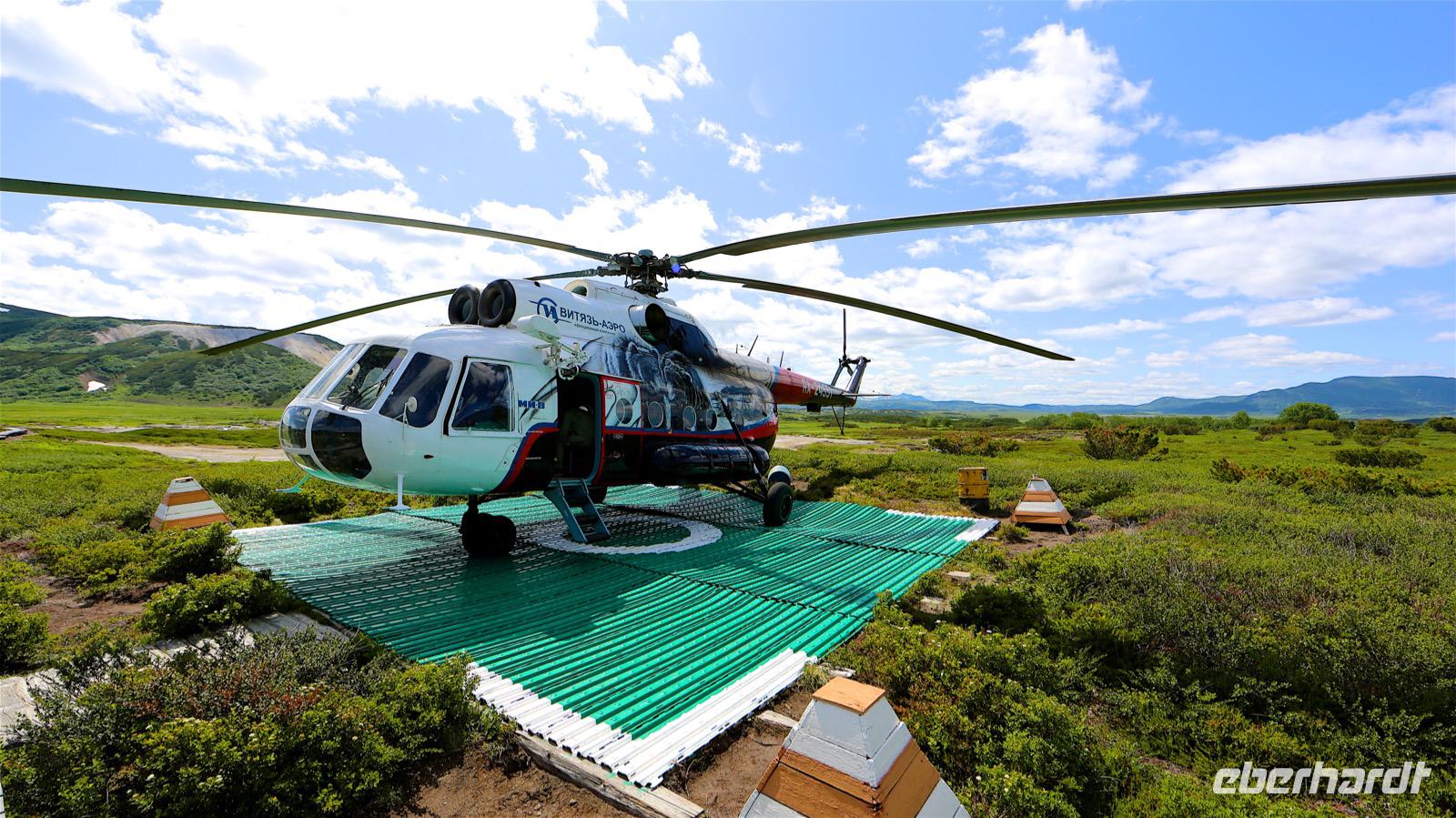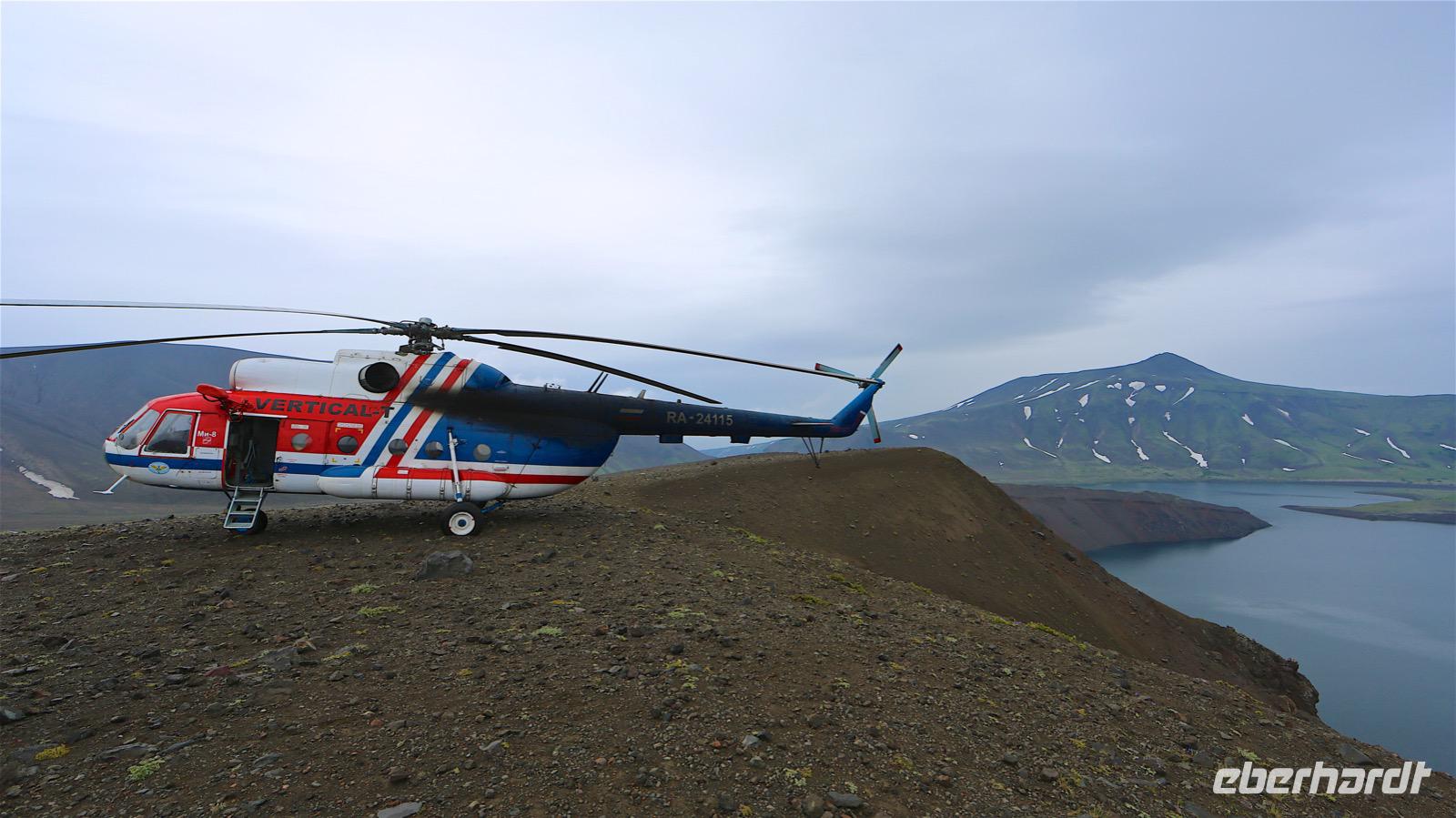 Nach dem Essen fliegen wir mit dem Hubschrauber weiter, zunächst auf den Gipfel eines Vulkans, anschliessend zu einem Thermalsee, der Gelegenheit zum Bade bieten soll. Heute allerdings hält sich die Begeisterung in Grenzen, dem Wetter wäre wohl noch zu trotzen, den dank der Feuchte überaus zahlreichen Mücken allerdings geben sich auch die letzten Badeenthusiasten schließlich geschlagen. Sergej, unser Pilot, hat vorsorglich beim Verlassen des Hubschraubers einige Rauchkerzen im Cockpit gezündet, um auch den Weiterflug mückenfrei absolvieren zu können. Gegen 17.00 Uhr sind wir schließlich wieder auf dem Flugplatz und werden bereits erwartet von unserer Wachtowka, die uns zur Schlittenhundefarm bringen soll.