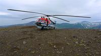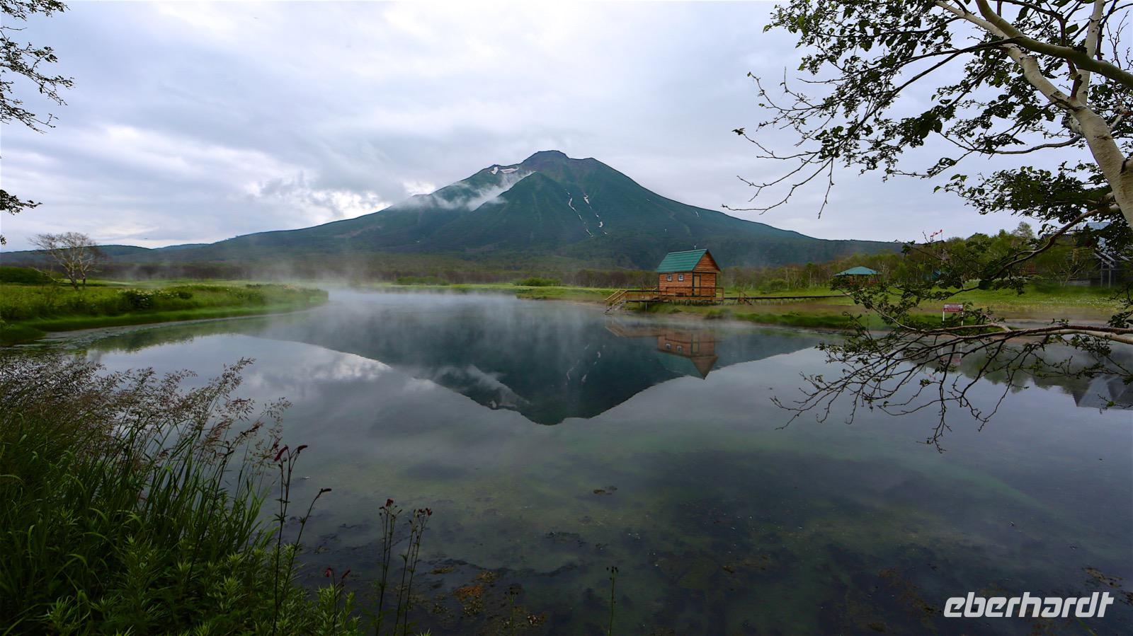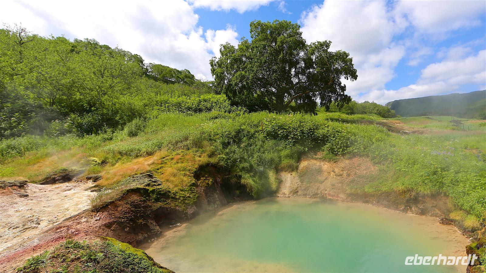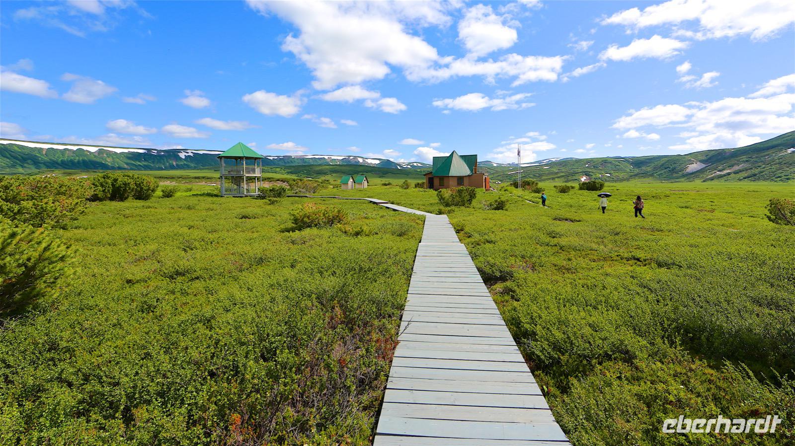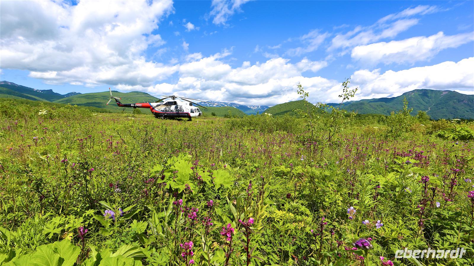 Nach dem Essen fliegen wir mit dem Hubschrauber weiter, zunächst auf den Gipfel eines Vulkans, anschliessend zu einem Thermalsee, der Gelegenheit zum Bade bieten soll. Heute allerdings hält sich die Begeisterung in Grenzen, dem Wetter wäre wohl noch zu trotzen, den dank der Feuchte überaus zahlreichen Mücken allerdings geben sich auch die letzten Badeenthusiasten schließlich geschlagen. Sergej, unser Pilot, hat vorsorglich beim Verlassen des Hubschraubers einige Rauchkerzen im Cockpit gezündet, um auch den Weiterflug mückenfrei absolvieren zu können. Gegen 17.00 Uhr sind wir schließlich wieder auf dem Flugplatz und werden bereits erwartet von unserer Wachtowka, die uns zur Schlittenhundefarm bringen soll.