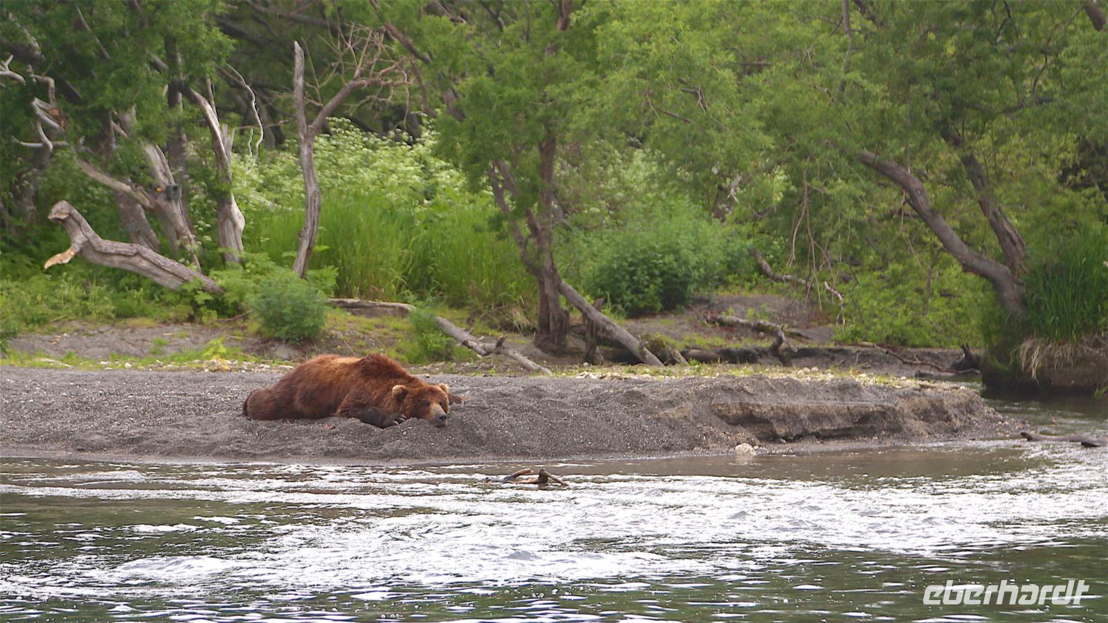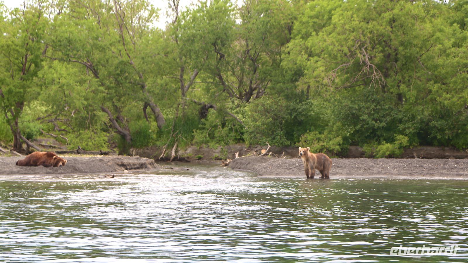 07:15 Uhr Frühstück, 08:00 Uhr Abfahrt zum Flughafen, ausgesprochen trübes und regnerisches Wetter, die Vulkane sind nicht zu sehen - ein uns inzwischen geläufiges Szenario. Jedoch heute kann unser Flug stattfinden. Er dauert deutlich länger als avisiert, wir umfliegen offensichtlich zahlreiche Schlechtwettergebiete, zum Teil ist nichts zu sehen, wie sich die Piloten orientieren bleibt ein Rätsel. Zuweilen schüttelt es recht kräftig, die Felszeichnungen der Vulkane scheinen auf den ein oder anderen Insassen übergegangen zu sein. Doch schnell schlägt die Versteinerung in Begeisterung um, als beim Landeanflug die ersten Bären durch die Bullaugen des Hubschraubers entdeckt werden. Am Besucherzentrum regnet es. Es ist zudem recht kühl.