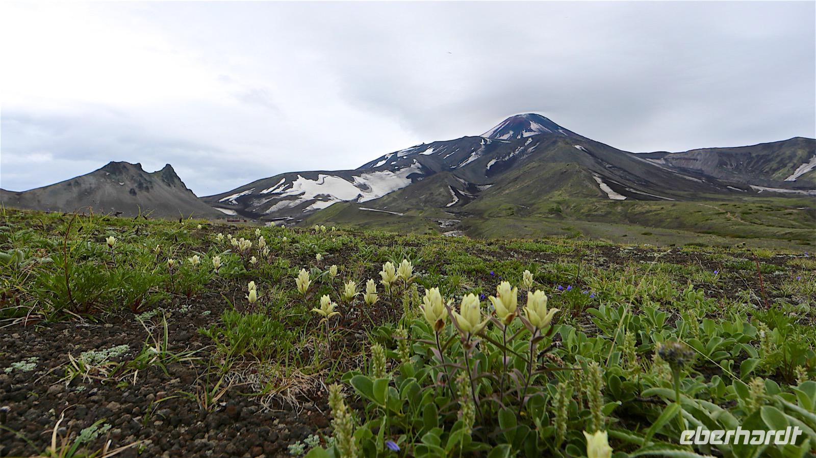 Leider können wir auch um 11:00 Uhr nicht starten und beschliessen nun, zu Besichtigungen nach Petropawlowsk zu fahren und im Fall einer Startfreigabe zurückzukehren. Wir steigen in den Bus und fahren zur Petropawlowsker Kathedrale zur Hl. Dreifaltigkeit. Der imposante Kirchenbau ist 2010 geweiht worden. Wir haben von dort eine sehr schöne Sicht auf Stadt und Vulkane. Anschliessend fahren wir zum Mittagessen und müssen dort zur Kenntnis nehmen, dass wir heute nicht mehr fliegen werden. Wir disponieren um und verlegen kurzerhand das eigentlich für den nächsten Tag geplante Programm auf den heutigen Nachmittag. Es gelingt - und so fahren wir nach dem Essen mit der Wachtowka zum Fuß des Avacha-Vulkans. Unterwegs steigt Victor, unser Bergführer, zu. Auf der Fahrt regnet es beständig, wir machen dennoch einen Fotostopp, der Avacha selbst ist jedoch inzwischen wieder tief in Wolken gehüllt. Nach Ankunft am Besucherzentrum versuchen wir mit Victor eine Wanderung in Richtung Avacha. Der Regen hat fast aufgehört und lässt uns zufrieden Landschaft und Vegetation betrachten. Zum Abendessen werden wir um 18:00 Uhr im Besucherzentrum erwartet, alle sind inzwischen in guter Stimmung, ganz ohne den Wodka, den ich zur Bekämpfung der Folgen der Witterungsunbilden zuvor organisiert hatte. Er erfreut sich trotzdem bester Beliebtheit. Gegen 20:30 Uhr sind wir wieder in unserem Hotel.
