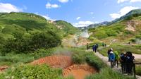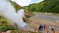 Der nächste Flugabschnitt bringt uns nach bereits 20 Minuten zum riesigen Krater eines ehemaligen Vulkans. Die verschiedensten Landschaften haben sich hier herausgebildet, heiße und kalte Gewässer, Schwefelquellen, Schlammvulkane - es blubbert und wabert auch hier allerorten. Wir sind beeindruckt. Auch den Bären scheint's zu gefallen, anders als wir dürfen sie von den vorgezeichneten Wegen abweichen - heute sehen wir jedoch lediglich ihre Fußspuren. Dann geht es weiter mit dem MI8 zu einer weiteren heißen Quelle. Man darf auch baden, einige tun dies ausgiebig, die meisten jedoch nur mit den Füßen. Auf einer langen Tafel wird uns ein Mittagessen serviert, welches allen inmitten der üppigen Vegetation der Hochebene mit Blick auf Avacha und andere Vulkane bestens mundet. Anschließend fliegen wir zurück und sind gegen 17:00 Uhr zurück im Hotel. Die zwei im Hotel verbliebenen schildern uns mit Begeisterung ihr Erlebnis mit der russischen Gastfreundschaft. Von der Straße weg eingeladen, haben sie fast den ganzen Tag bei Einheimischen verbracht. Die Seefahrer berichten über ihre Erfolge beim Fischfang, die Begegnungen mit Robben und Seevögeln. Zu Abend essen wir im Hotel. In einer „Vorstellungsrunde" erfahren wir voneinander zu unseren Motiven, gerade an dieser Reise teilzunehmen.